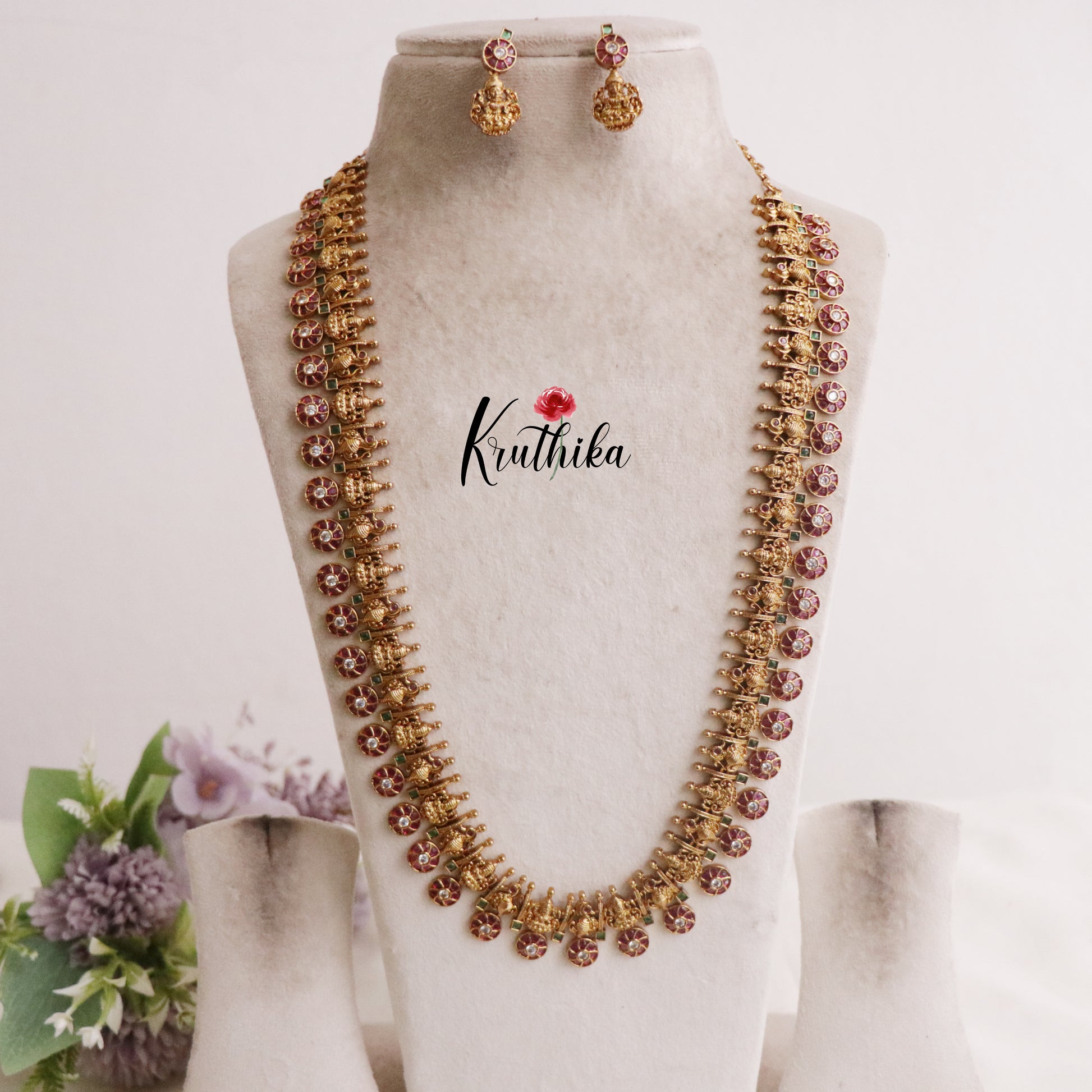 Enhance your style with our stunning, Premium Antique Kemp Kasu Haaram Crafted with high-quality stones & beads, this set combines timeless elegance with a modern touch. Ideal for special occasions or adding a touch of glamour to your look.