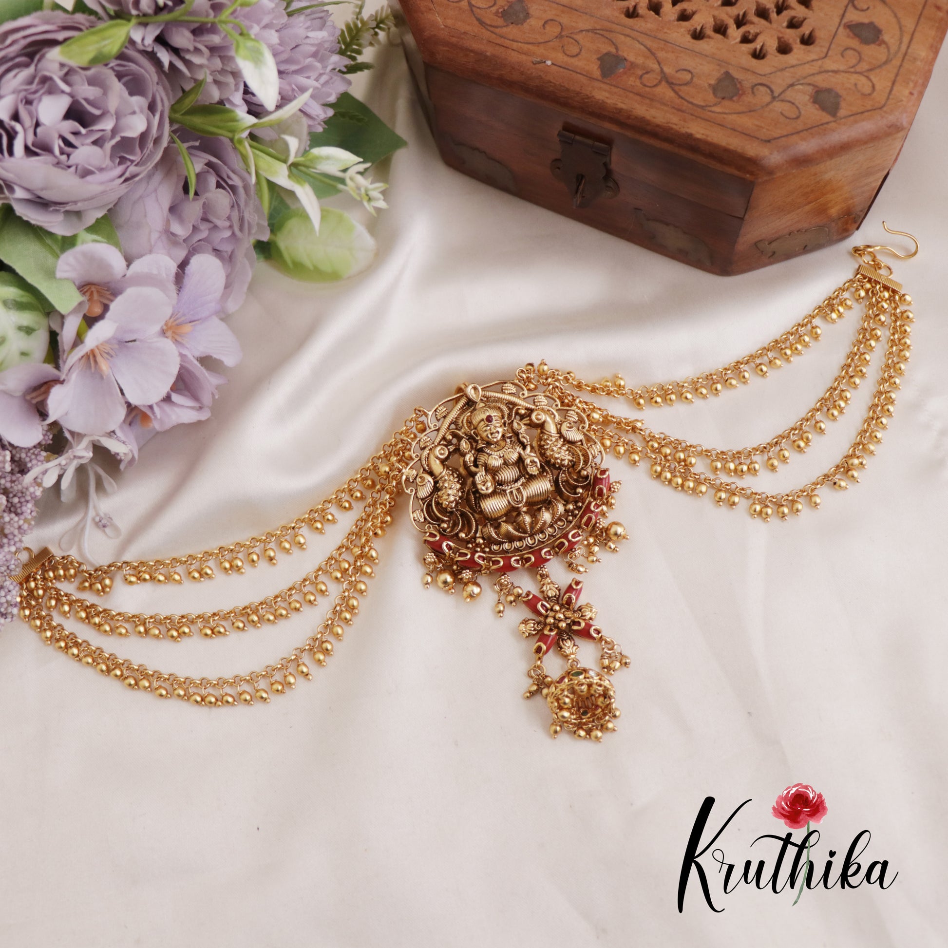 This premium Jada Billa is a masterful blend of traditional artistry and divine symbolism. At its heart lies a crafted Temple Jewelry centrepiece featuring Lakshmi, symbolising prosperity and grace, bordered by delicate red enamel work reminiscent of precious coral. The design is elevated by three tier gold bead chains that sweep elegantly to the sides, while a jhumka drop adds rhythmic movement. Perfect for bridal wear or festive occasions, this piece brings a regal, heritage-inspired charm to any traditional braid.