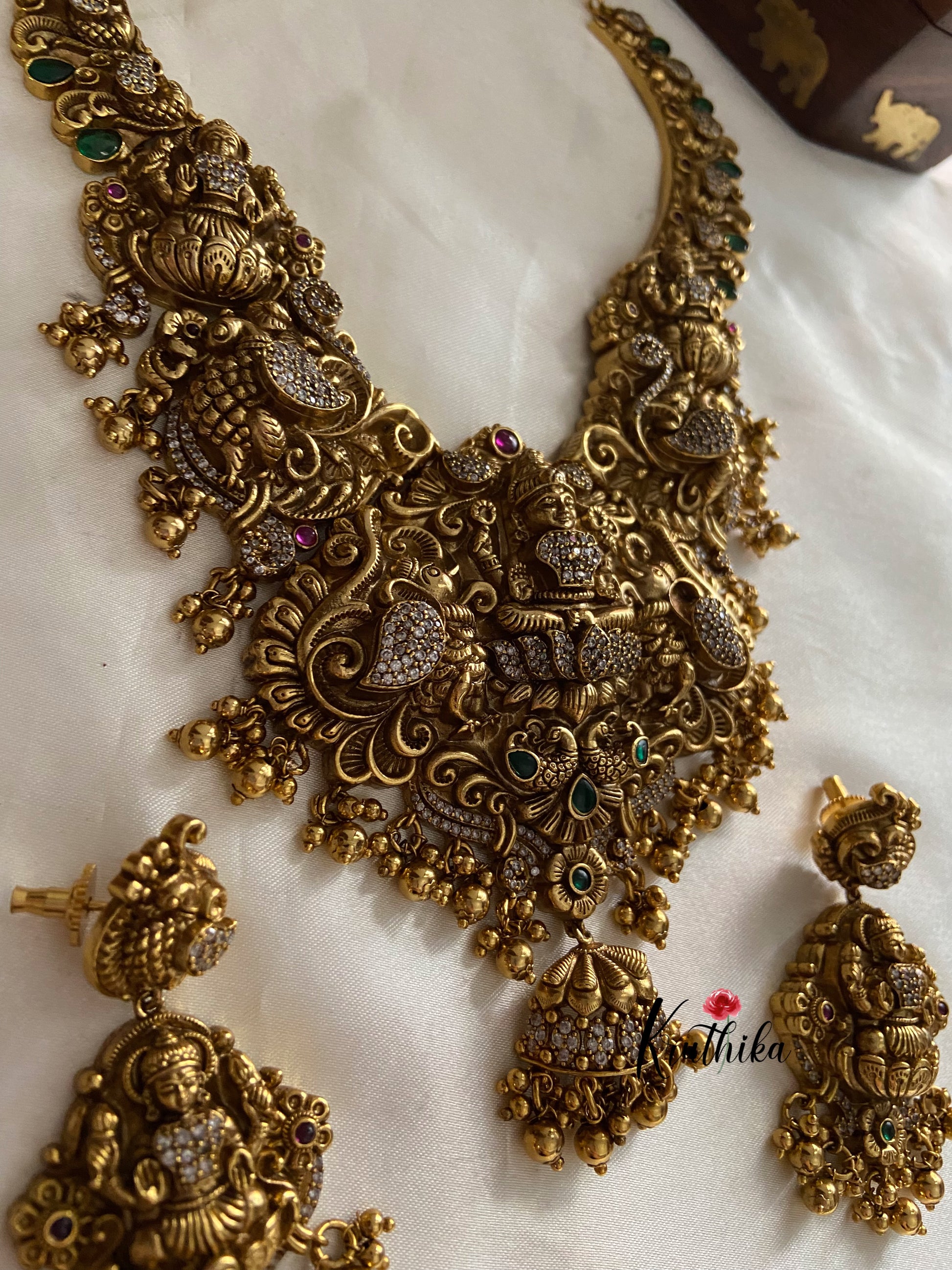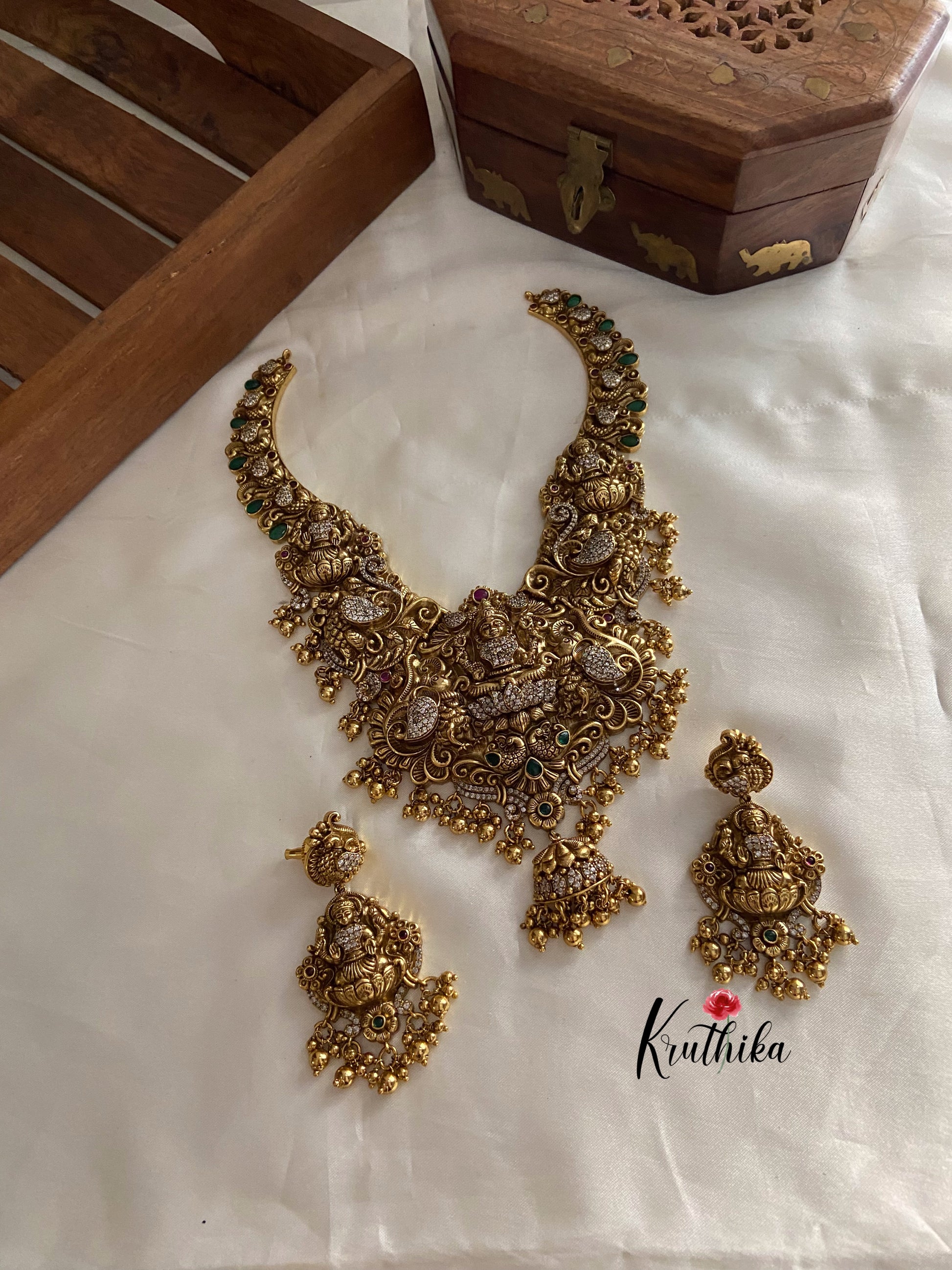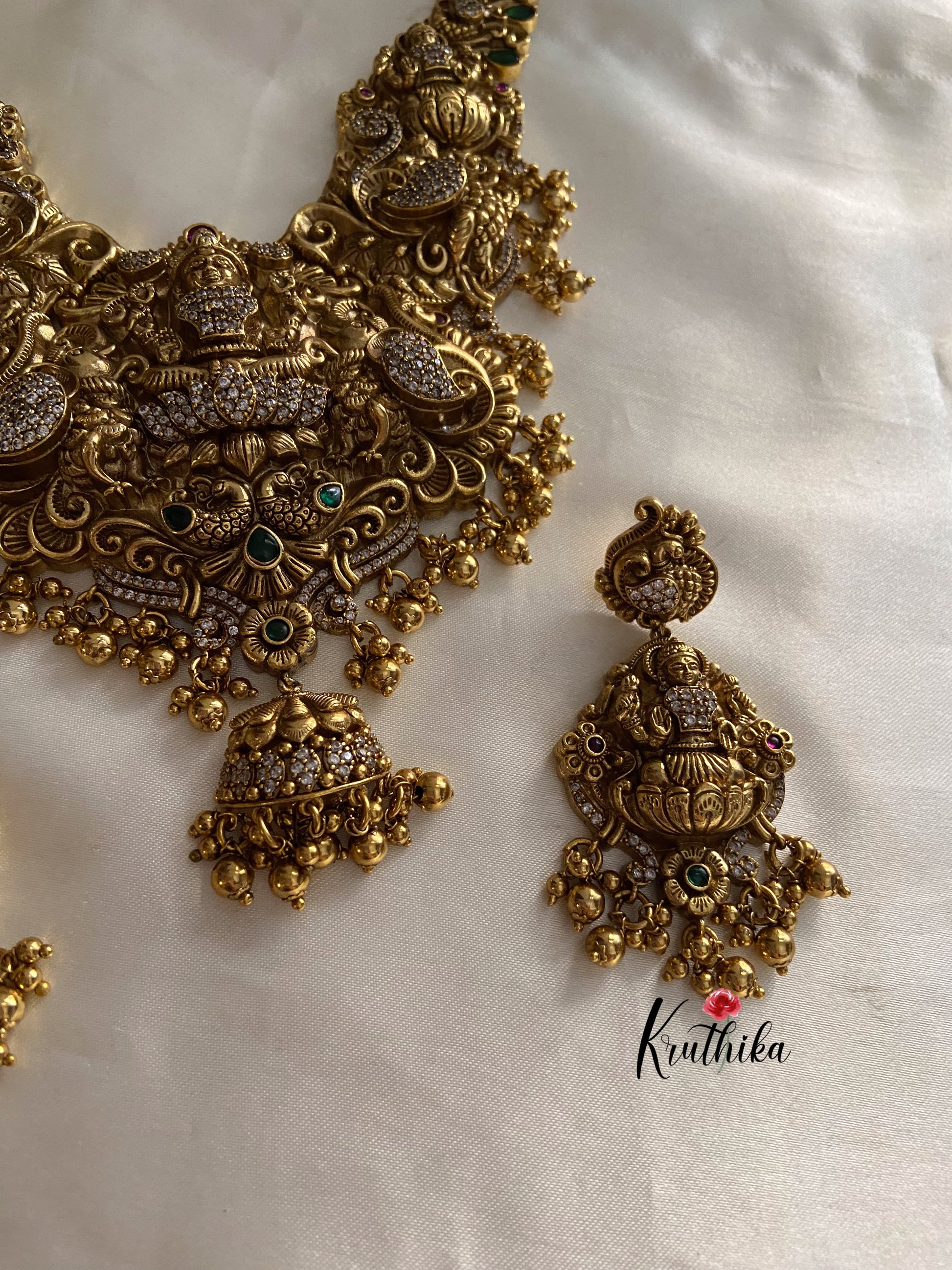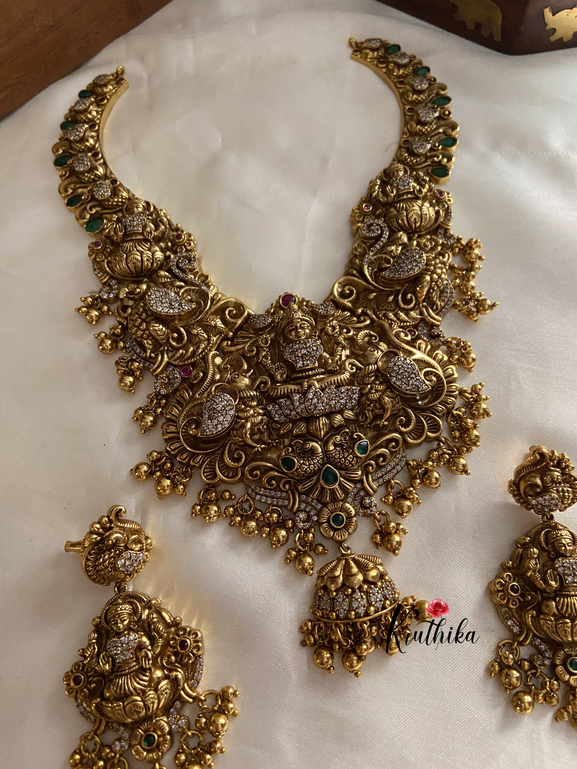 Enhance your style with our stunning Premium antique polish Nagas Lakshmi peacock Haaram, paired perfectly with matching earrings. Crafted with high-quality stones & beads, this set combines timeless elegance with a modern touch. Ideal for special occasions or adding a touch of glamour to your look.
