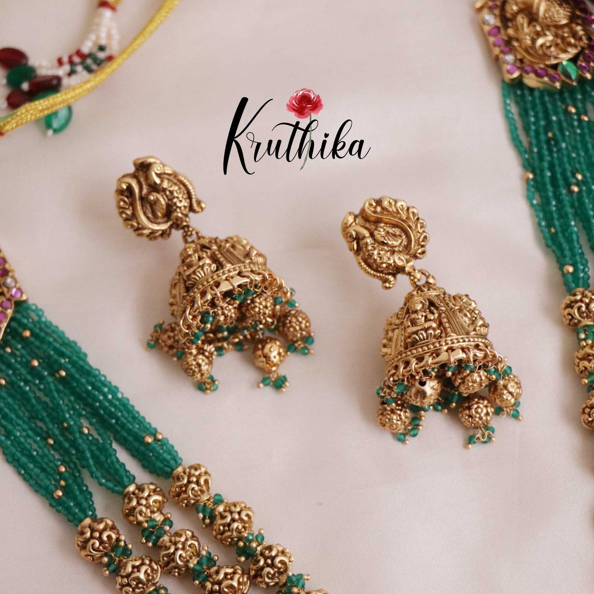 Enhance your style with our stunning Premium Beads Temple Lakshmi Devi Haaram, paired perfectly with matching earrings. Crafted with high-quality stones & beads, this set combines timeless elegance with a modern touch. Ideal for special occasions or adding a touch of glamour to your look.