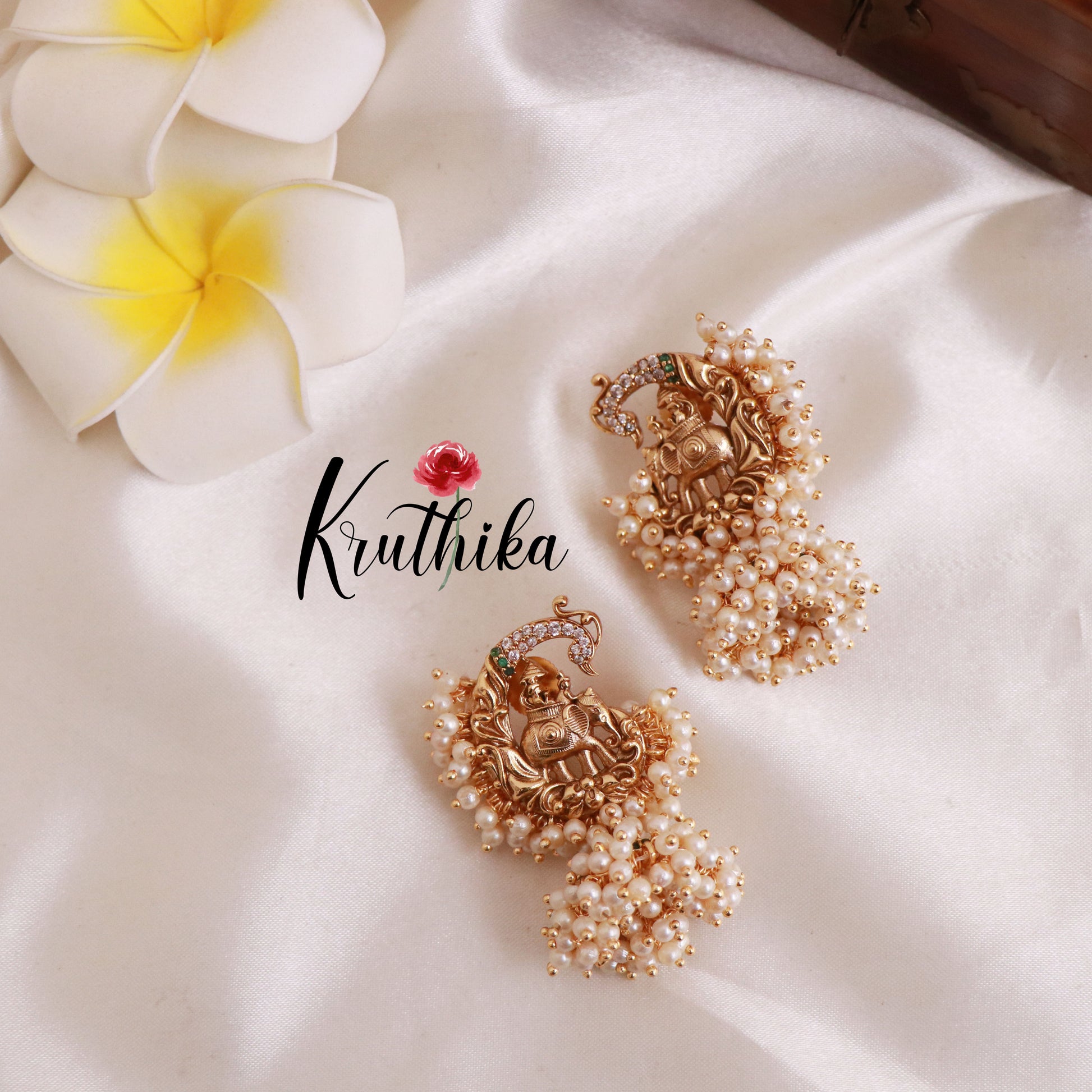 Elevate your elegance with our stunning, Premium Cluster Pearls Peacock Elephants Design Jhumkas. designed to capture the essence of