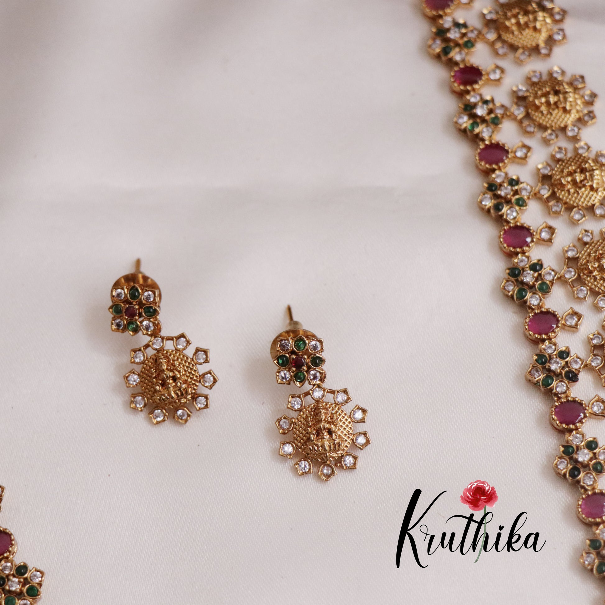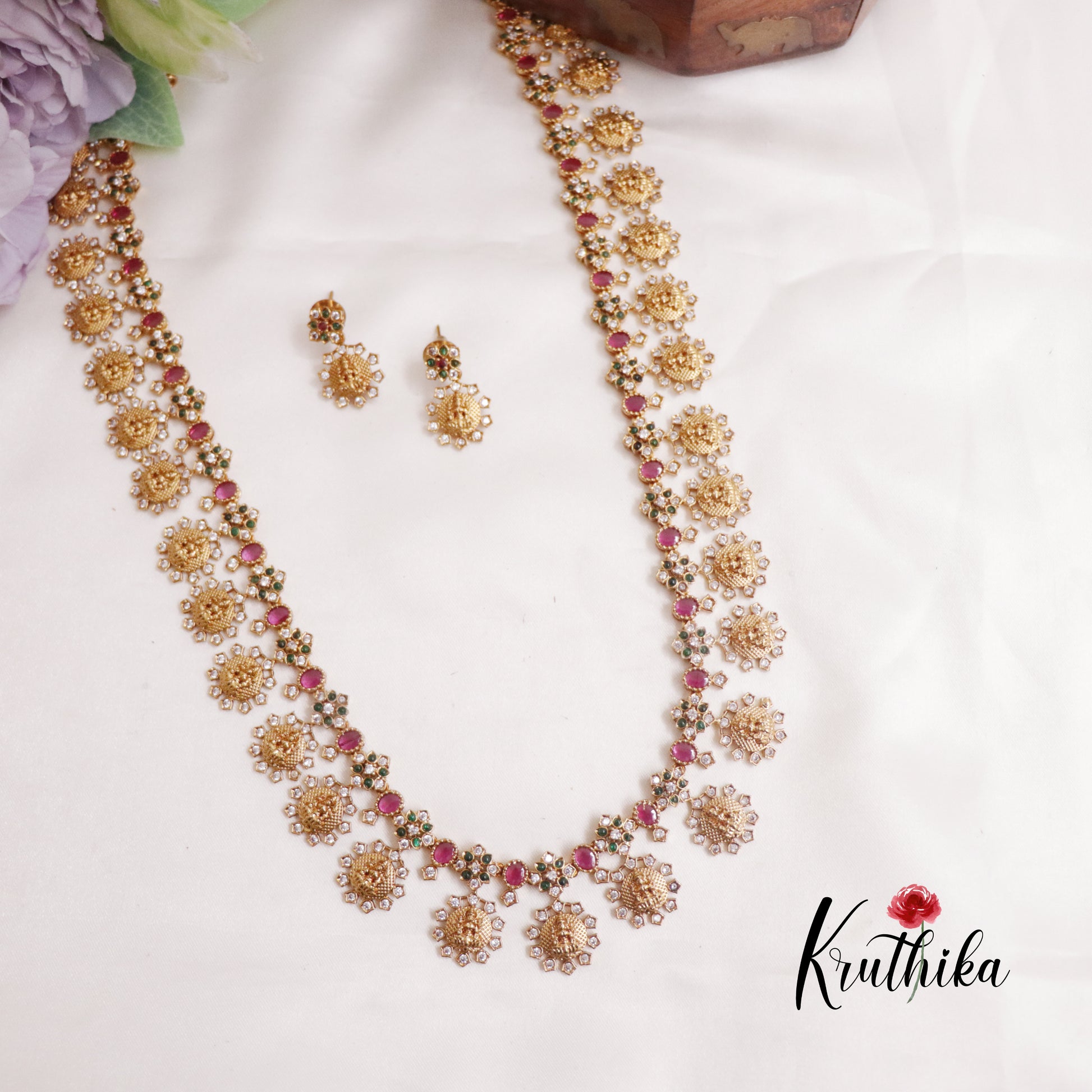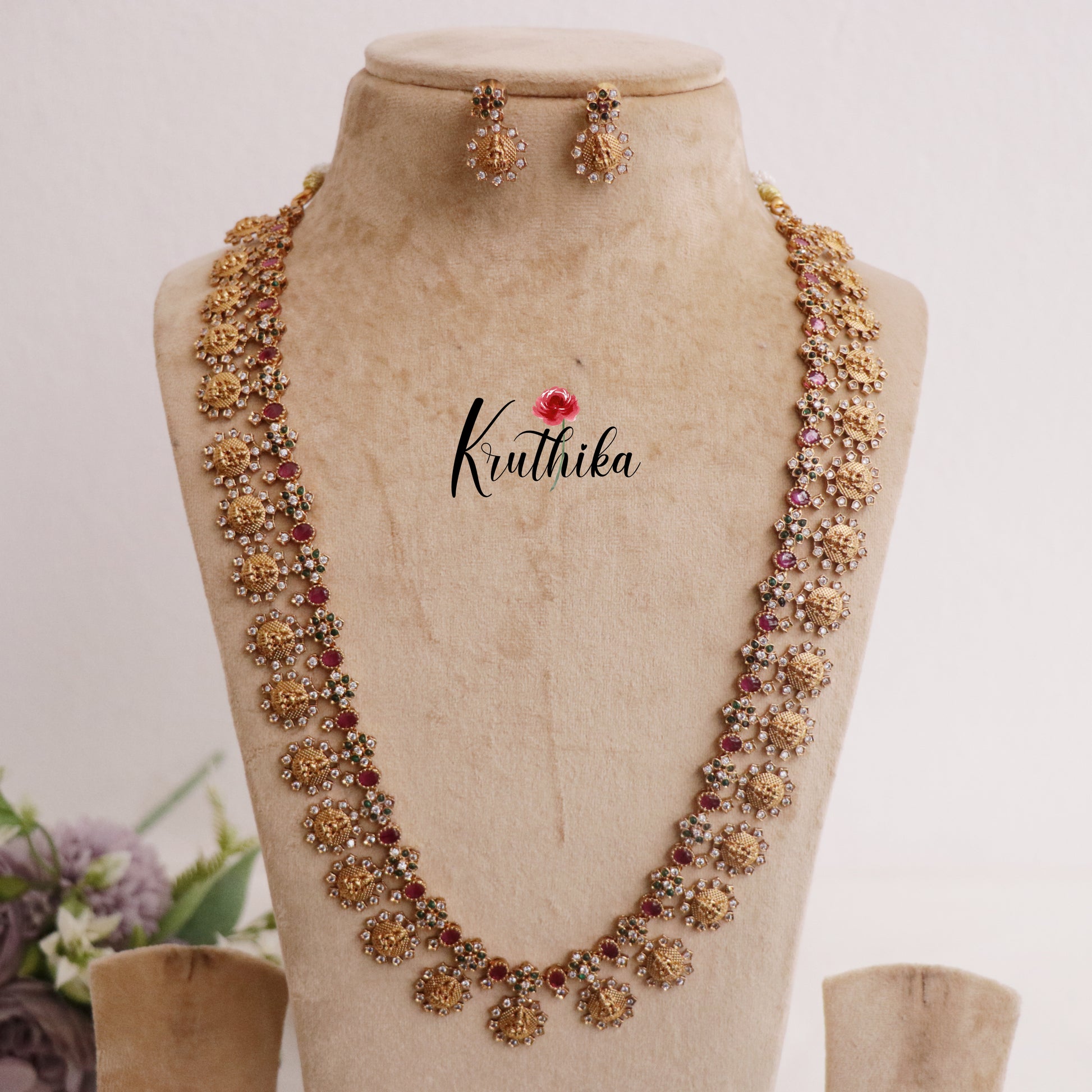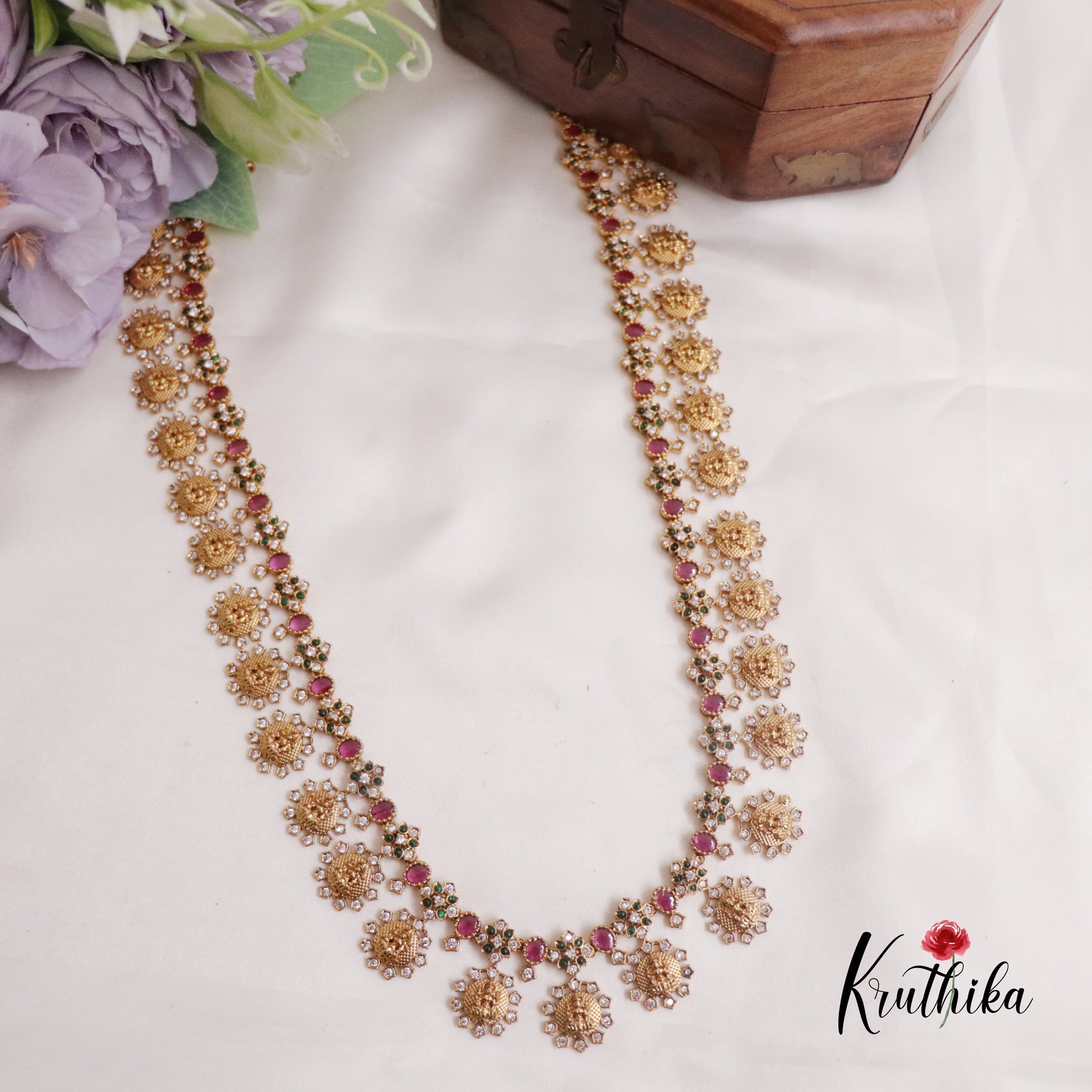 Enhance your style with our stunning Premium CZ Lakshmi Coin/Kasumala Haaram Crafted with high-quality stones & beads, this set combines timeless elegance with a modern touch. Ideal for special occasions or adding a touch of glamour to your look.