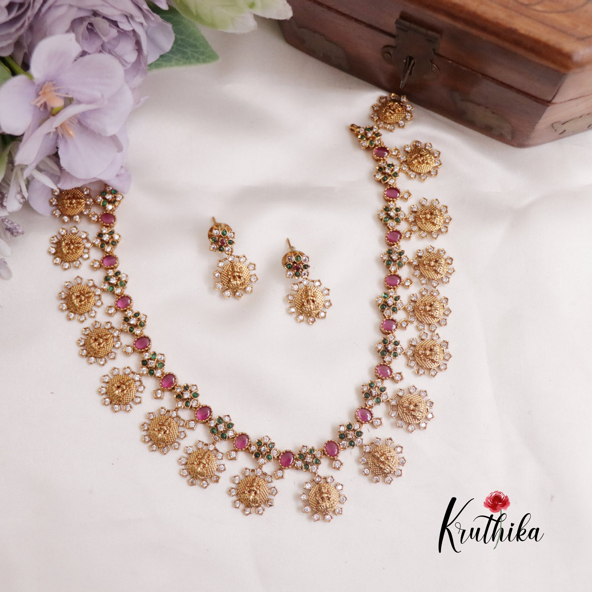 Enhance your style with our stunning, Premium CZ Lakshmi Coin/Kasumala Necklace Crafted with high-quality stones & beads, this set combines timeless elegance with a modern touch. Ideal for special occasions or adding a touch of glamour to your look.