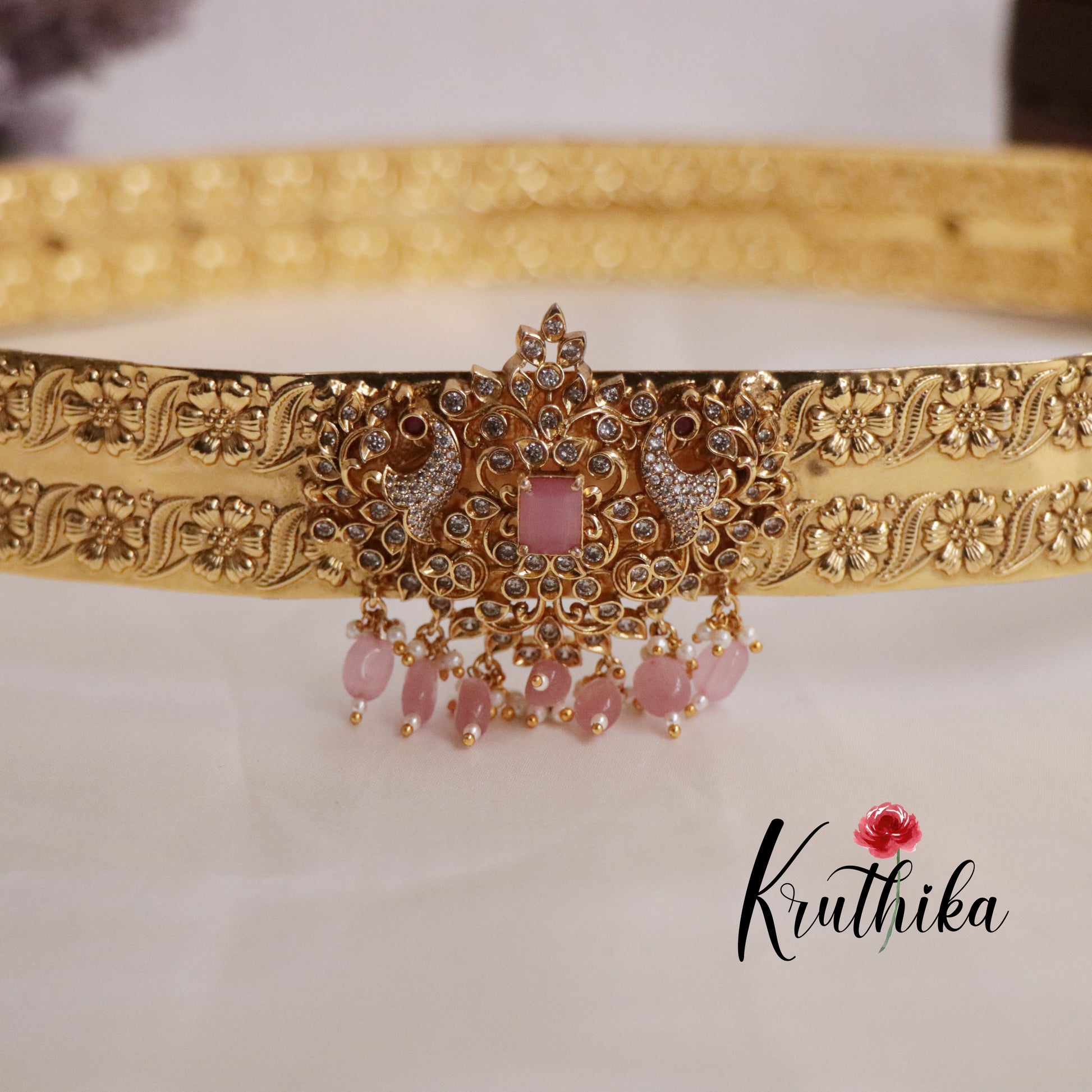 Elevate your traditional attire with Premium CZ Sparkling Victorian Hip Belt with Beads Drops Expertly crafted, this exquisite waist belt features dazzling cubic zirconia stones paired with rich amethyst hues and delicate pearl drops, creating a harmonious blend of elegance and sophistication.