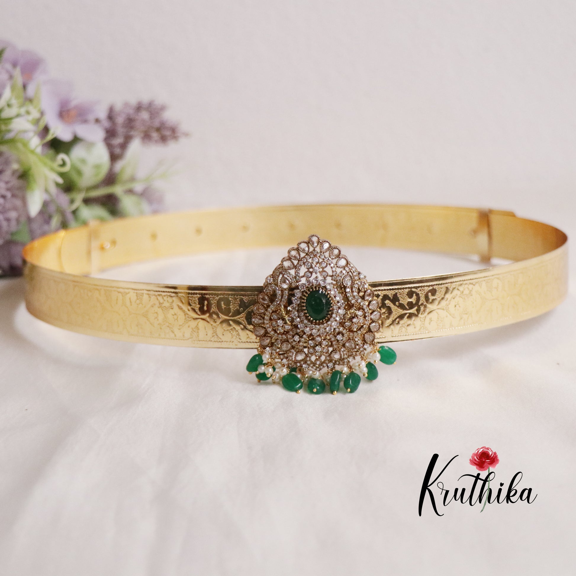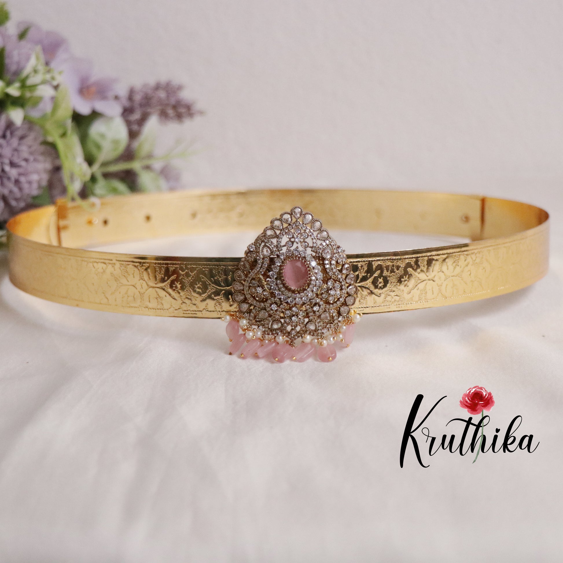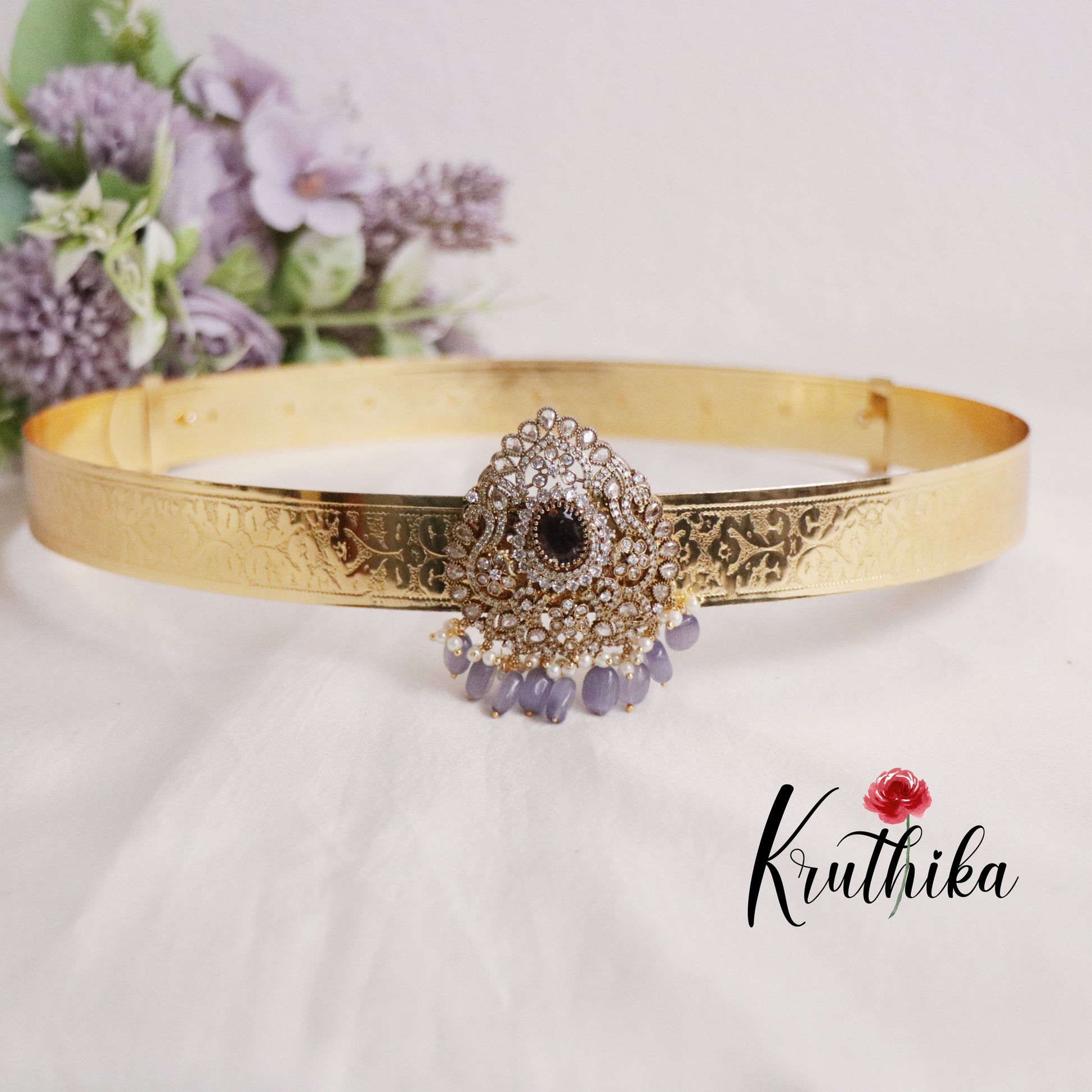 Elevate your traditional attire with the Premium CZ Sparkling Amethyst Pearl Drop Vaddanam. Expertly crafted, this exquisite waist belt features dazzling cubic zirconia stones paired with rich amethyst hues and delicate pearl drops, creating a harmonious blend of elegance and sophistication.