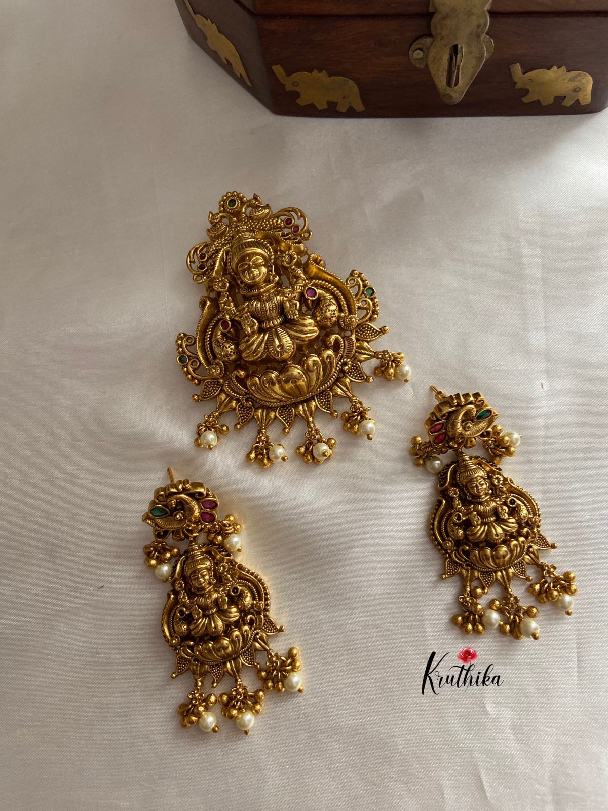 Enhance your style with our stunning Premium finish Lakshmi Devi pendant set, paired perfectly with matching earrings. Crafted with high-quality stones & beads, this set combines timeless elegance with a modern touch. Ideal for special occasions or adding a touch of glamour to your look.