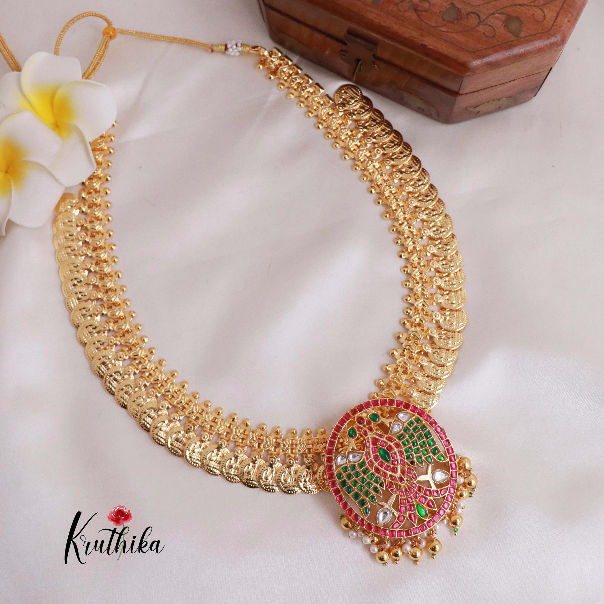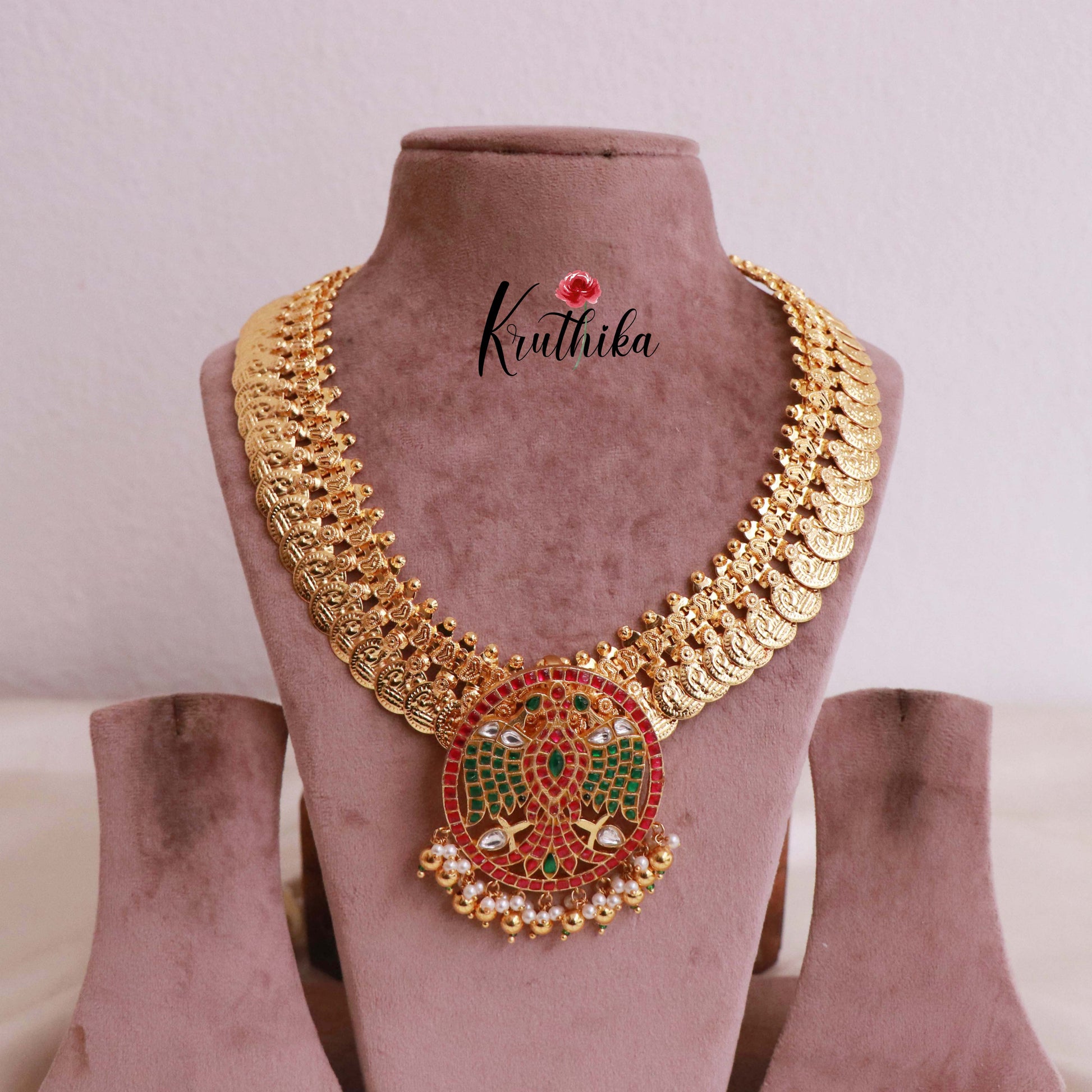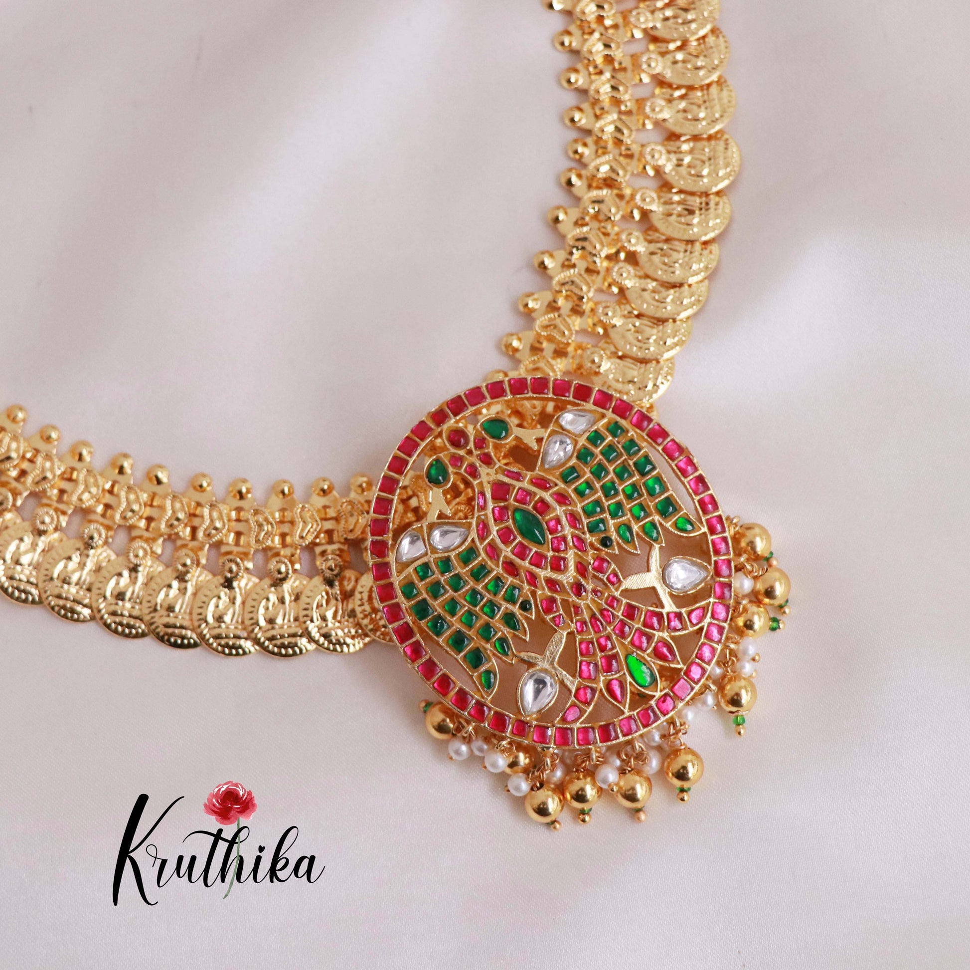 Enhance your style with our stunning, Premium Gold Finish Laxmi Coin Necklace with, Jadau Pendant Multi Colour Elegant Premium Polish Temple Choker, paired perfectly with matching earrings. Crafted with high-quality stones & beads, this set combines timeless elegance with a modern touch. Ideal for special occasions or adding a touch of glamour to your look.