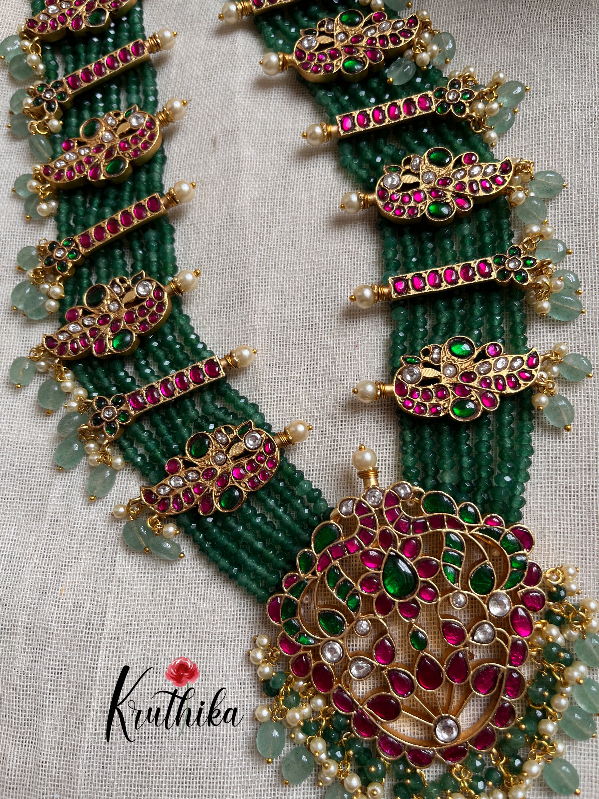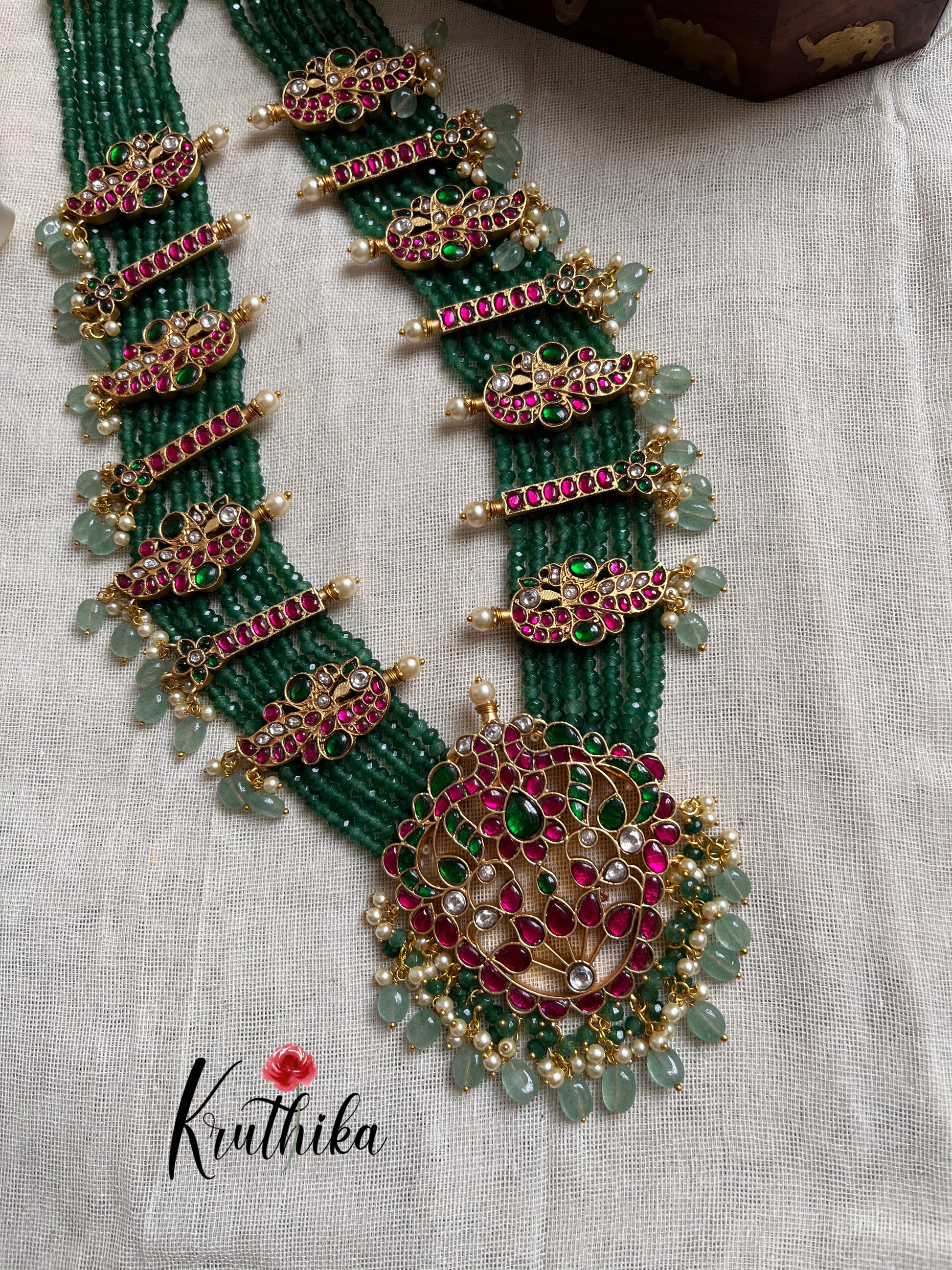 Enhance your style with our stunning Premium Jadau multi layer green beads Haaram, paired perfectly with matching earrings. Crafted with high-quality stones & beads, this set combines timeless elegance with a modern touch. Ideal for special occasions or adding a touch of glamour to your look.