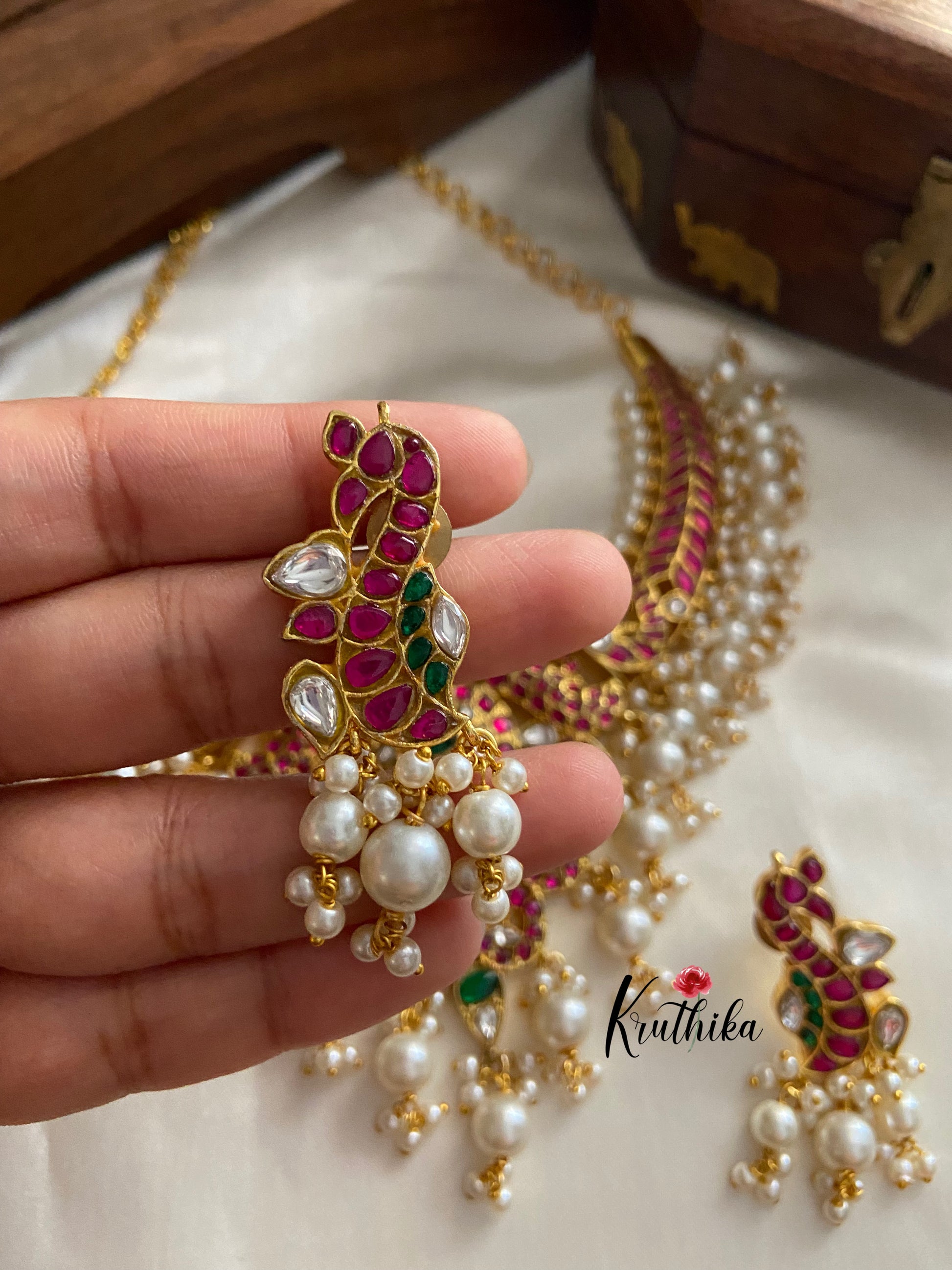 Enhance your style with our stunning Premium Jadau peacock necklace, paired perfectly with matching earrings. Crafted with high-quality stones & beads, this set combines timeless elegance with a modern touch. Ideal for special occasions or adding a touch of glamour to your look.