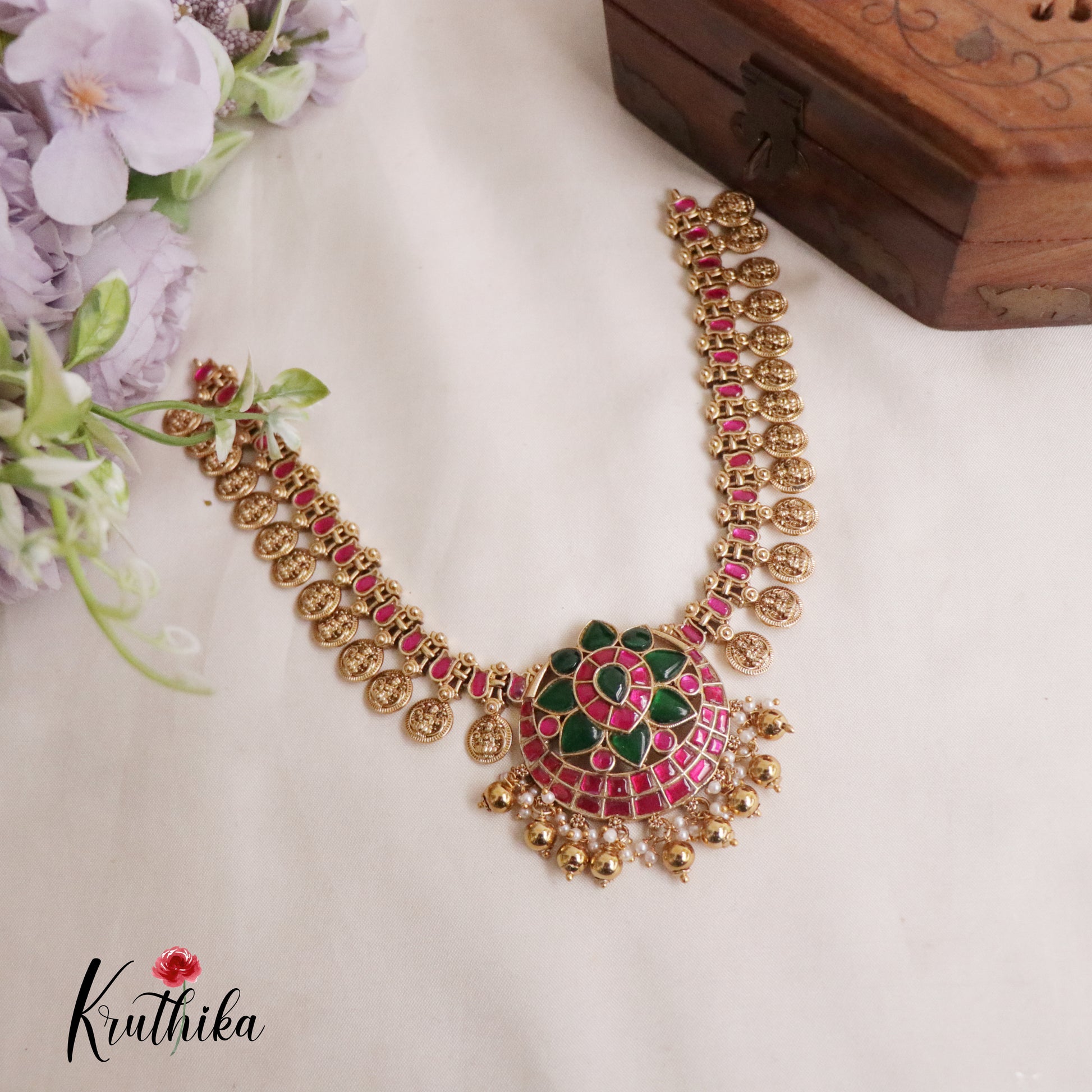 Enhance your style with our stunning, Premium antique Jadau Pendant Kasu Necklace with Golden Beads Crafted with high-quality stones & beads, this set combines timeless elegance with a modern touch. Ideal for special occasions or adding a touch of glamour to your look.