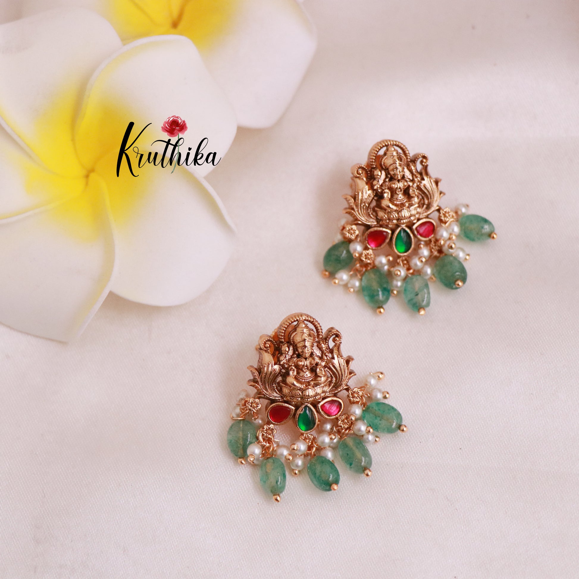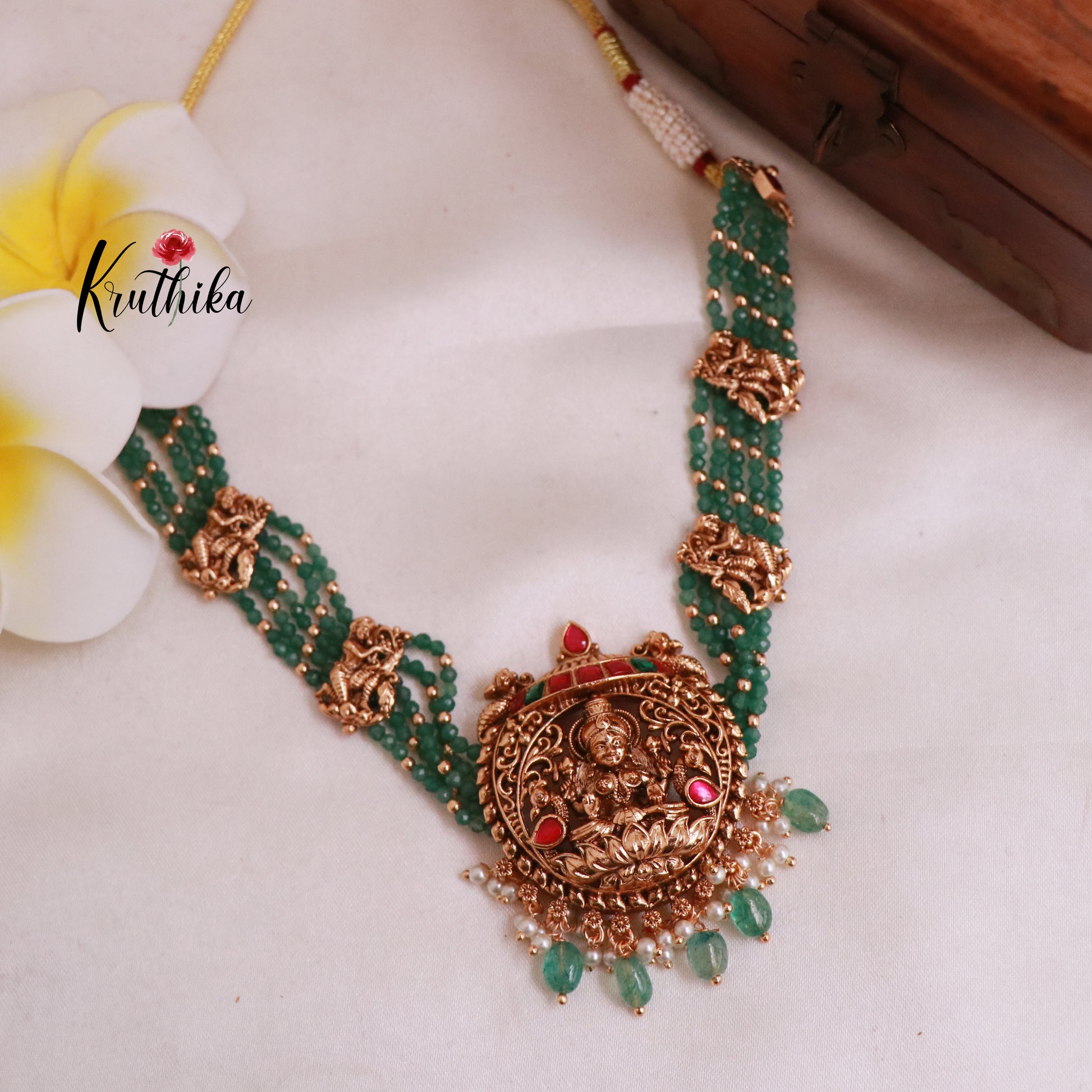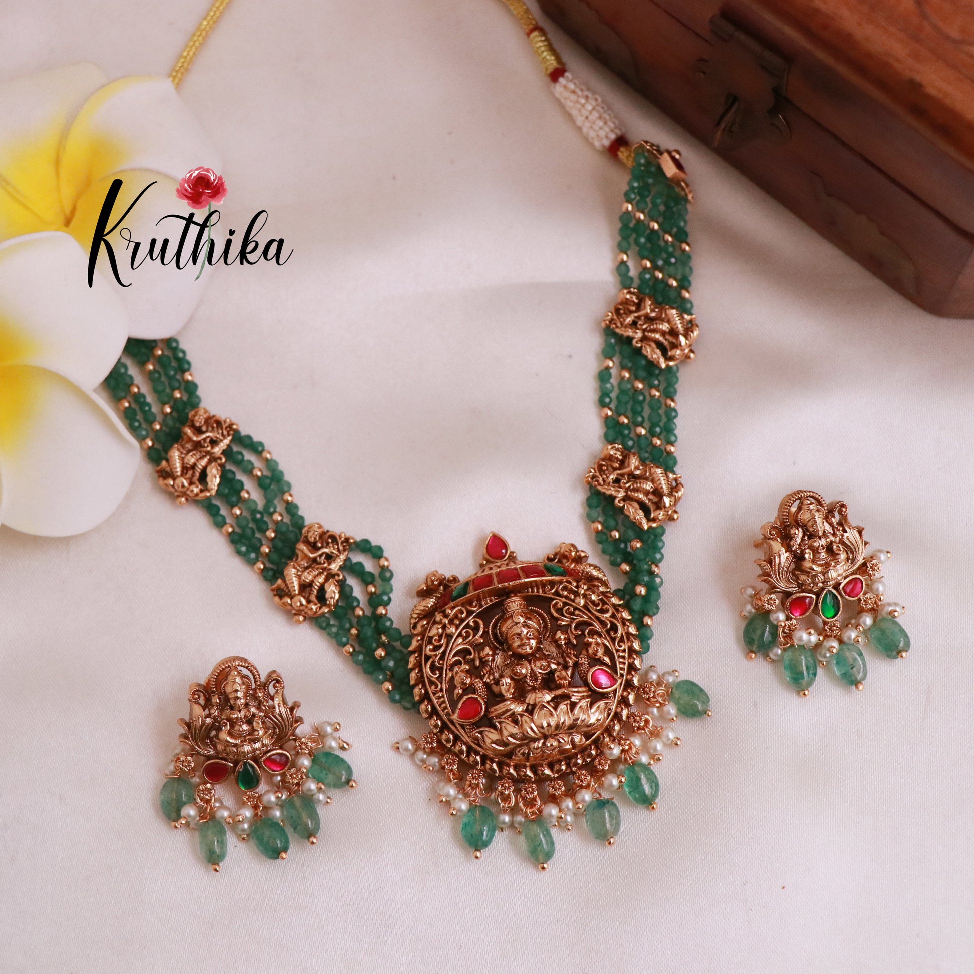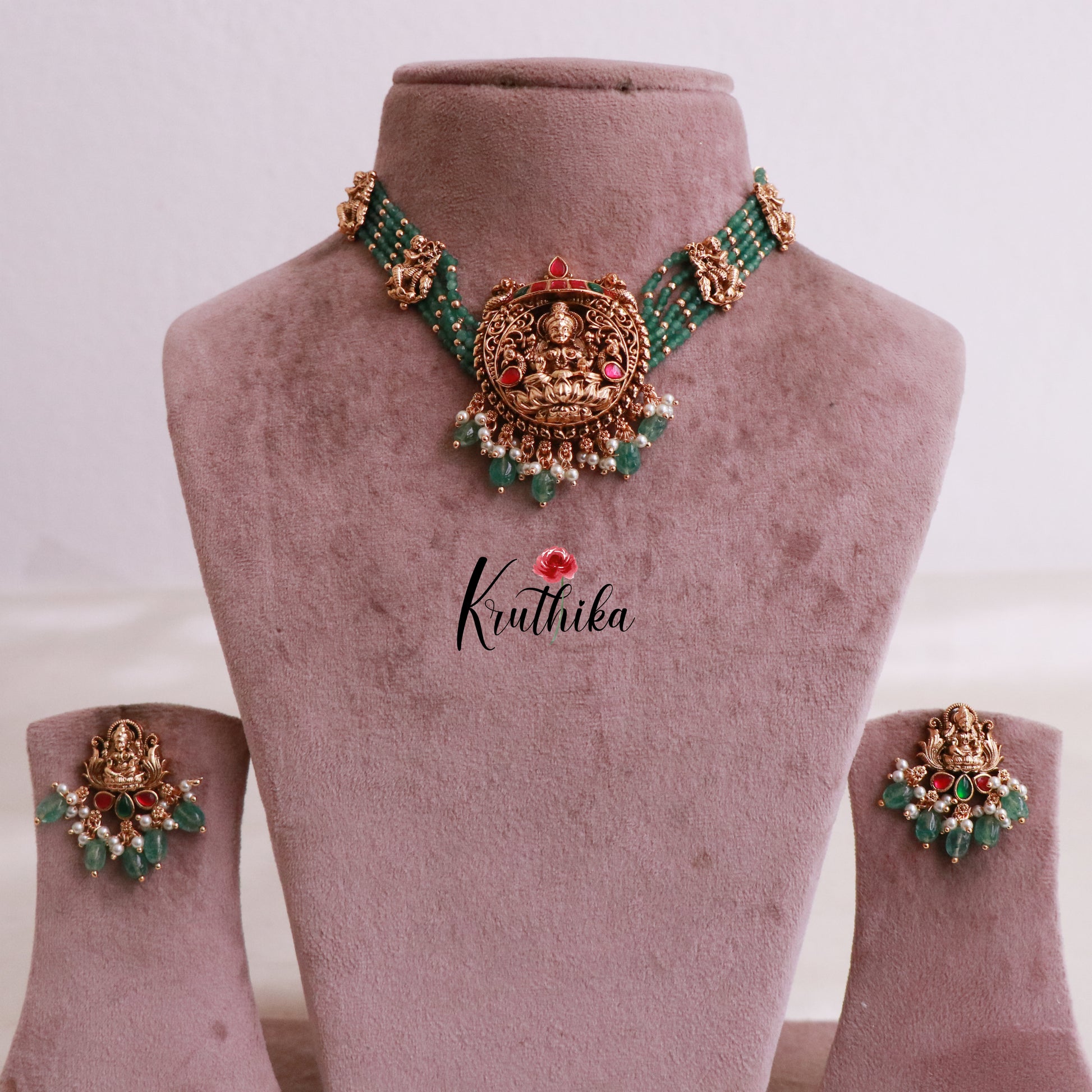 Enhance your style with our stunning Premium Jadau temple green beads choker perfectly with matching earrings. Crafted with high-quality stones & beads, this set combines timeless elegance with a modern touch. Ideal for special occasions or adding a touch of glamour to your look.