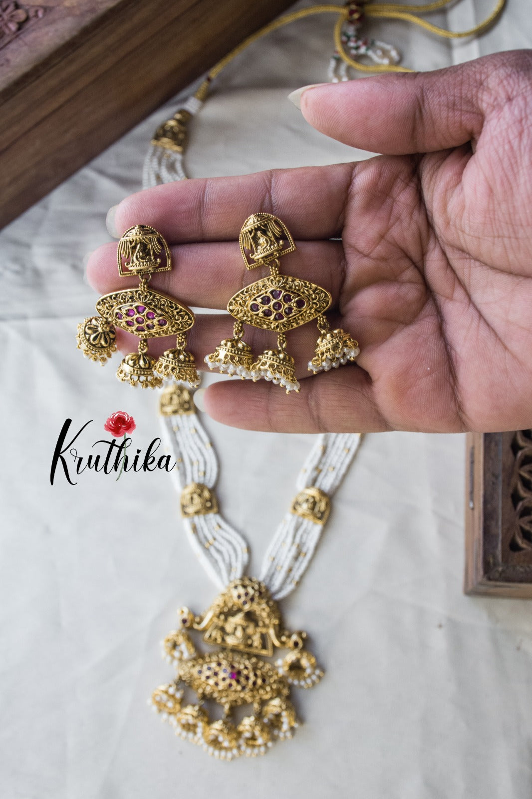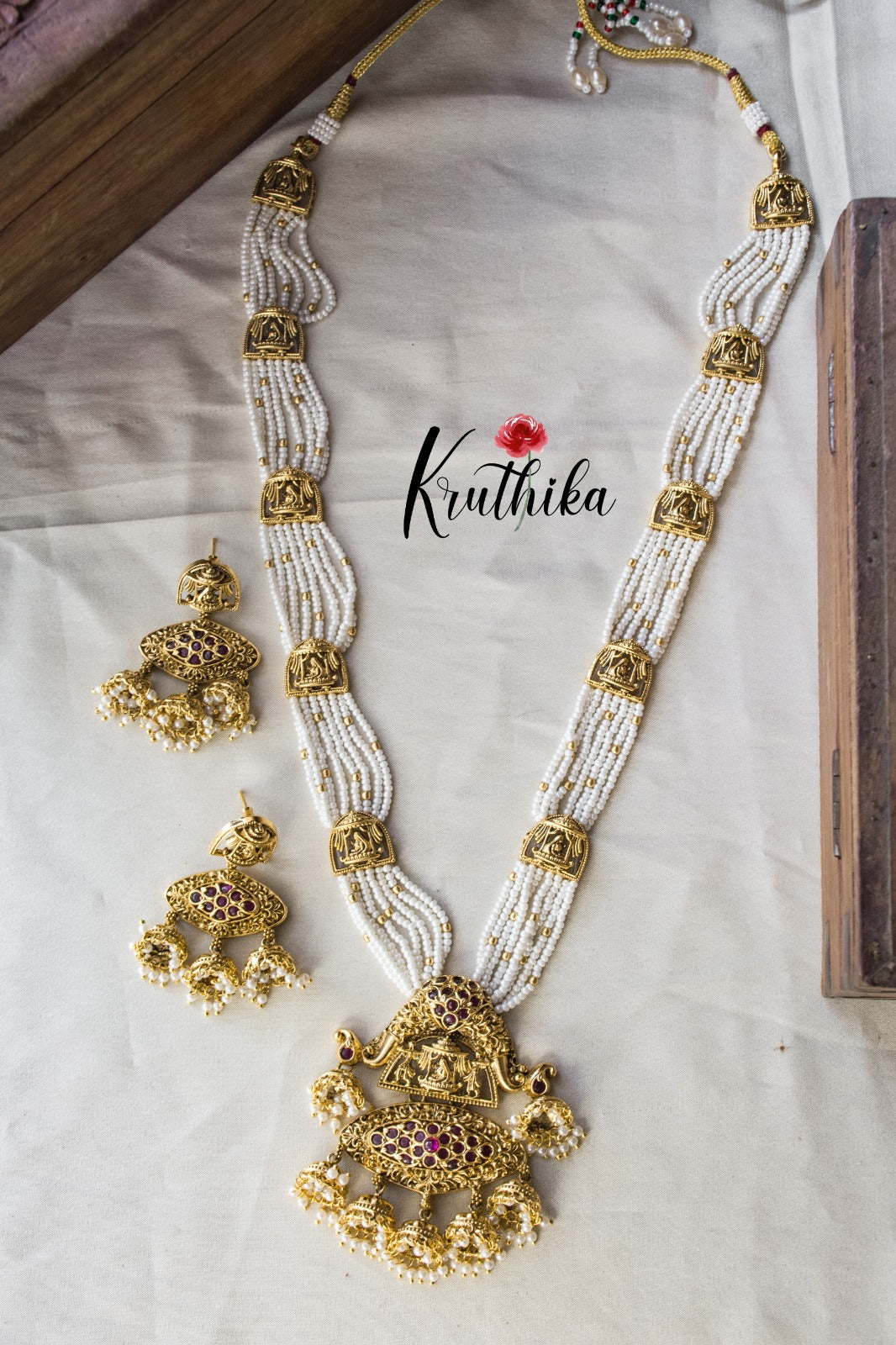 Enhance your style with our stunning Premium Kemp Pallaki Pearls Haaram, paired perfectly with matching earrings. Crafted with high-quality stones & beads, this set combines timeless elegance with a modern touch. Ideal for special occasions or adding a touch of glamour to your look.