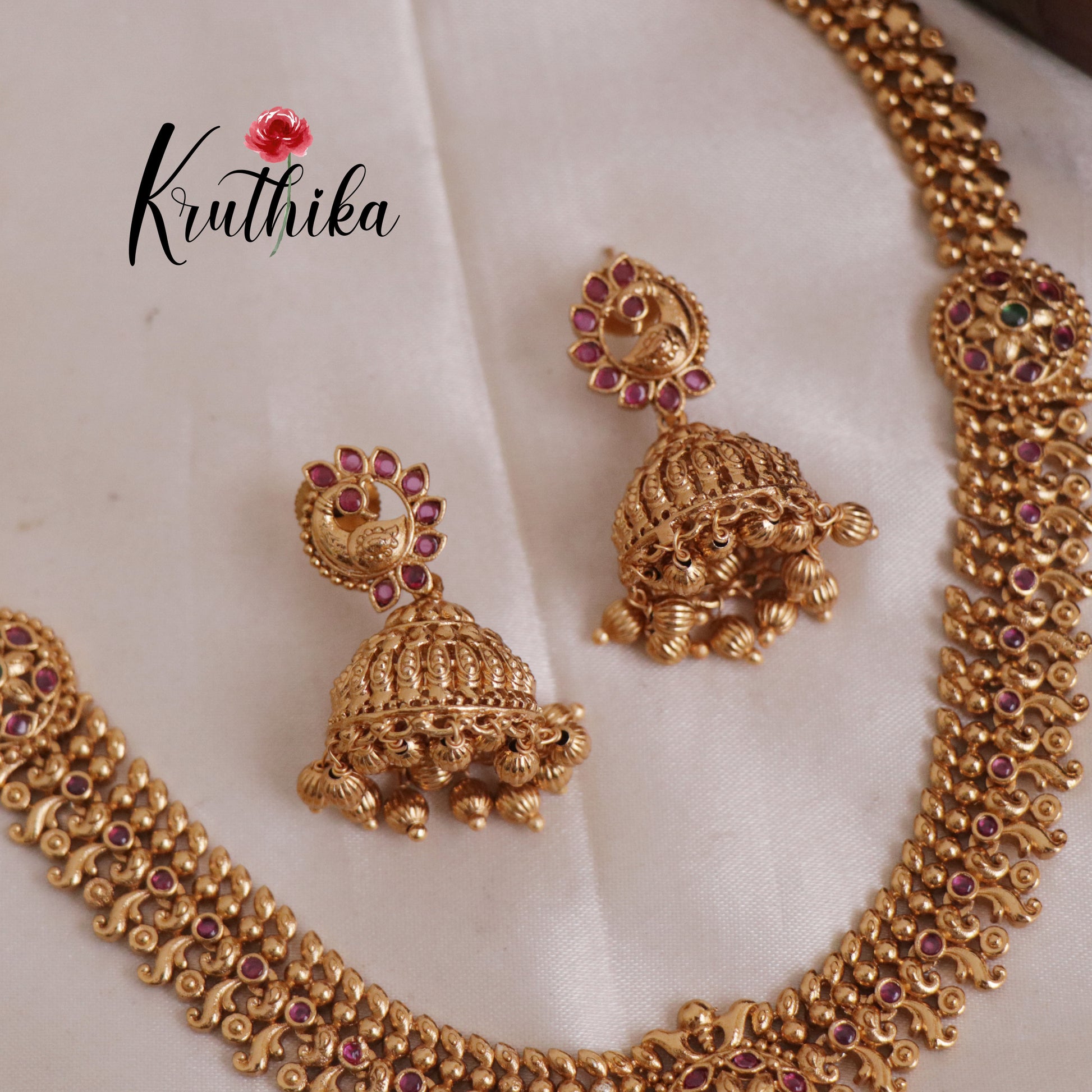Enhance your style with our stunning, Premium AD Kemp stones Mango Mid length necklace. Crafted with high-quality stones & beads, this set combines timeless elegance with a modern touch. Ideal for special occasions or adding a touch of glamour to your look.
