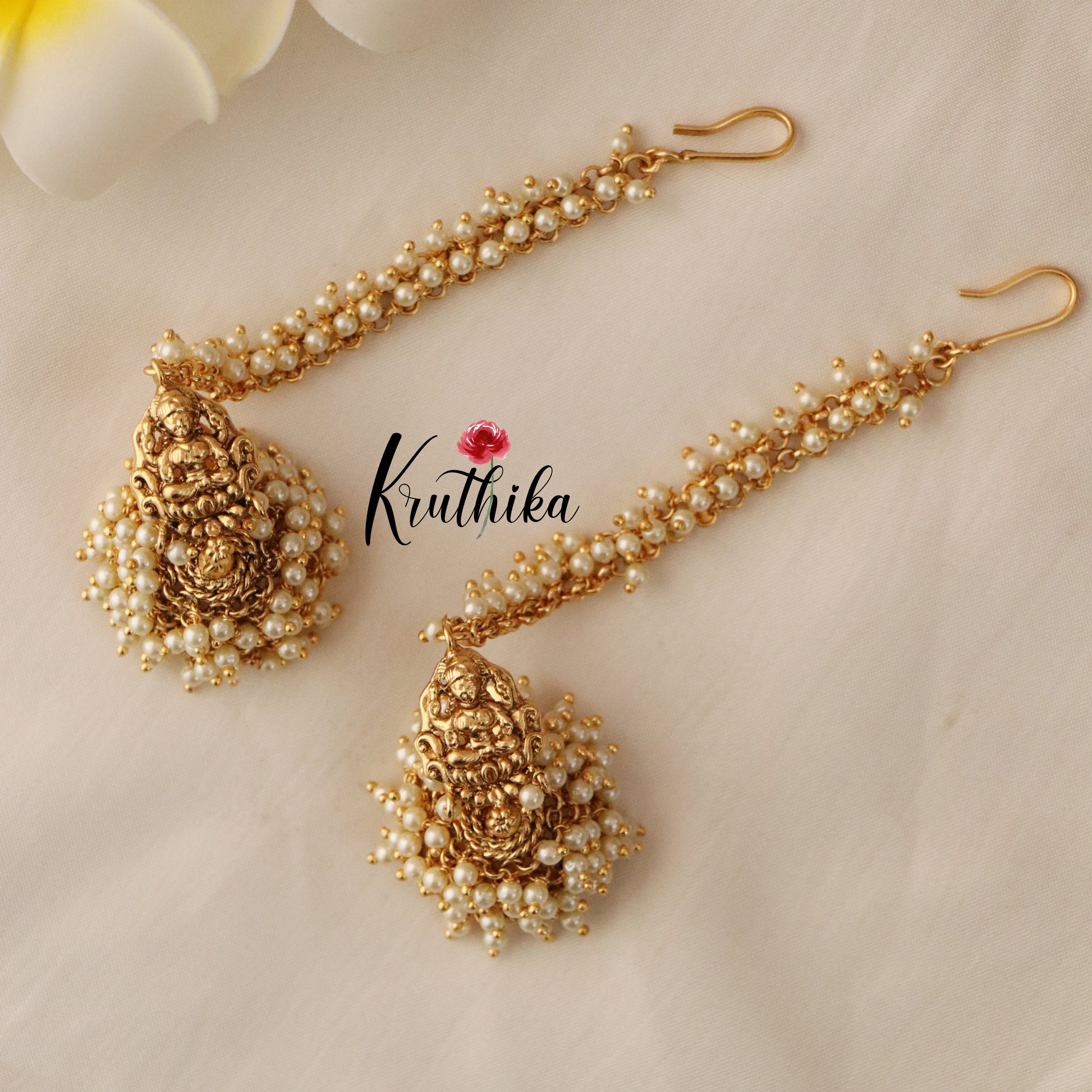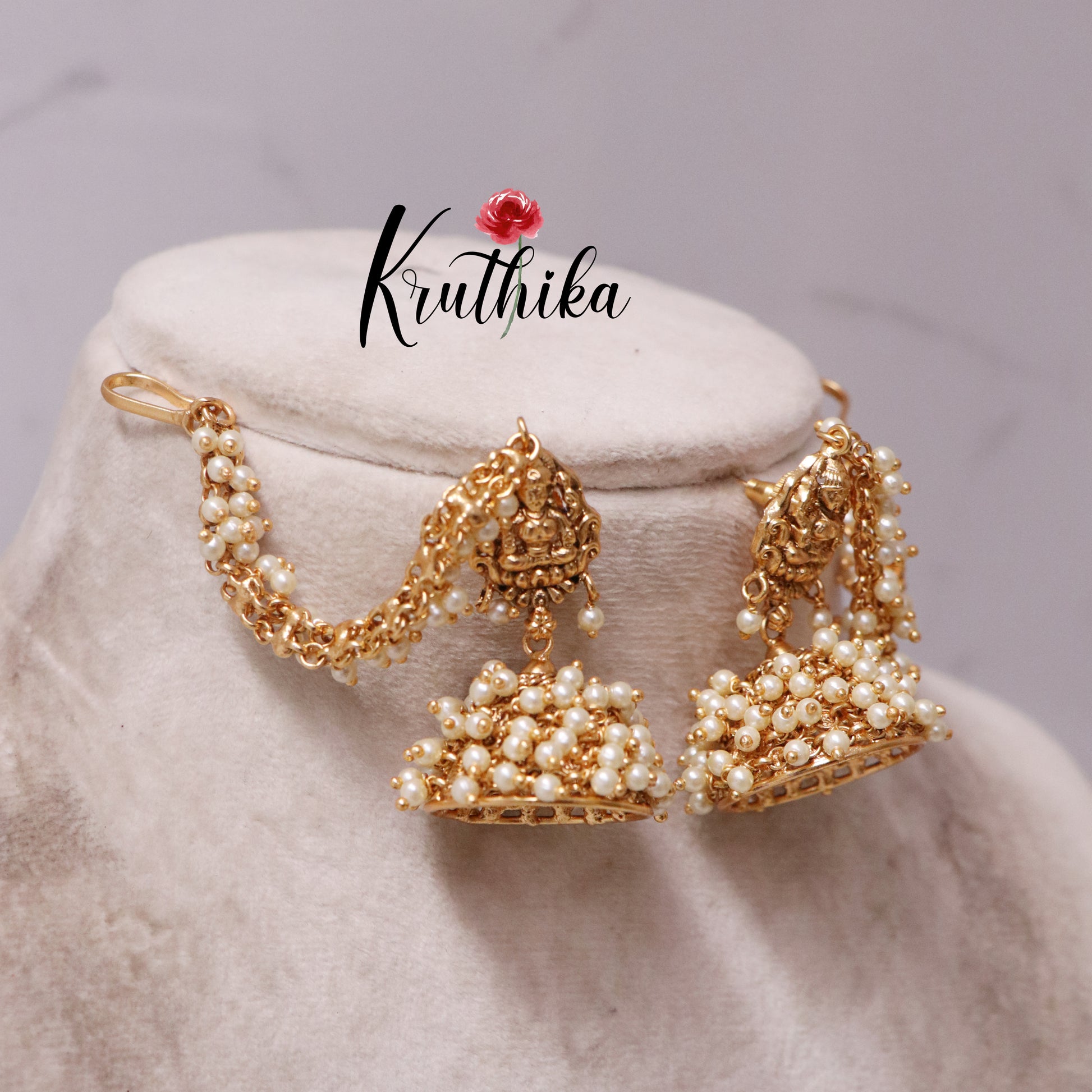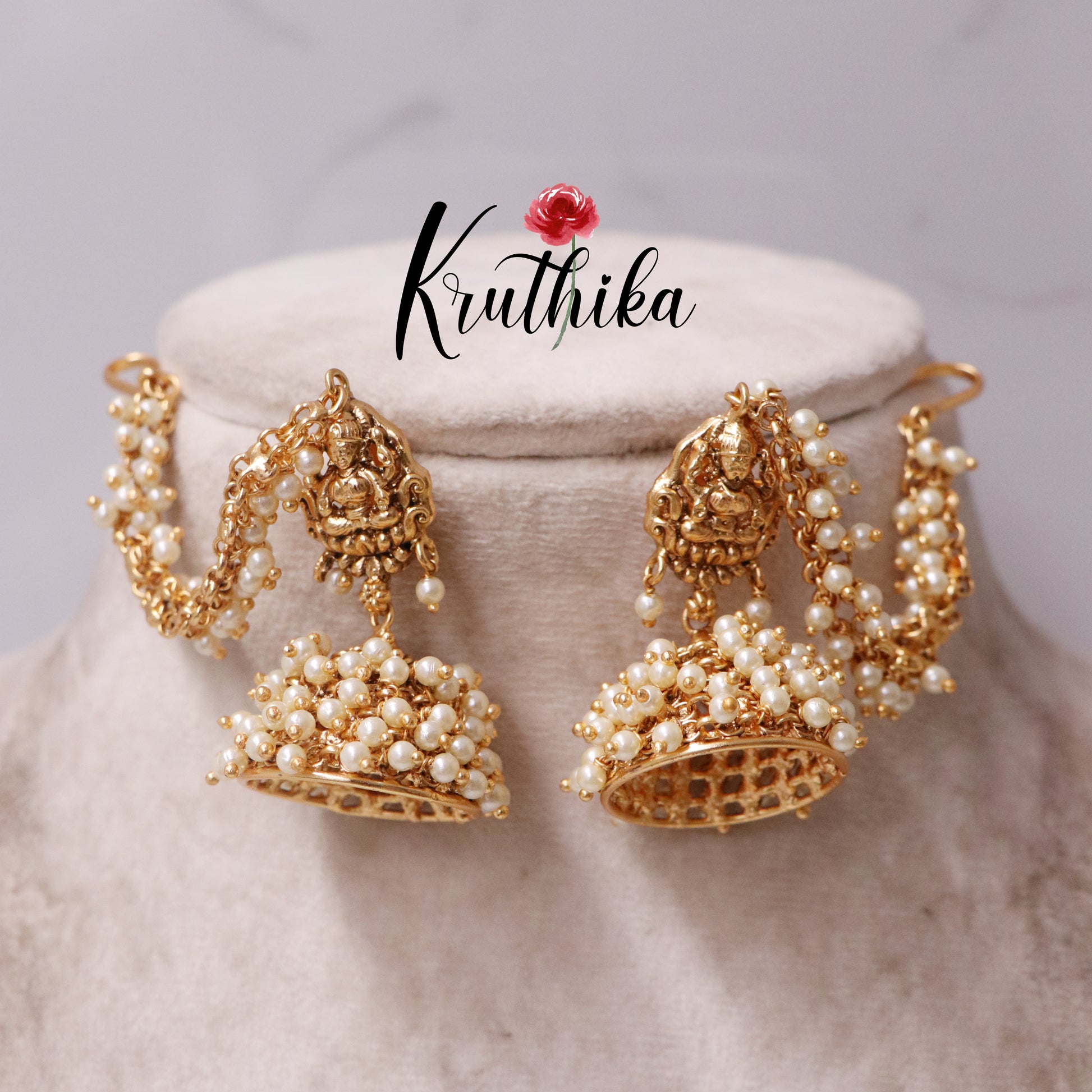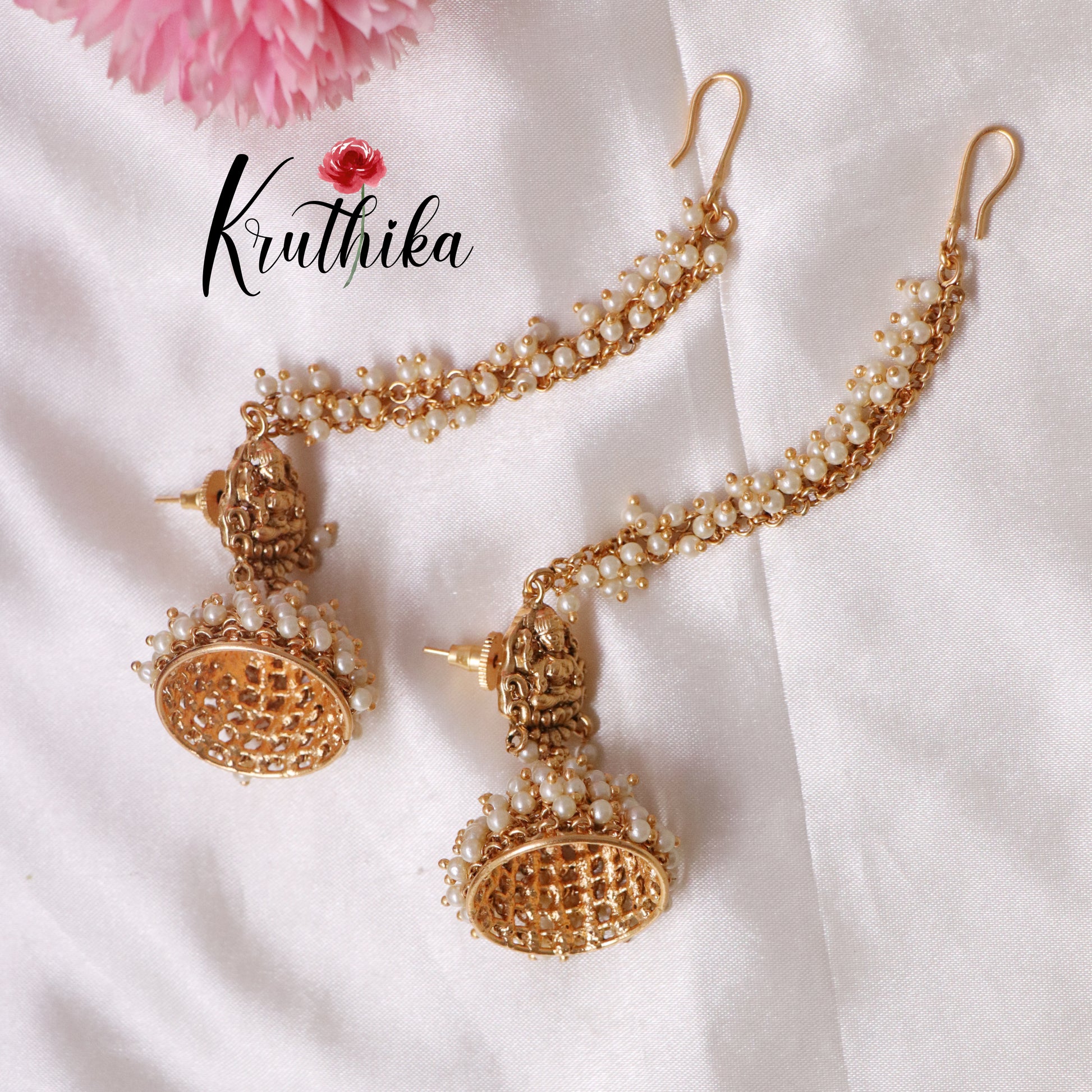 Premium Lakshmi Devi Pearl jhumkas with earchains E426