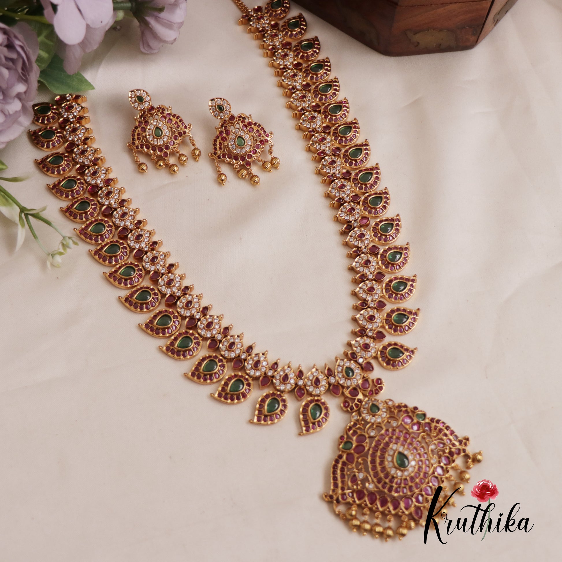 This premium Mango Haaram Set is a stunning tribute to South Indian tradition. The long necklace features classic mango shaped motifs adorned with vibrant ruby, emerald, and CZ stones, culminating in a grand, intricately detailed pendant. Completed with matching drop earrings and a rich gold tone finish, this regal set is the perfect statement piece for weddings and festive celebrations.