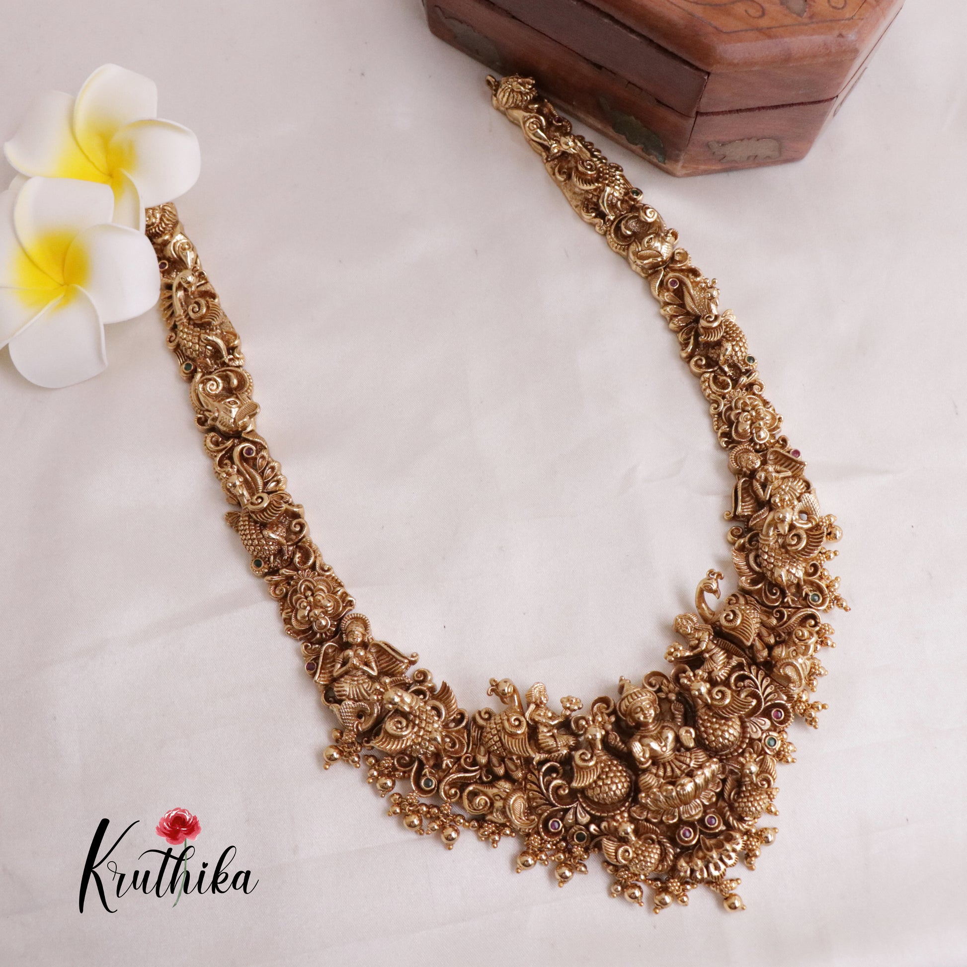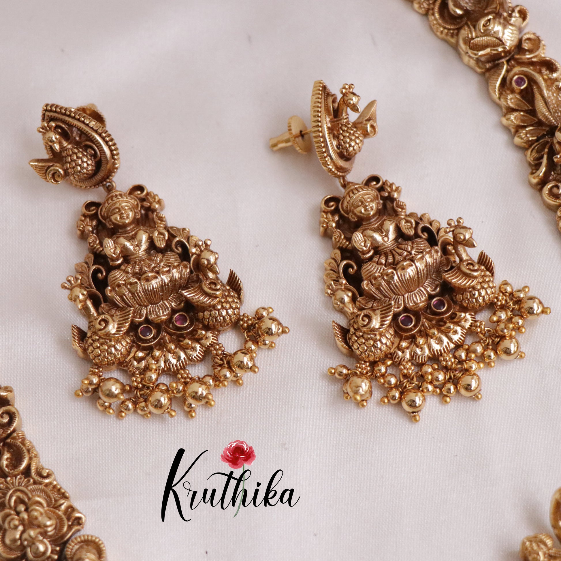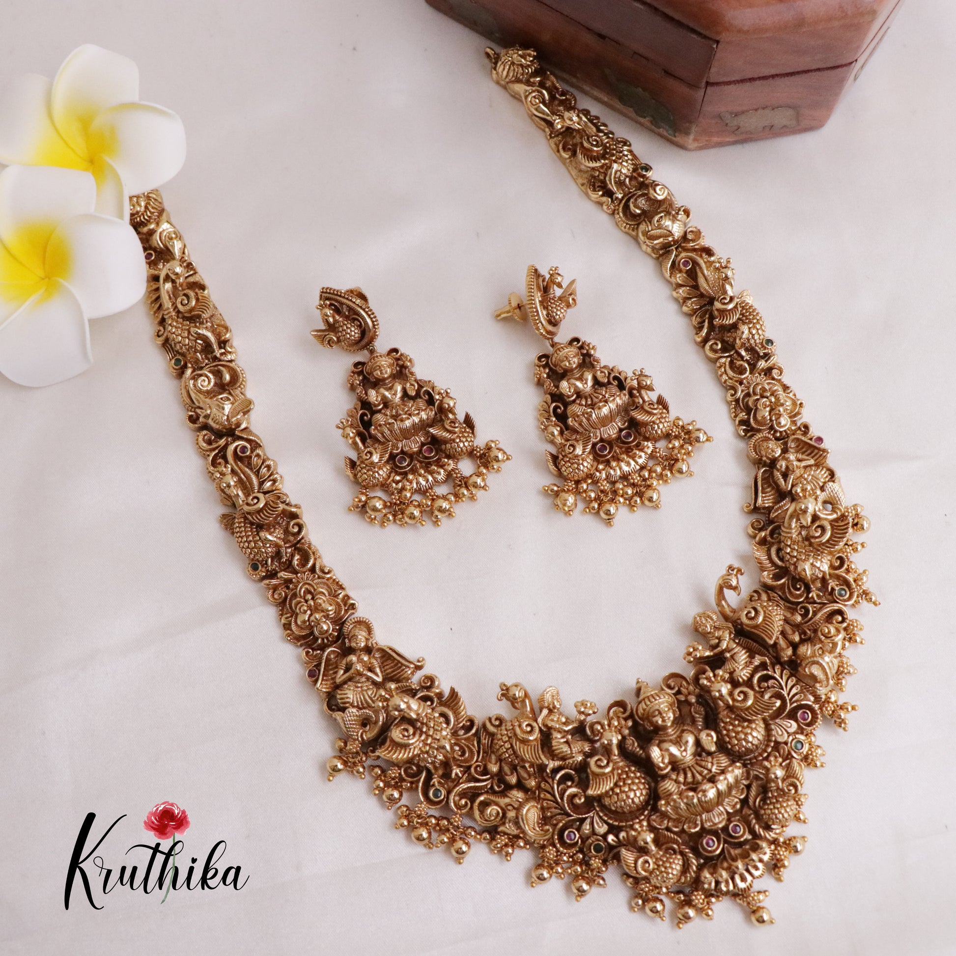 Enhance your style with our stunning, Premium Nagas Lakshmi peacock Haram, paired perfectly with matching earrings. Crafted with high-quality stones & beads, this set combines timeless elegance with a modern touch. Ideal for special occasions or adding a touch of glamour to your look.