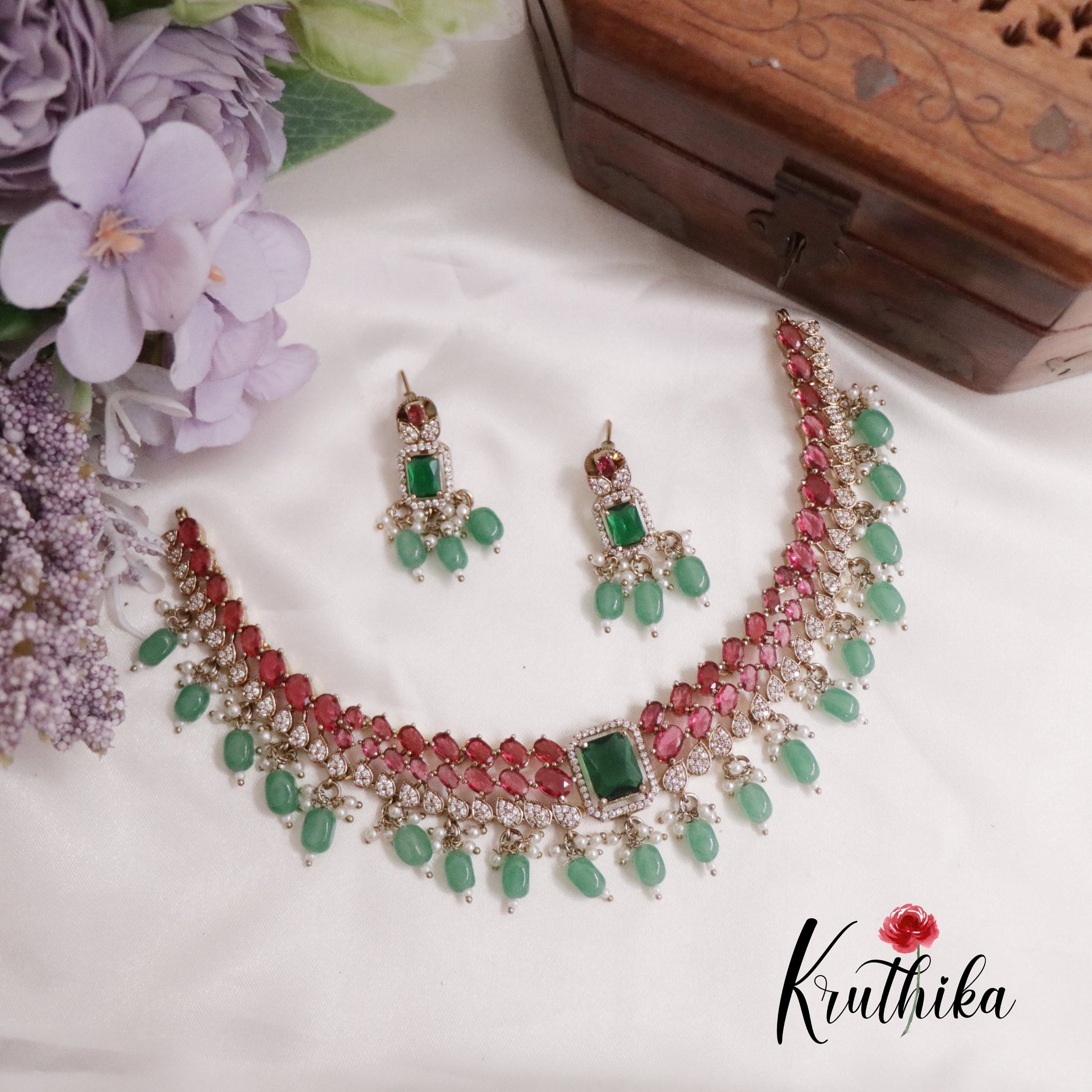 Enhance your style with our stunning Pretty AD/ Victorian Necklace with Pastel Green Beads Drops Crafted with high-quality stones & beads, this set combines timeless elegance with a modern touch. Ideal for special occasions or adding a touch of glamour to your look.