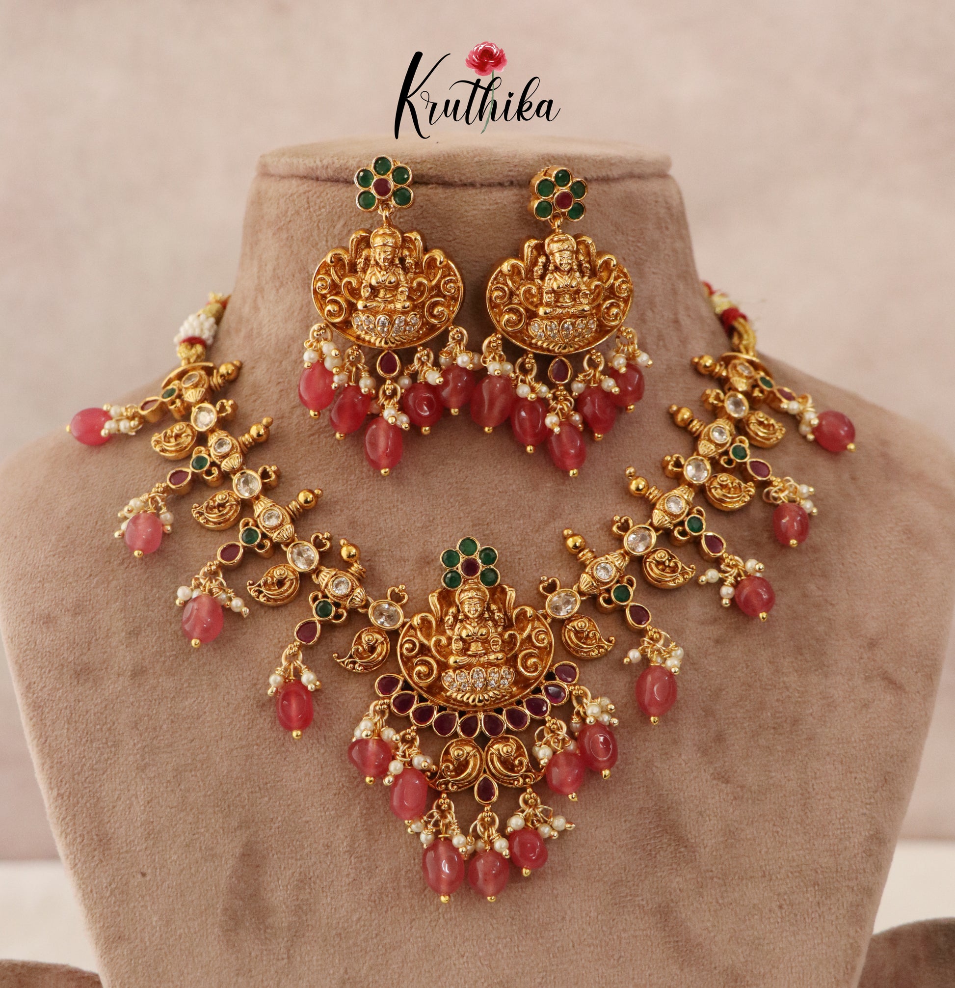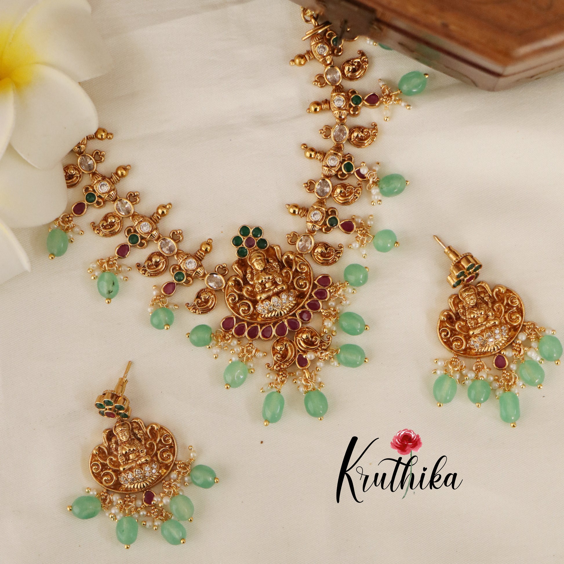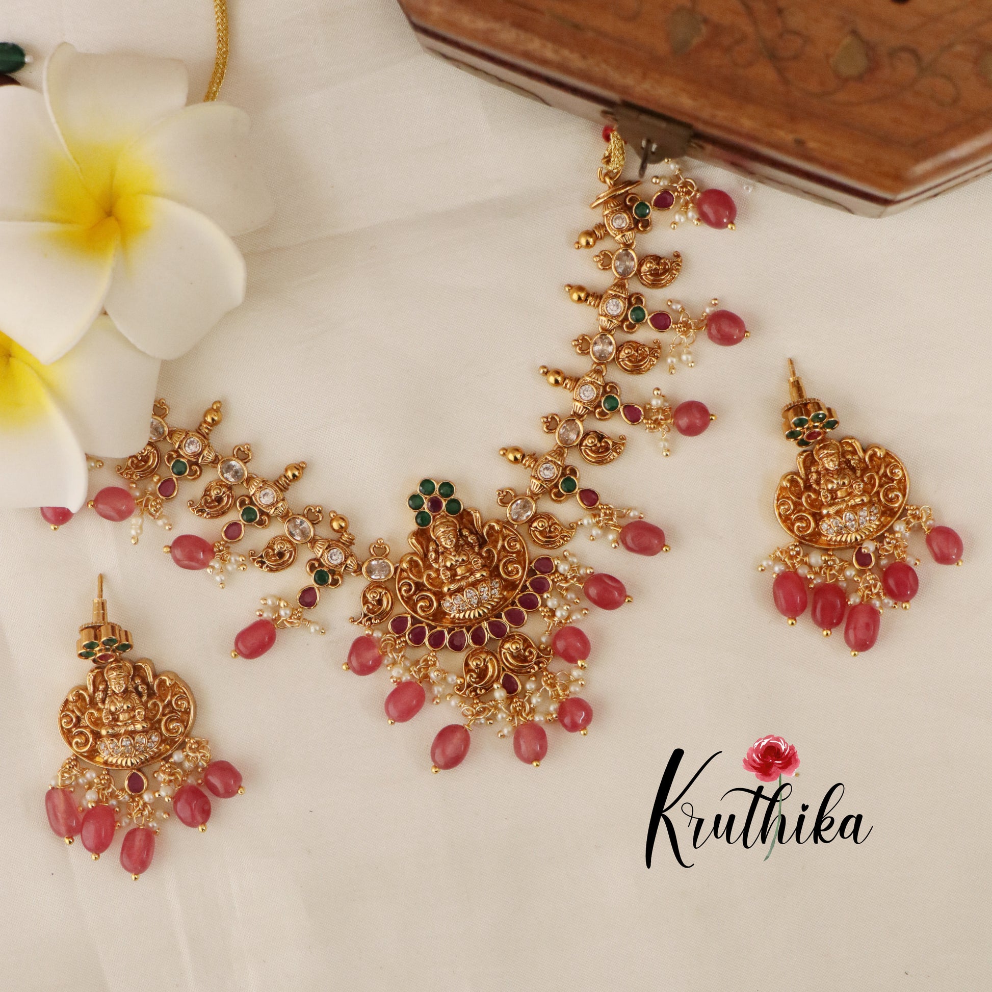 Enhance your style with our stunning, Pretty Gold like finish Laxmi Necklace paired perfectly with matching earrings. Crafted with high-quality stones & beads, this set combines timeless elegance with a modern touch. Ideal for special occasions or adding a touch of glamour to your look.