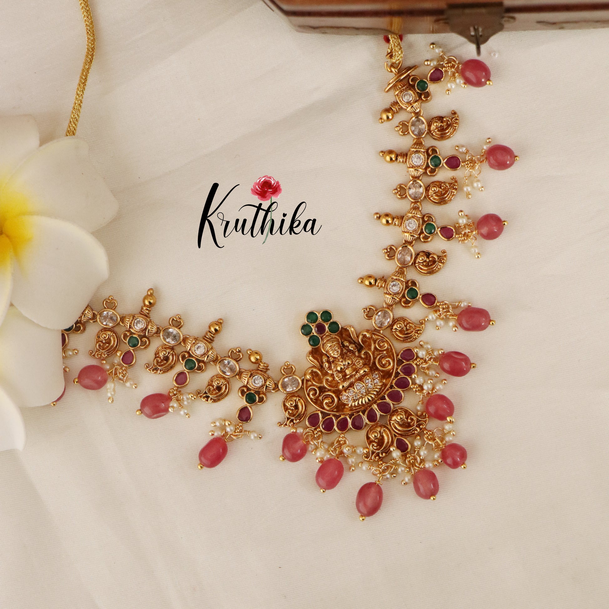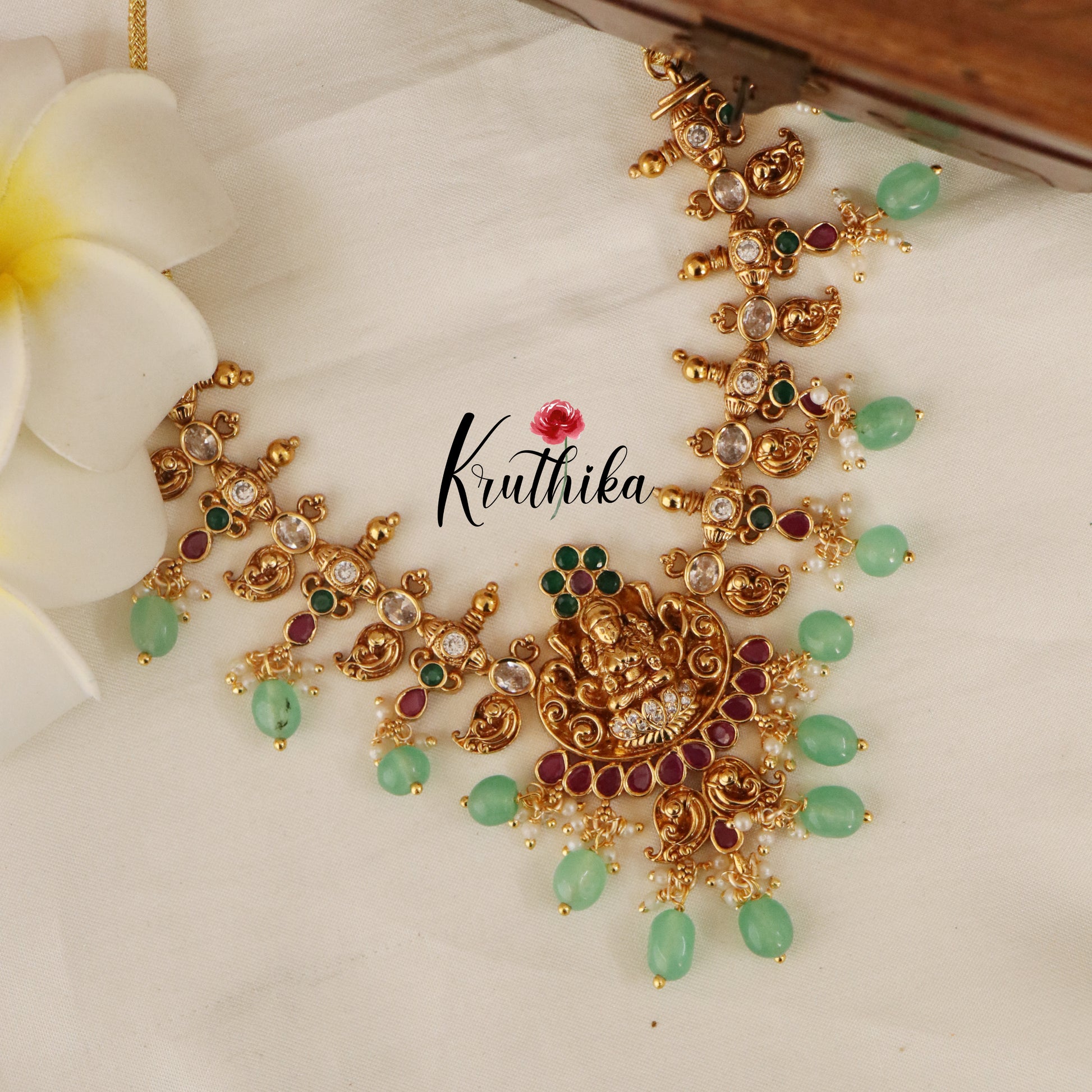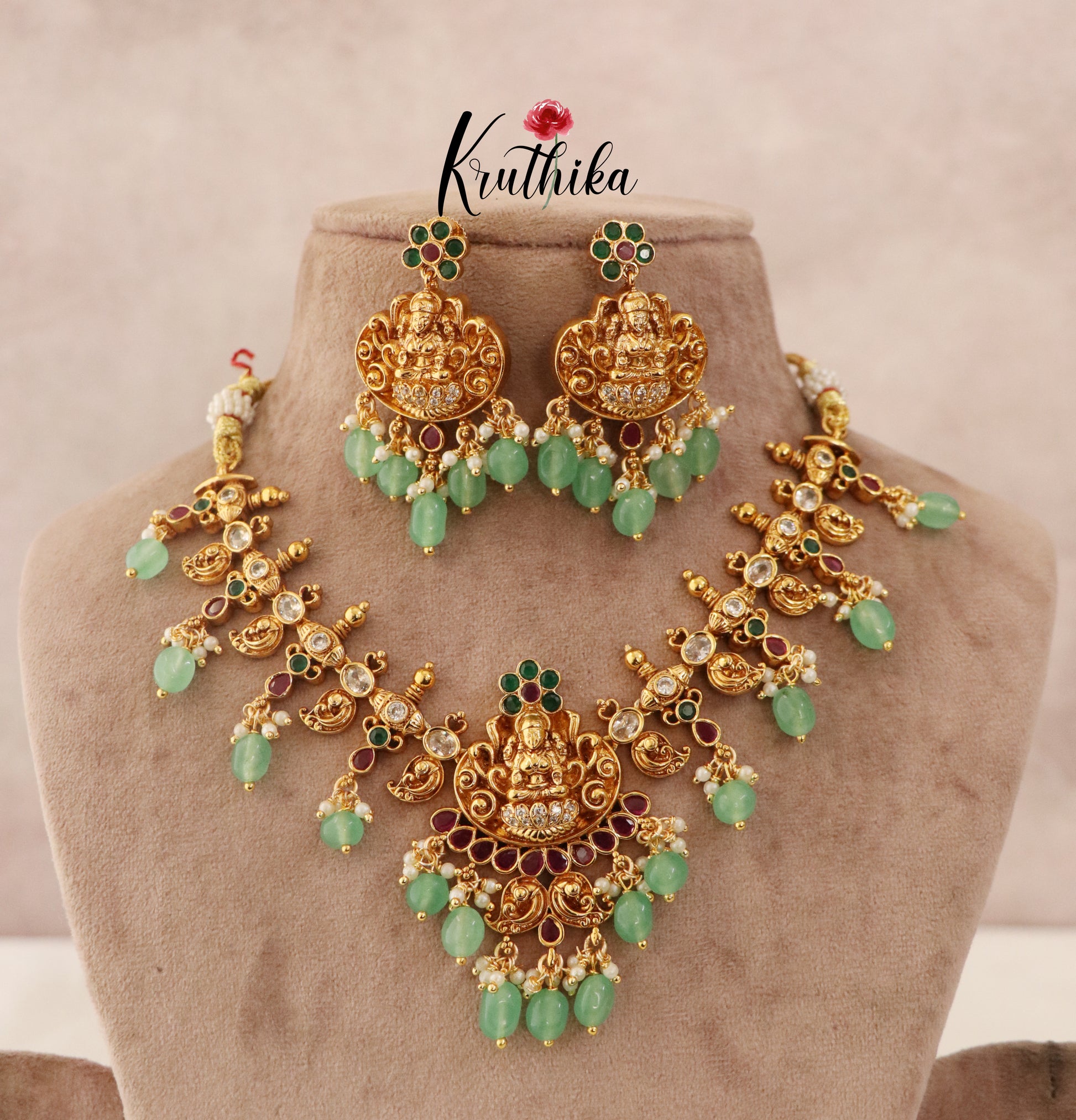 Enhance your style with our stunning, Pretty Gold like finish Laxmi Necklace paired perfectly with matching earrings. Crafted with high-quality stones & beads, this set combines timeless elegance with a modern touch. Ideal for special occasions or adding a touch of glamour to your look.