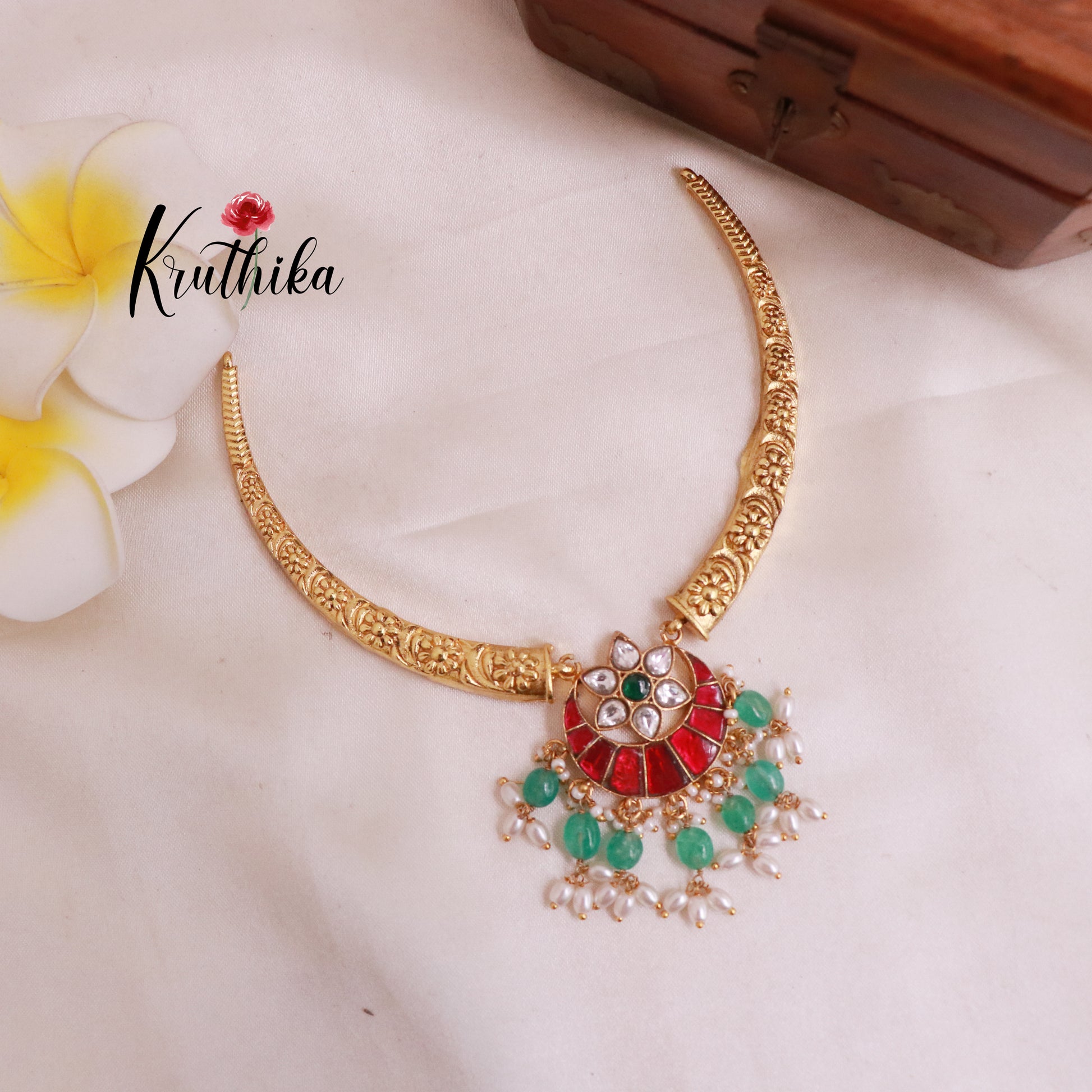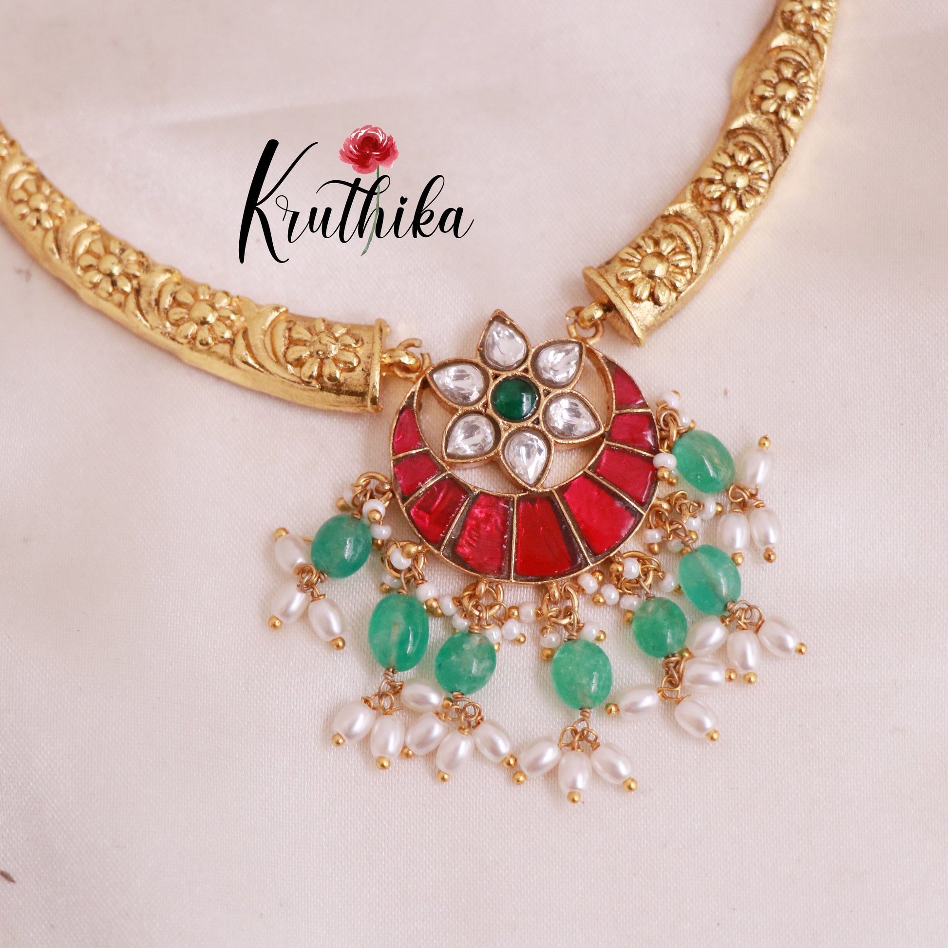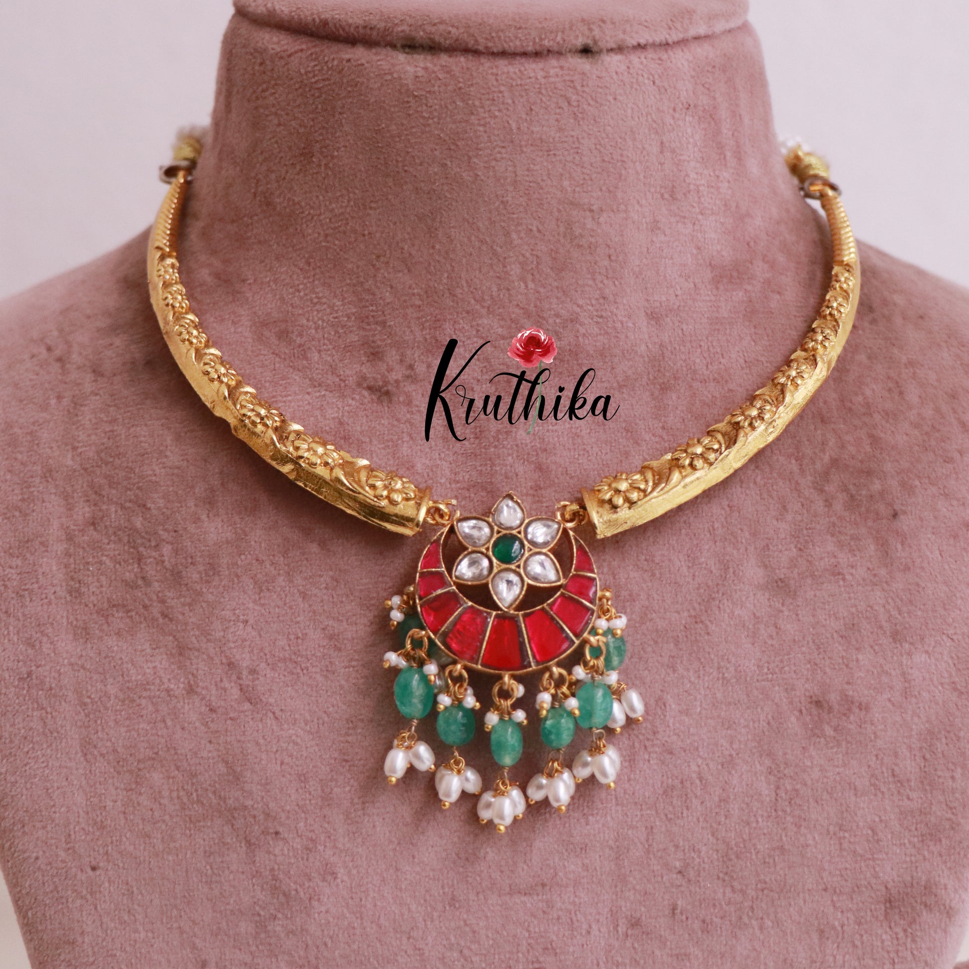 Enhance your style with our stunning, Pretty Jadau Hasli Necklace. Crafted with high-quality stones & beads, this set combines timeless elegance with a modern touch. Ideal for special occasions or adding a touch of glamour to your look.
