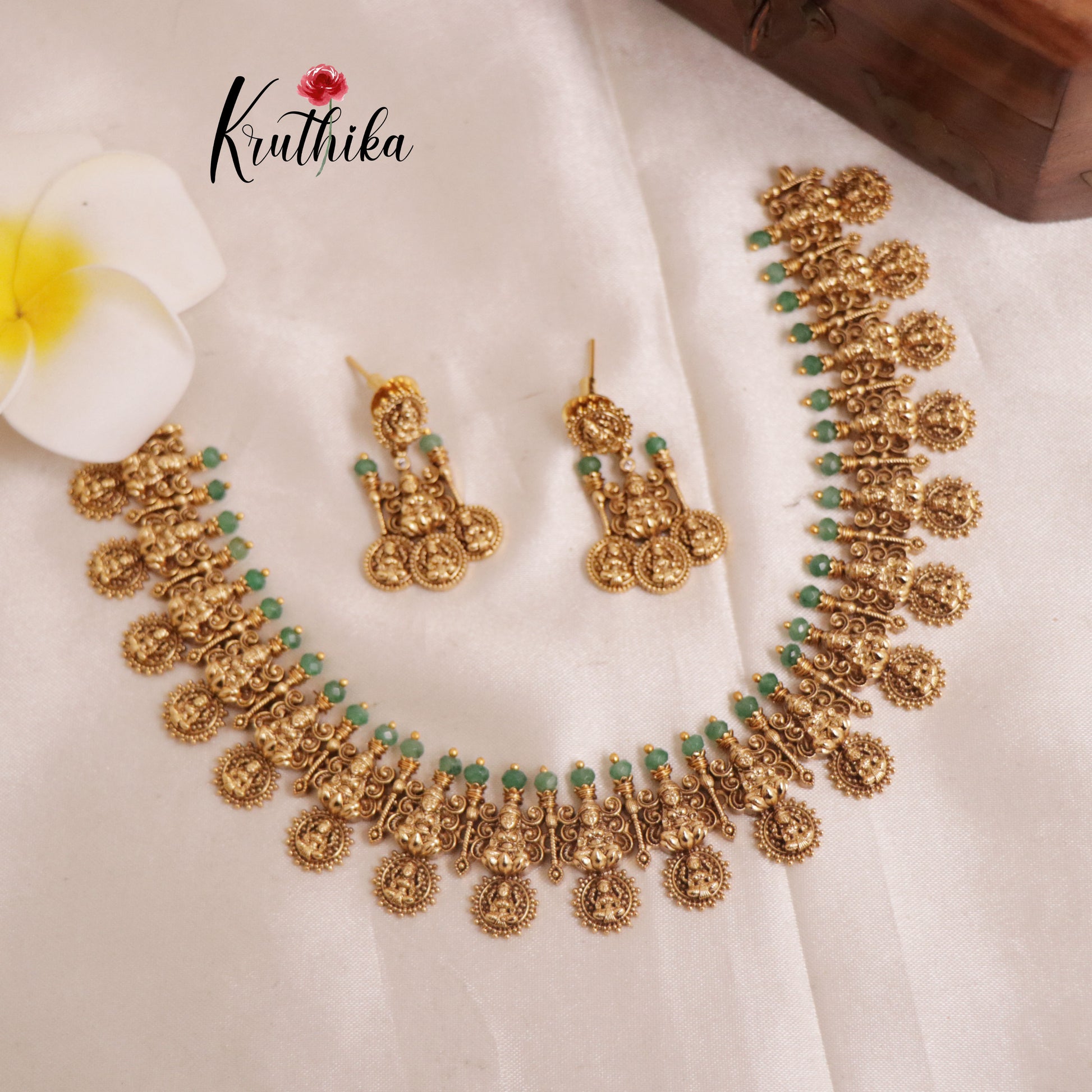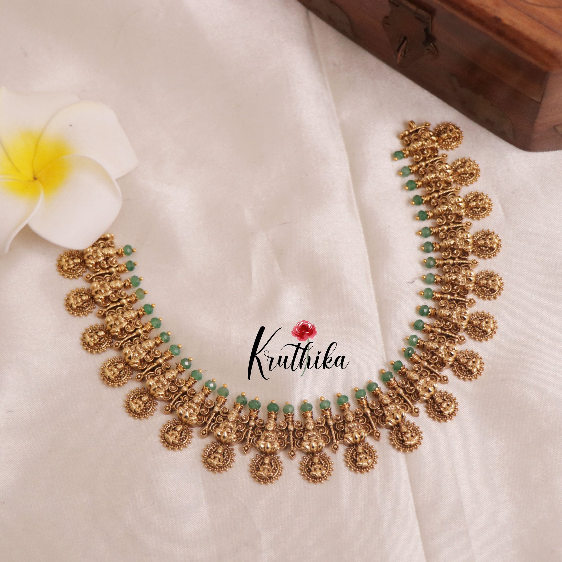 Enhance your style with our stunning, Pretty Lakshmi Coin/Bottu Mala Necklace. paired perfectly with matching earrings. Crafted with high-quality stones & beads, this set combines timeless elegance with a modern touch. Ideal for special occasions or adding a touch of glamour to your look.