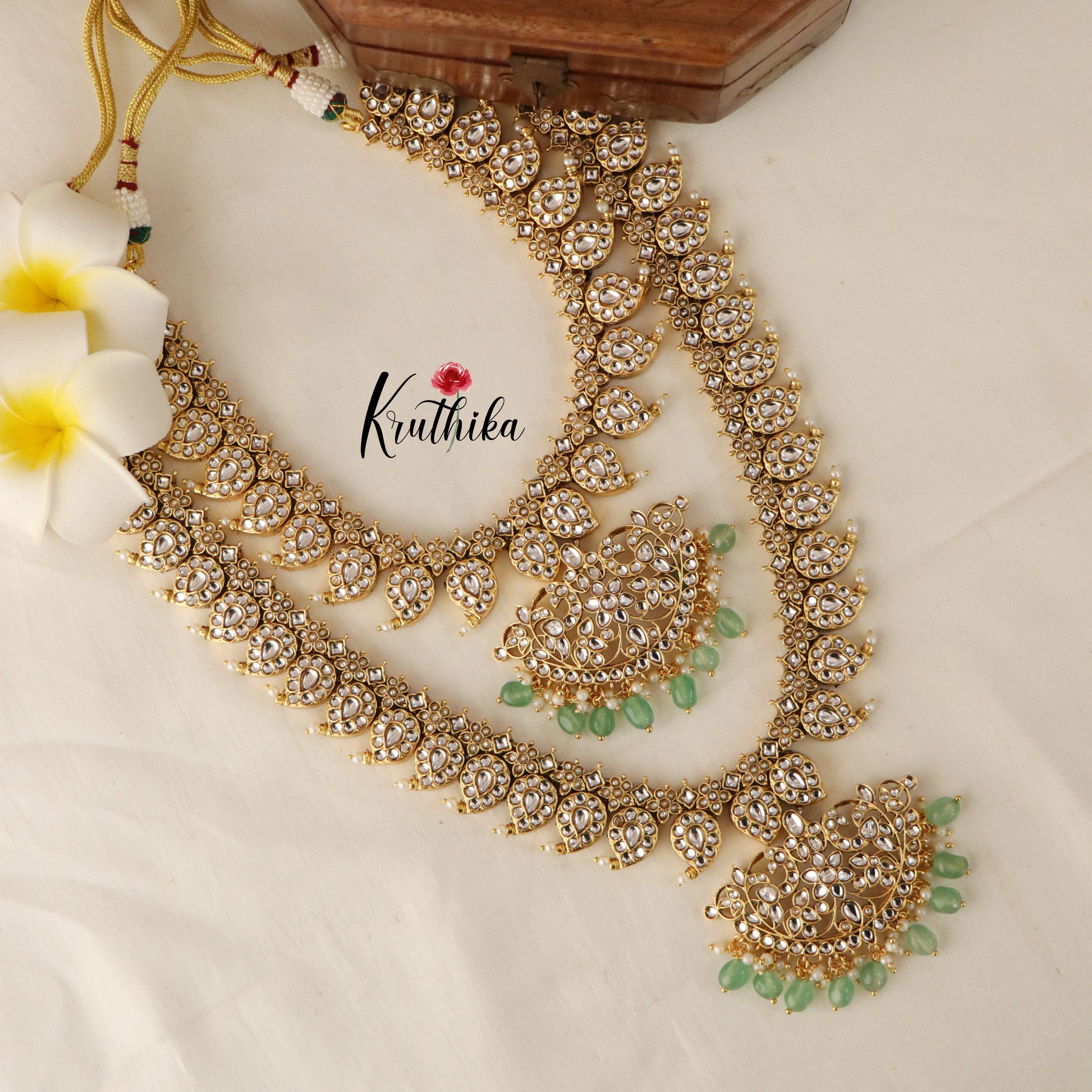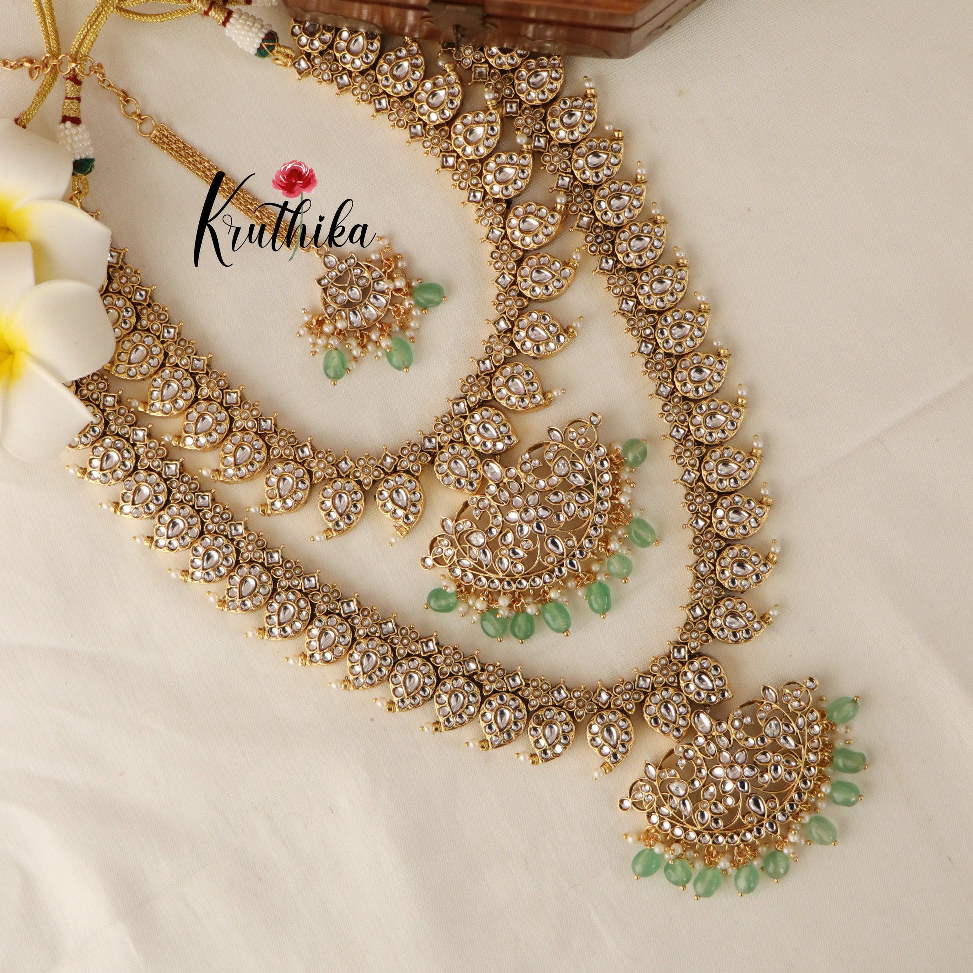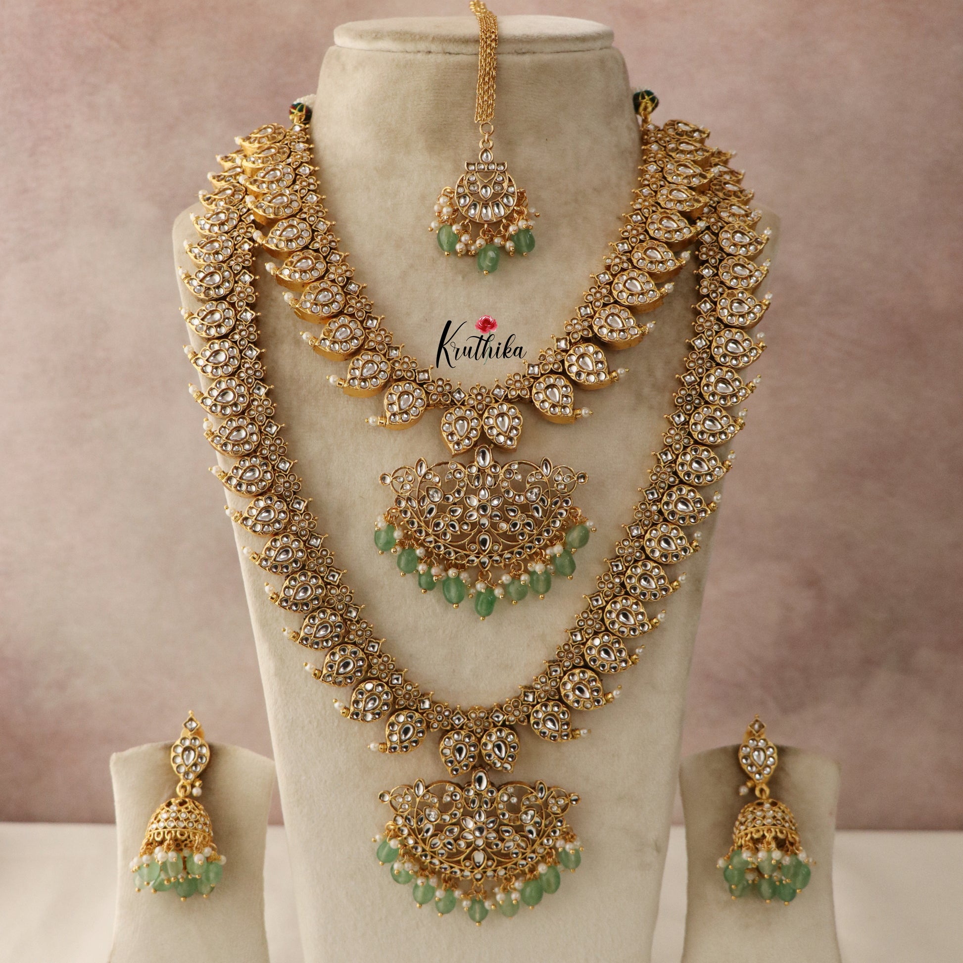 Includes - Necklace, Haaram, one pair of earrings, one maang tika
