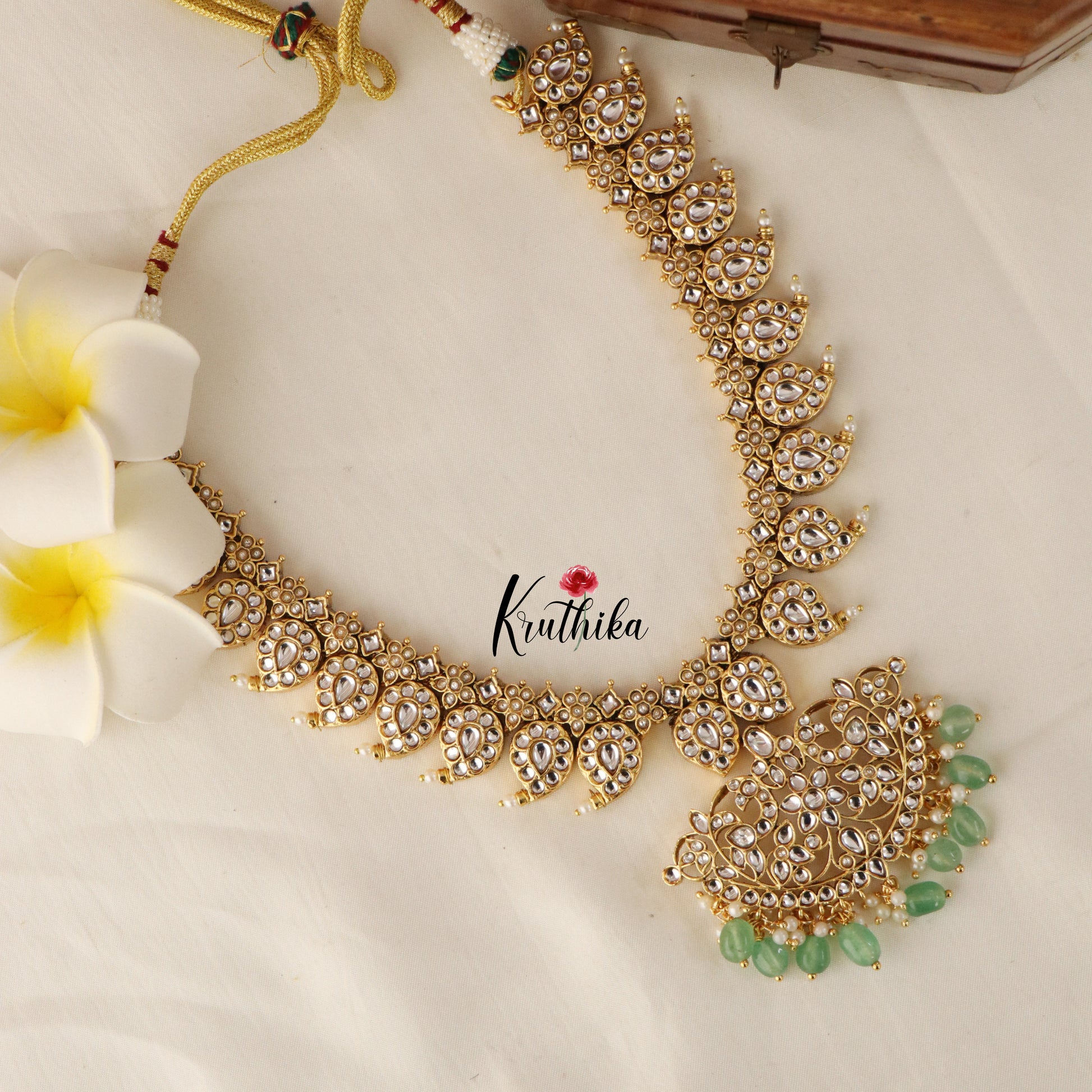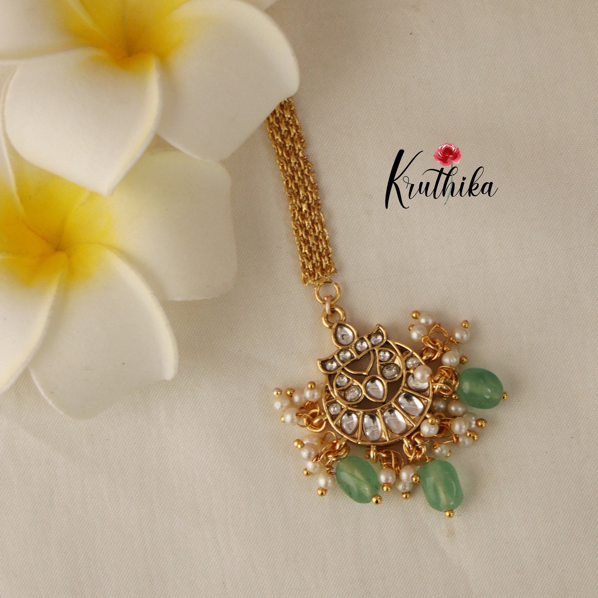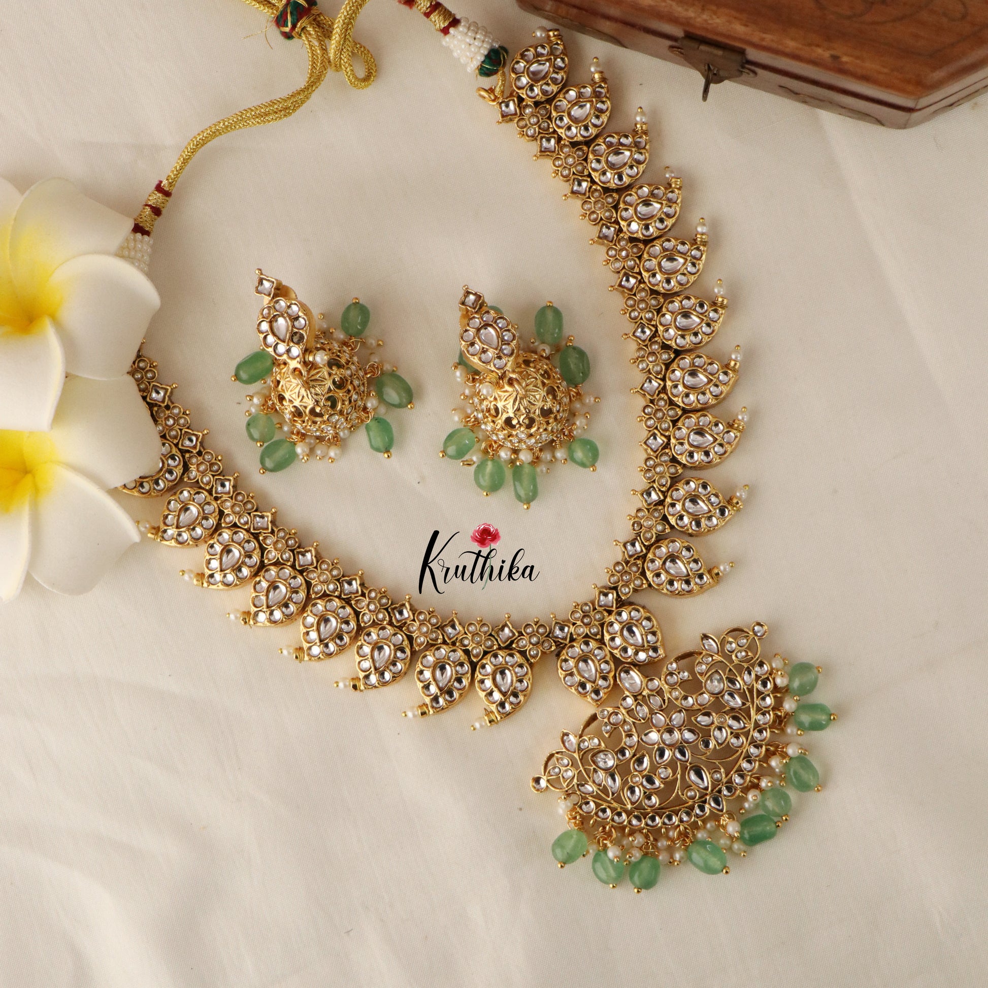 Includes - Necklace, Haaram, one pair of earrings, one maang tika