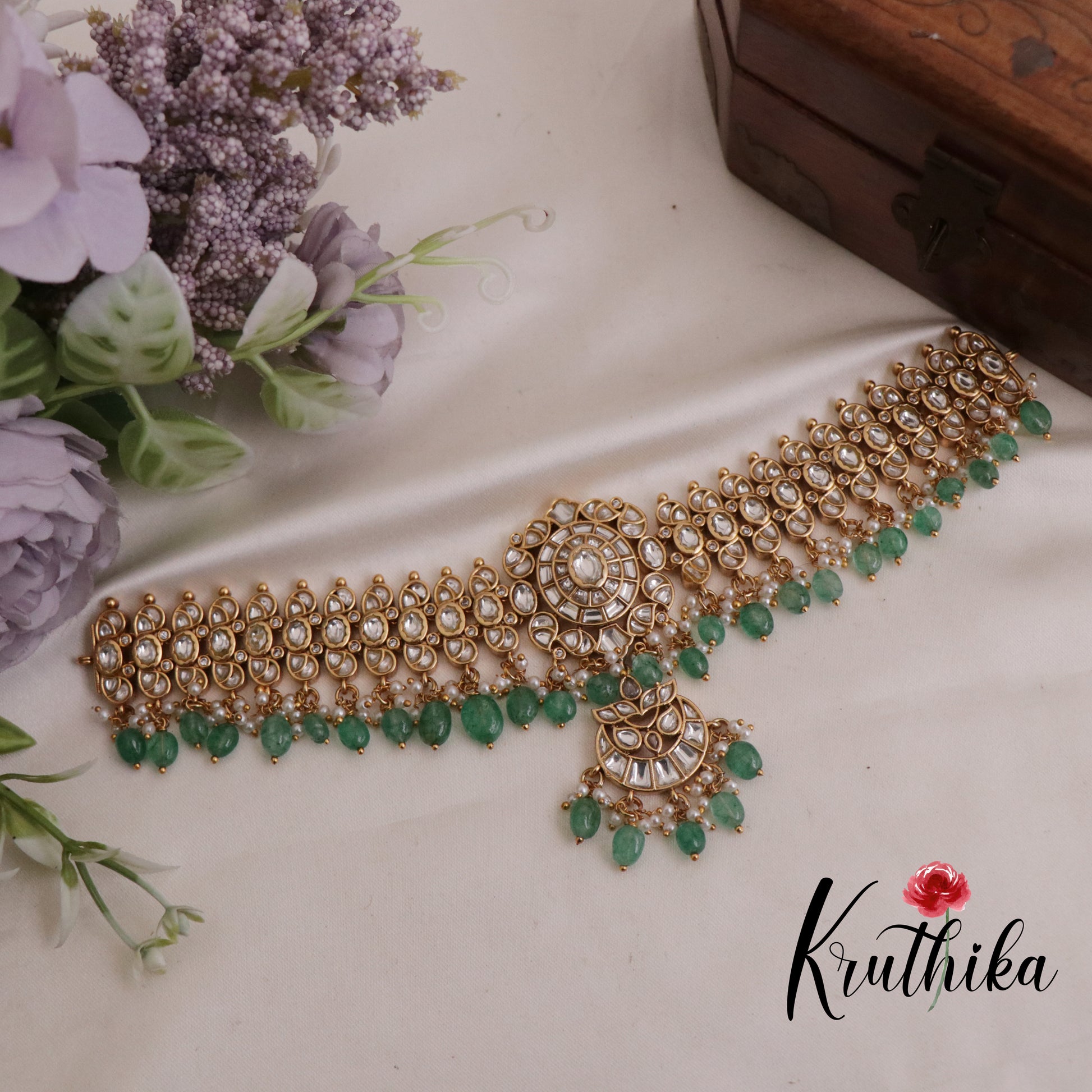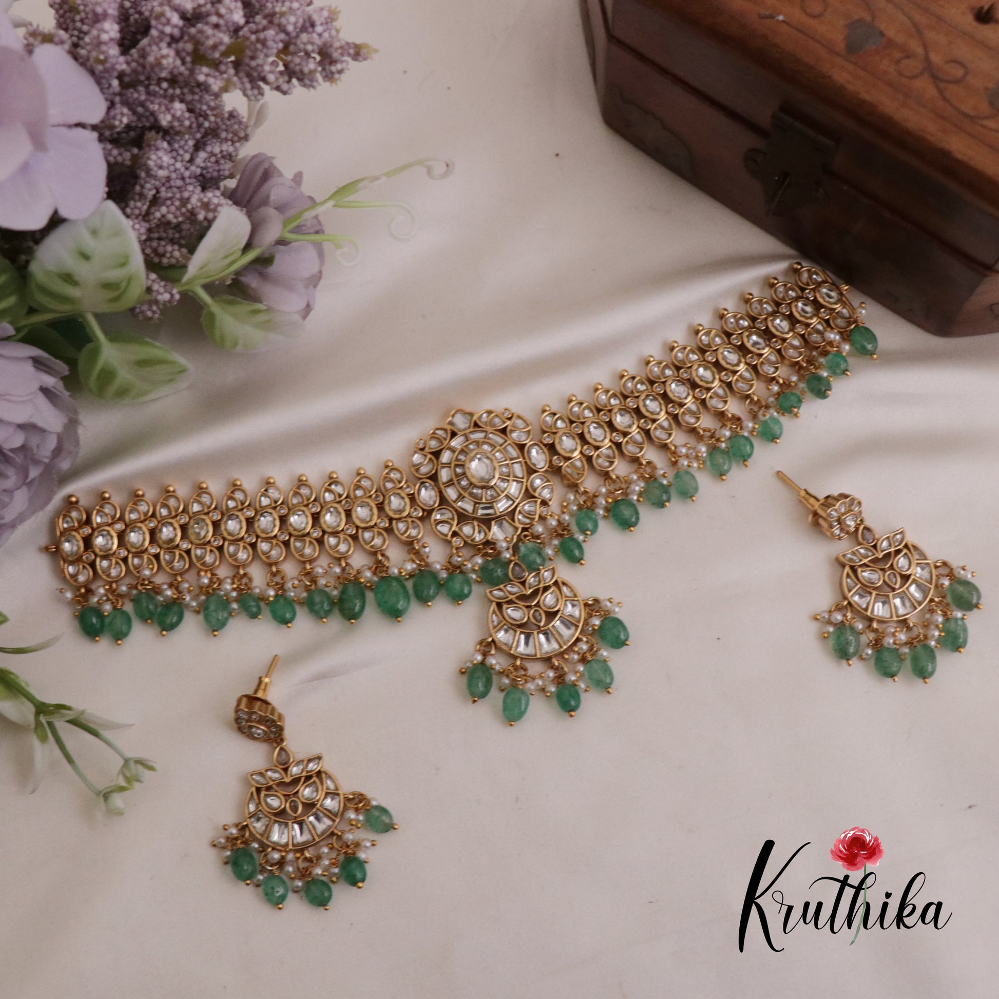 Enhance your style with our stunning Royal Antique Jadau Bridal Choker with with Emerald Beads Drops paired perfectly with matching earrings. Crafted with high-quality stones & beads, this set combines timeless elegance with a modern touch. Ideal for special occasions or adding a touch of glamour to your look.