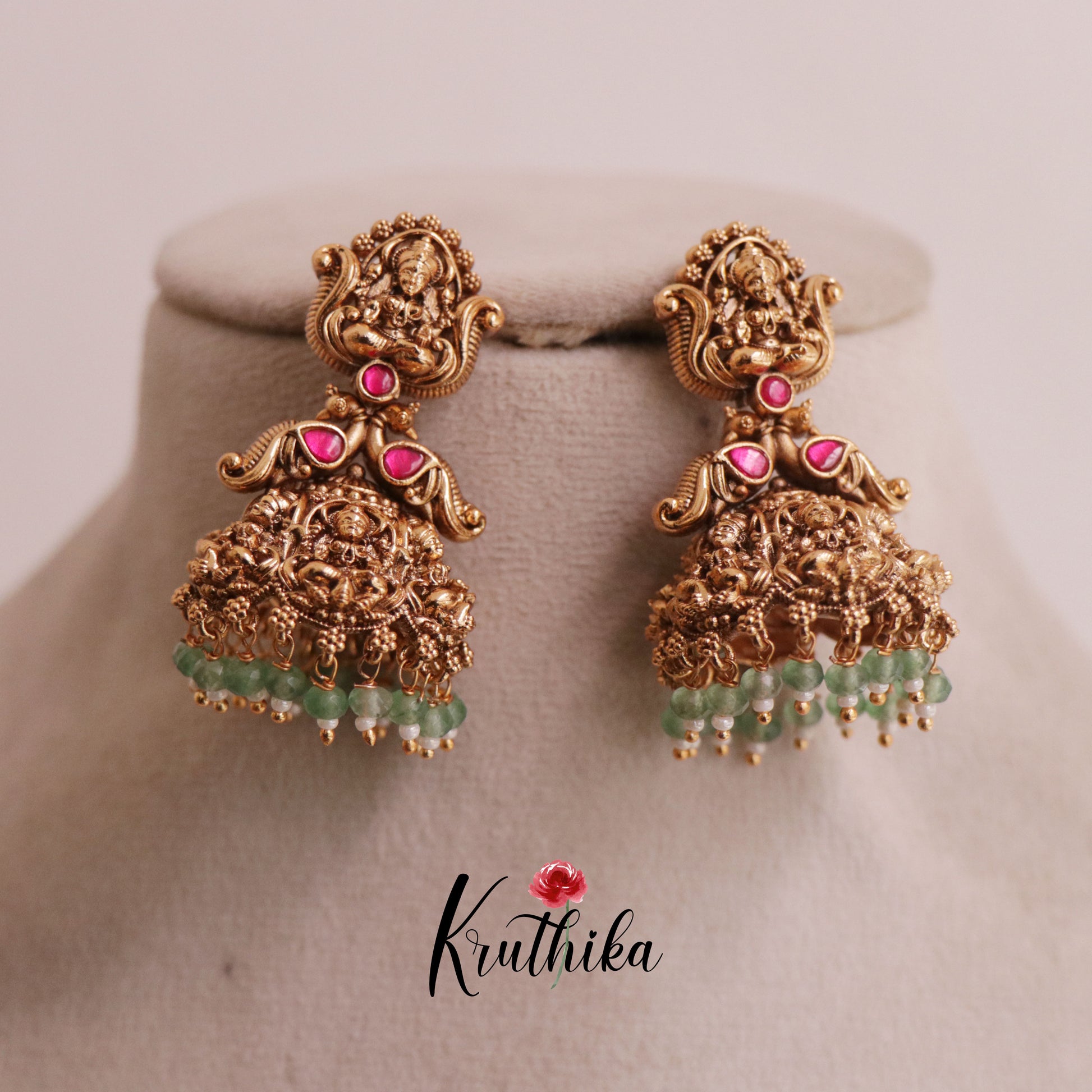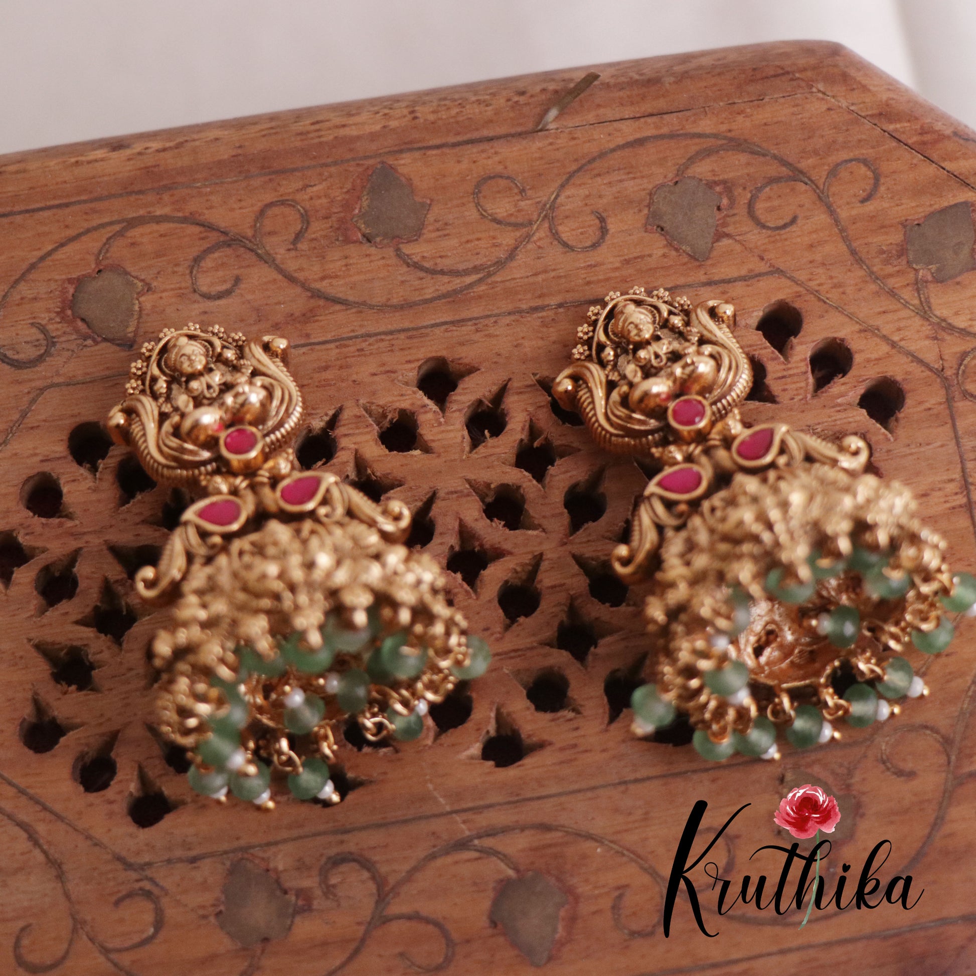 Royal Lakshmi Antique Jadau Jhumkas with Pastel Green Beads E487