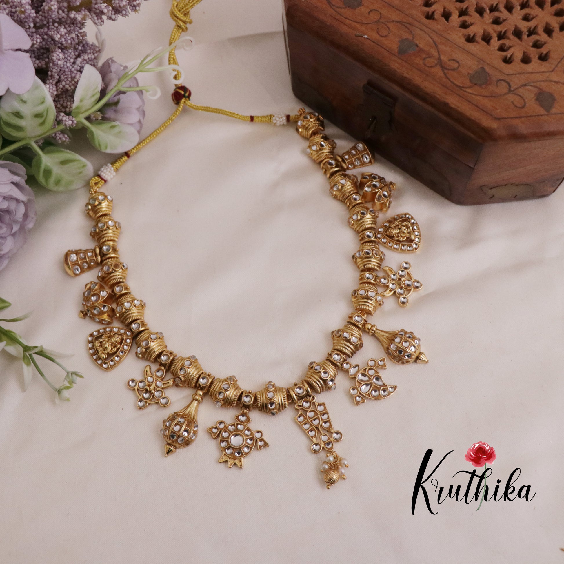 Enhance your style with our stunnin Royal Antique Kundan Charm Necklace Set paired perfectly with matching earrings. Crafted with high-quality stones & beads, this set combines timeless elegance with a modern touch. Ideal for special occasions or adding a touch of glamour to your look.
