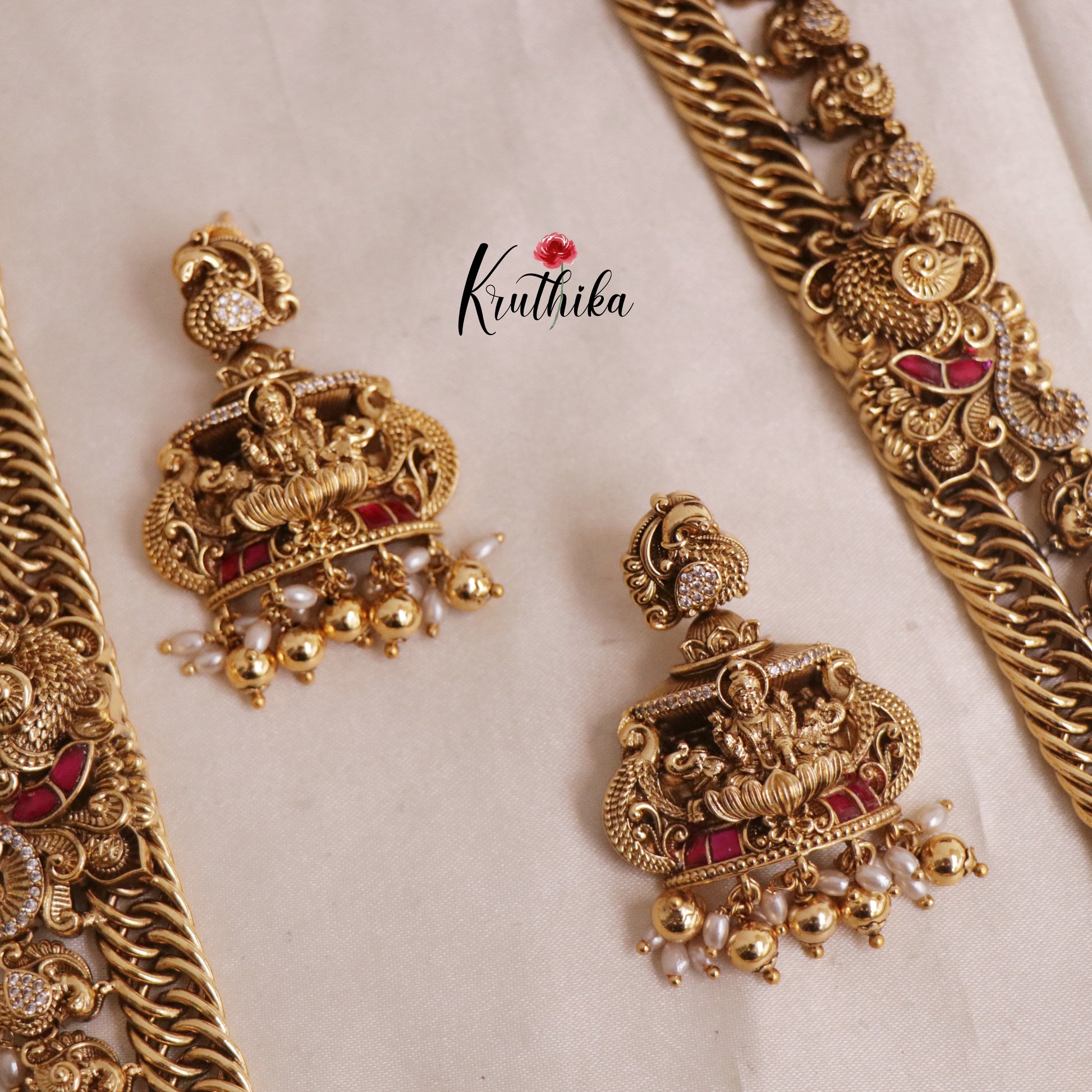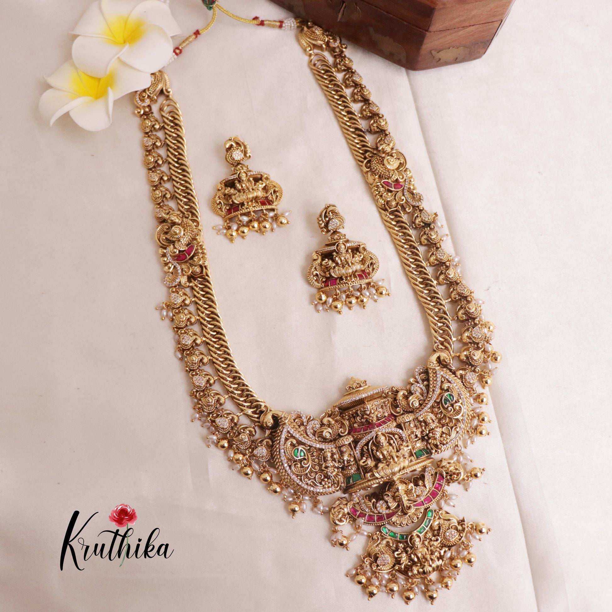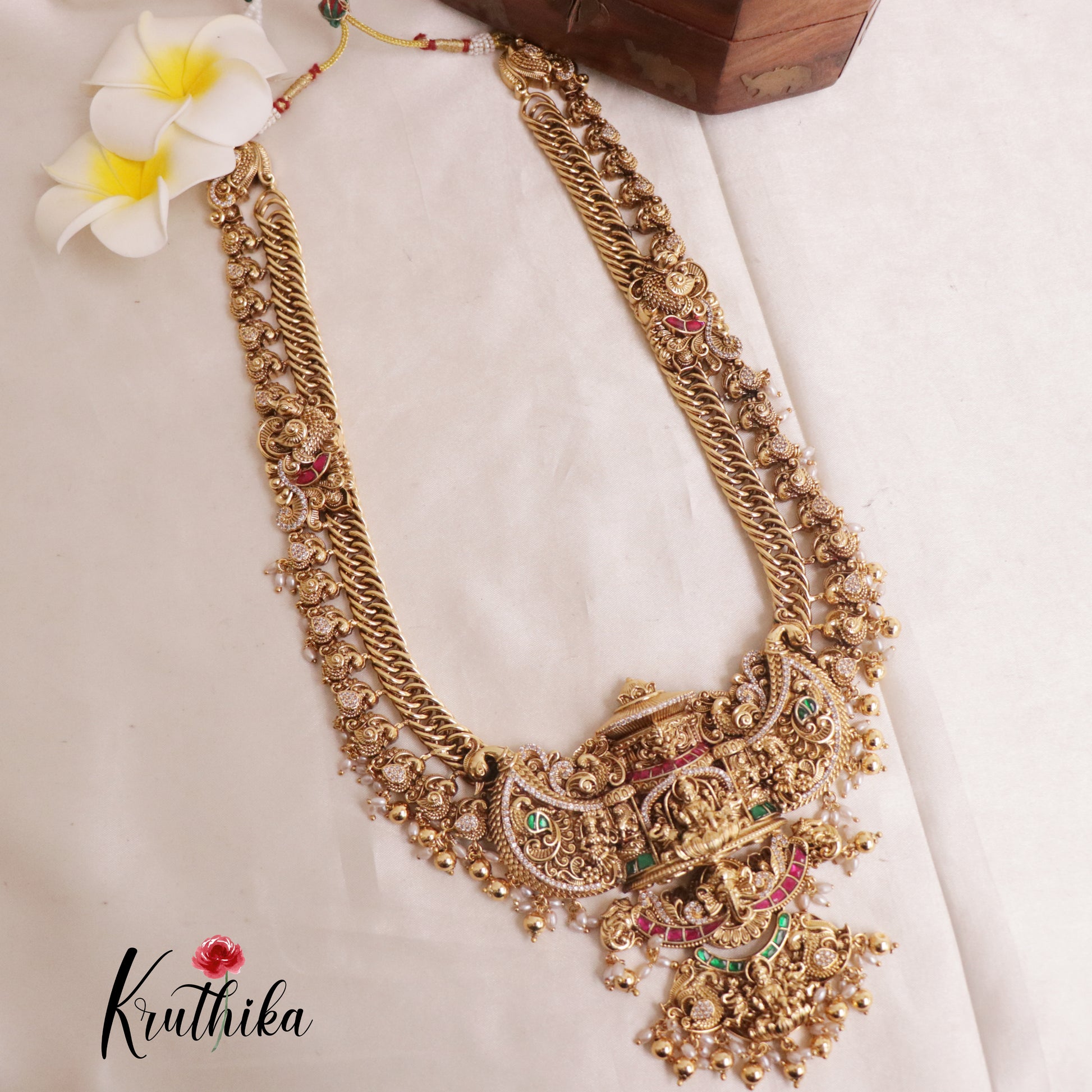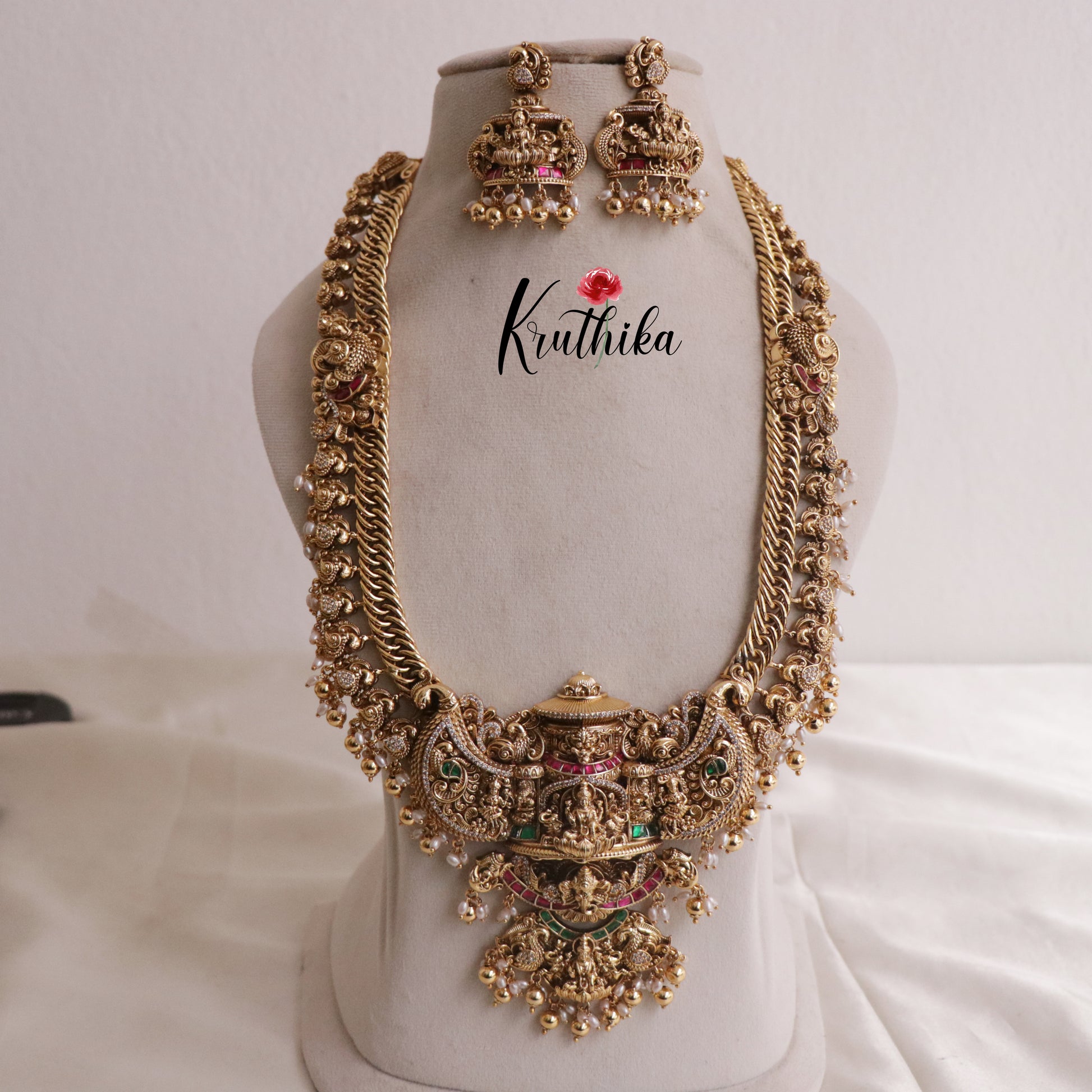 Enhance your style with our stunning, Royal Grand Nagas Jadau Temple Haram with golden Beads. Crafted with high-quality stones & beads, this set combines timeless elegance with a modern touch. Ideal for special occasions or adding a touch of glamour to your look.