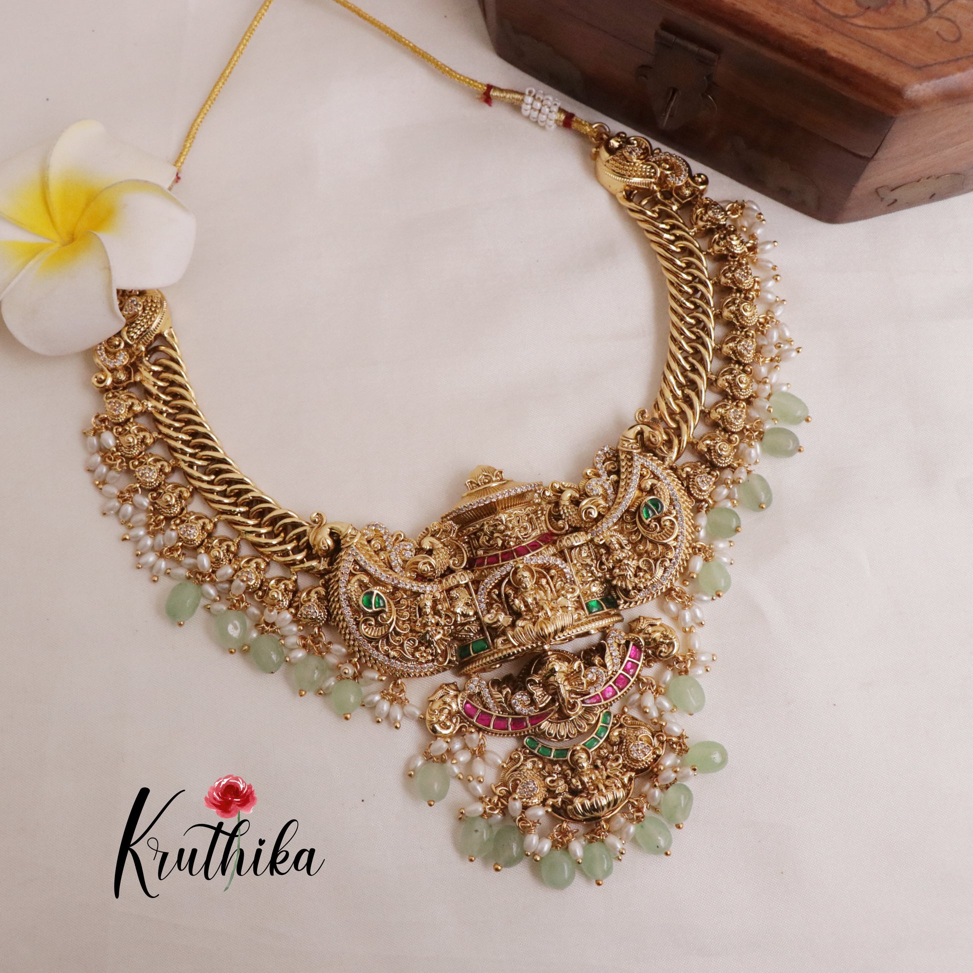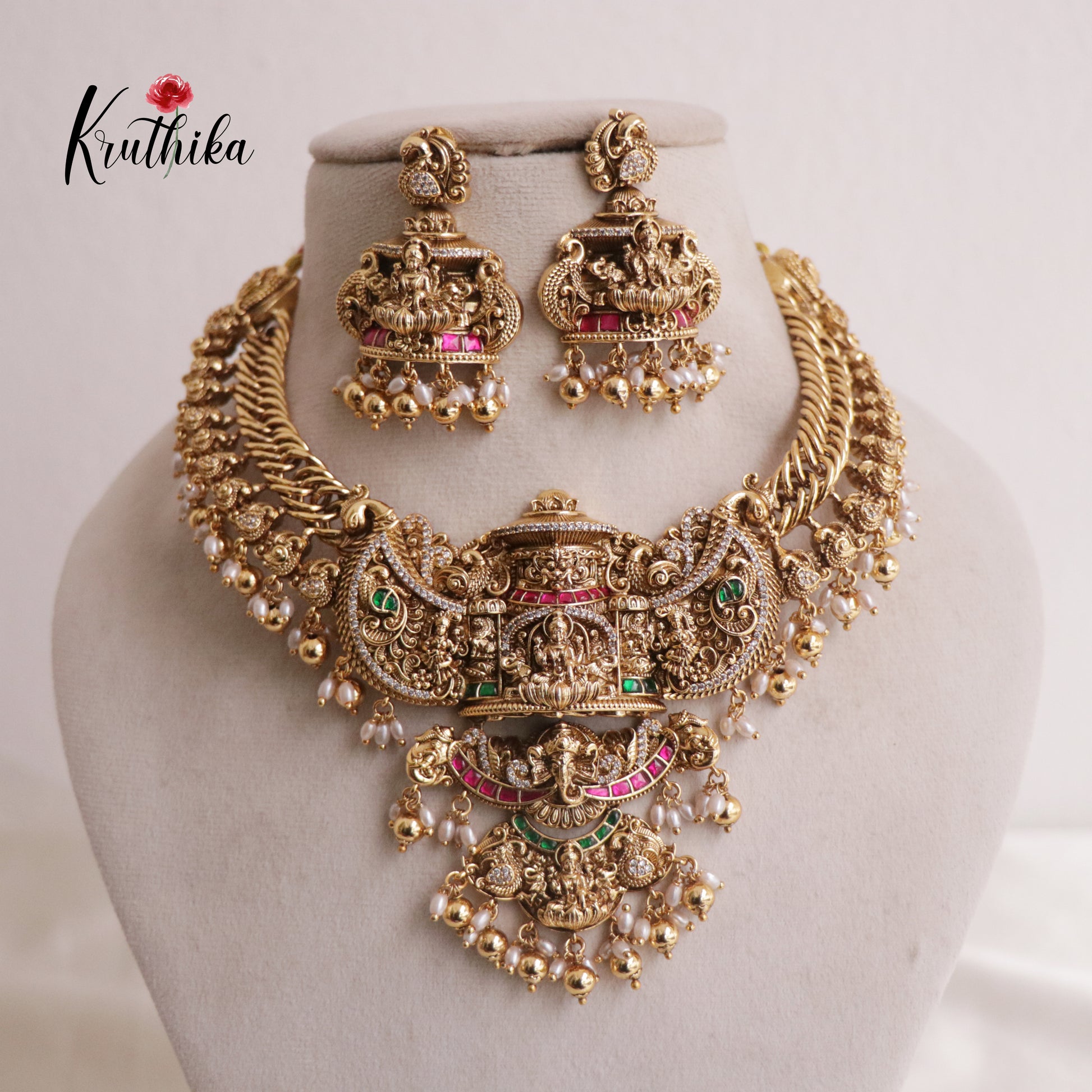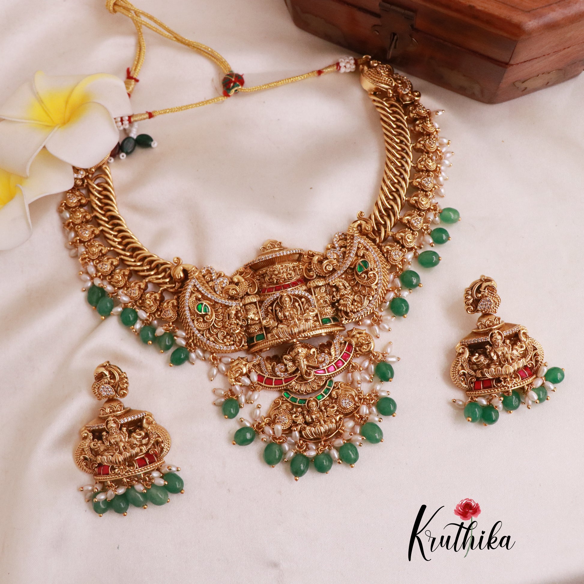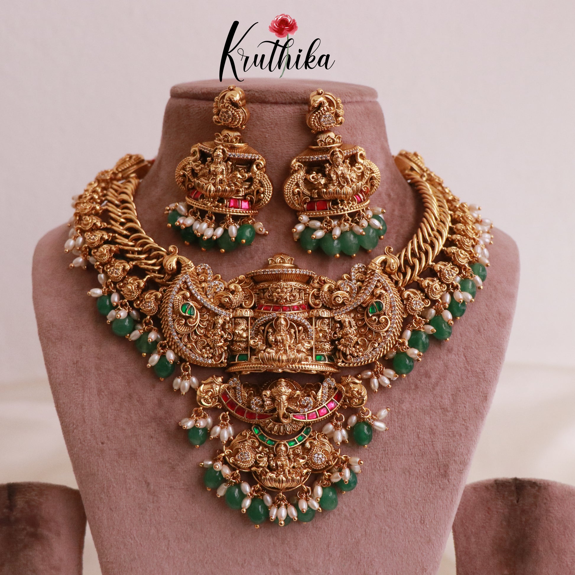 Enhance your style with our stunning, Royal Grand Nagas Jadau Temple necklace with Green Beads. Crafted with high-quality stones & beads, this set combines timeless elegance with a modern touch. Ideal for special occasions or adding a touch of glamour to your look.