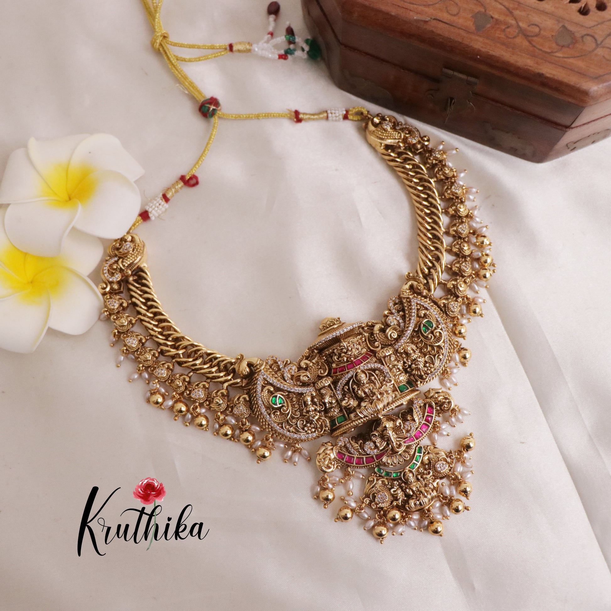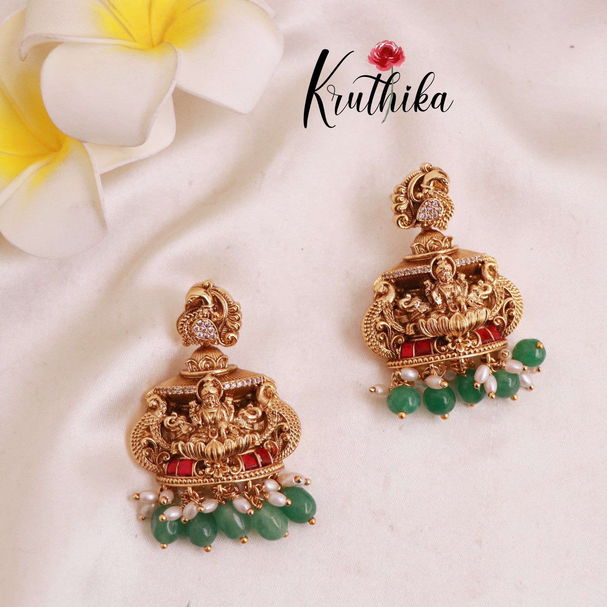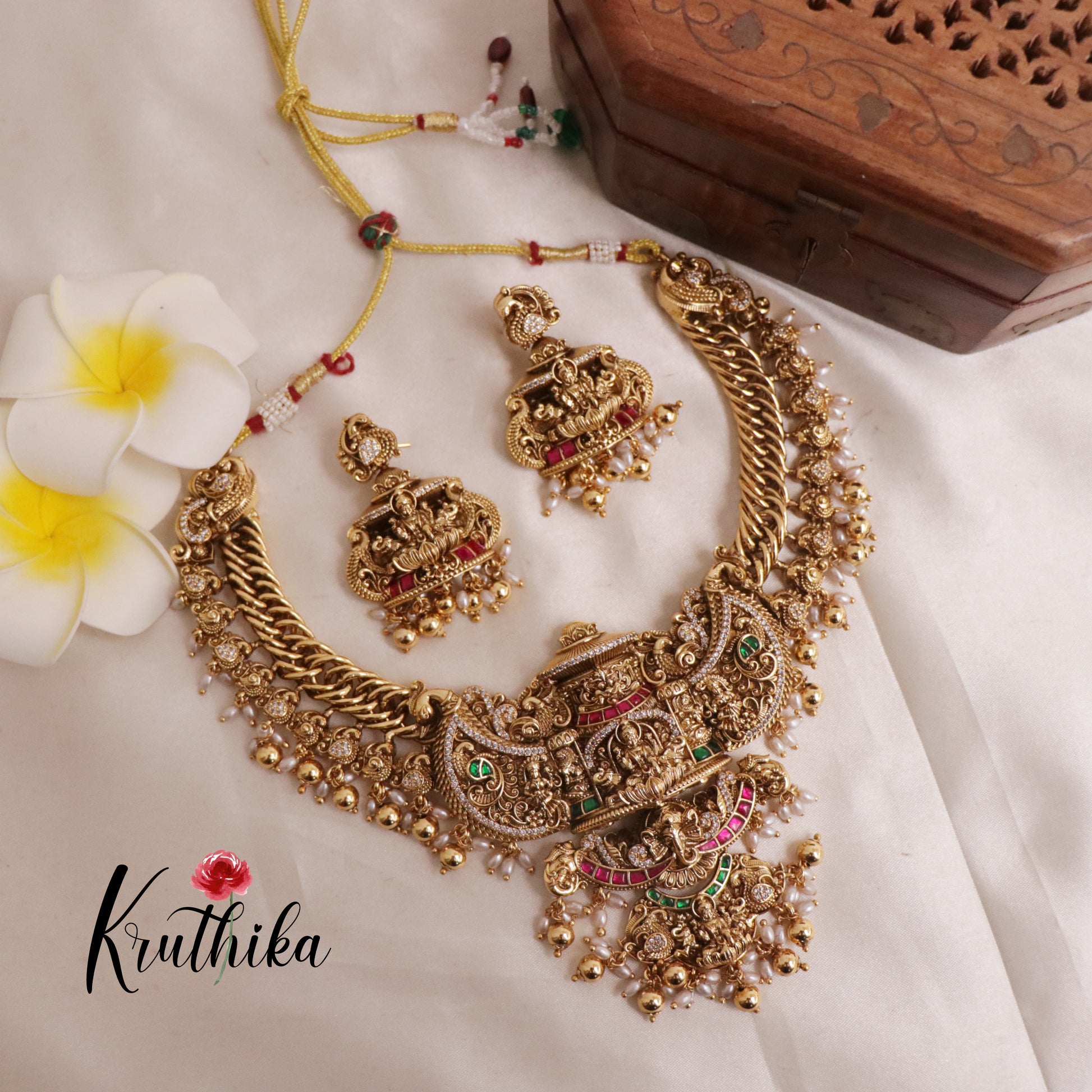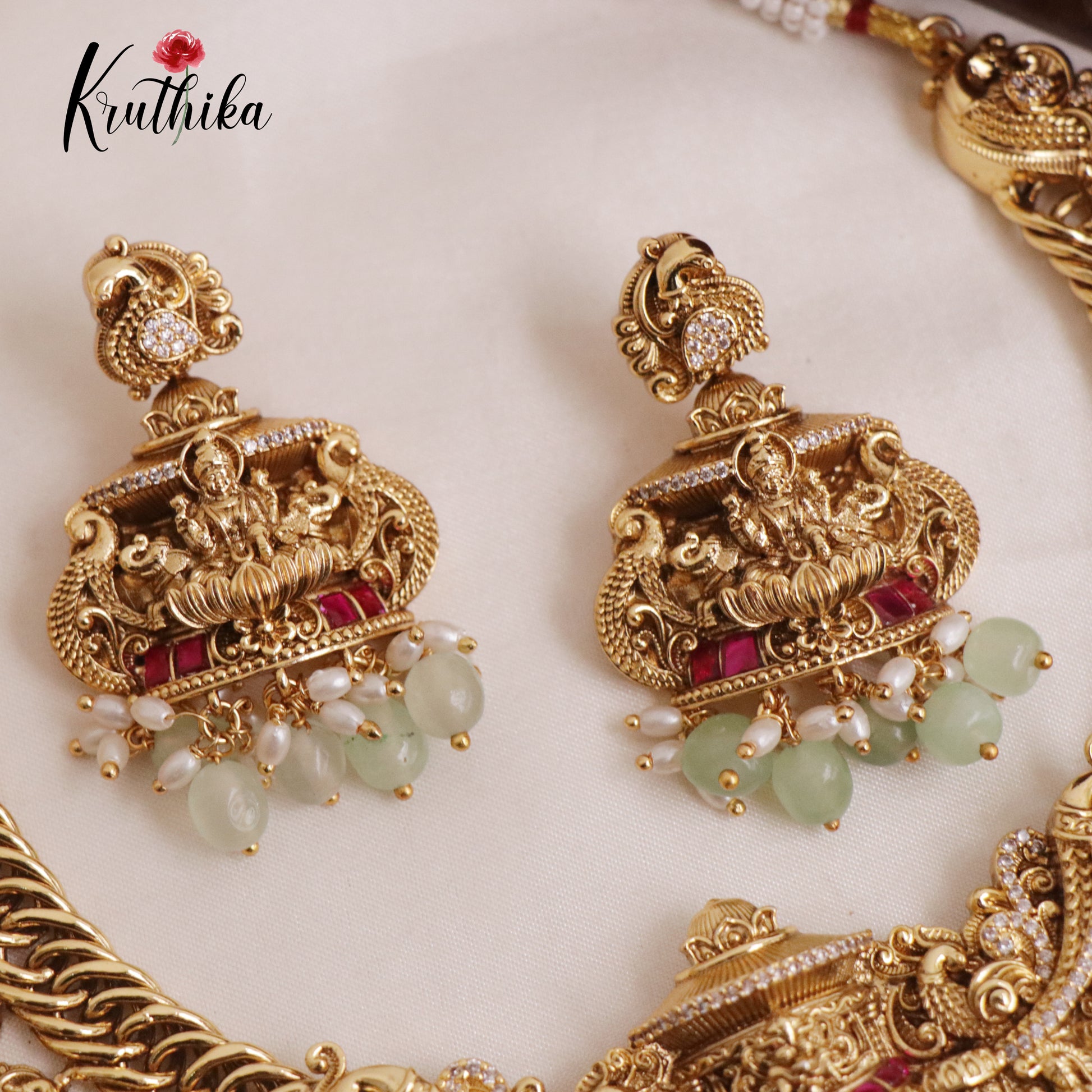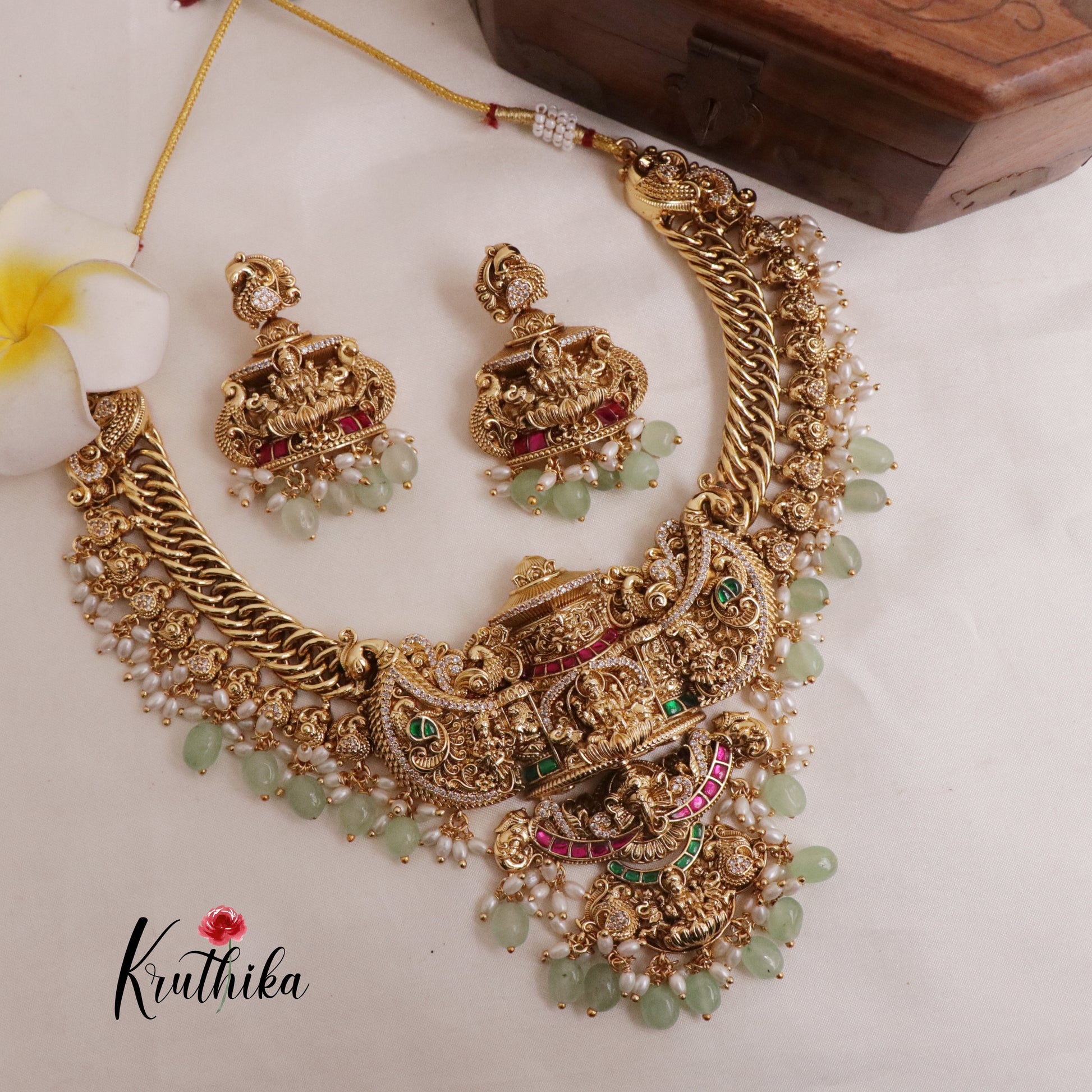 Enhance your style with our stunning, Royal Grand Nagas Jadau Temple necklace with Green Beads. Crafted with high-quality stones & beads, this set combines timeless elegance with a modern touch. Ideal for special occasions or adding a touch of glamour to your look.