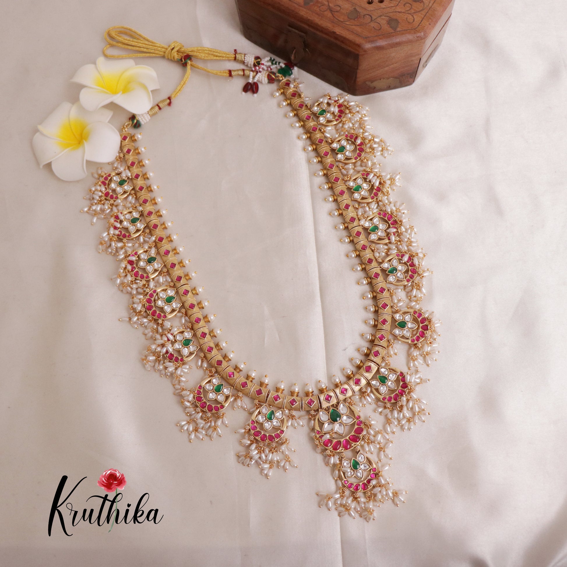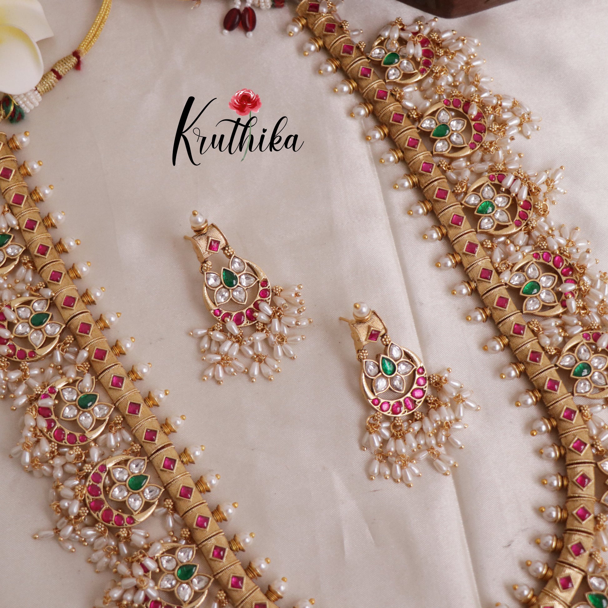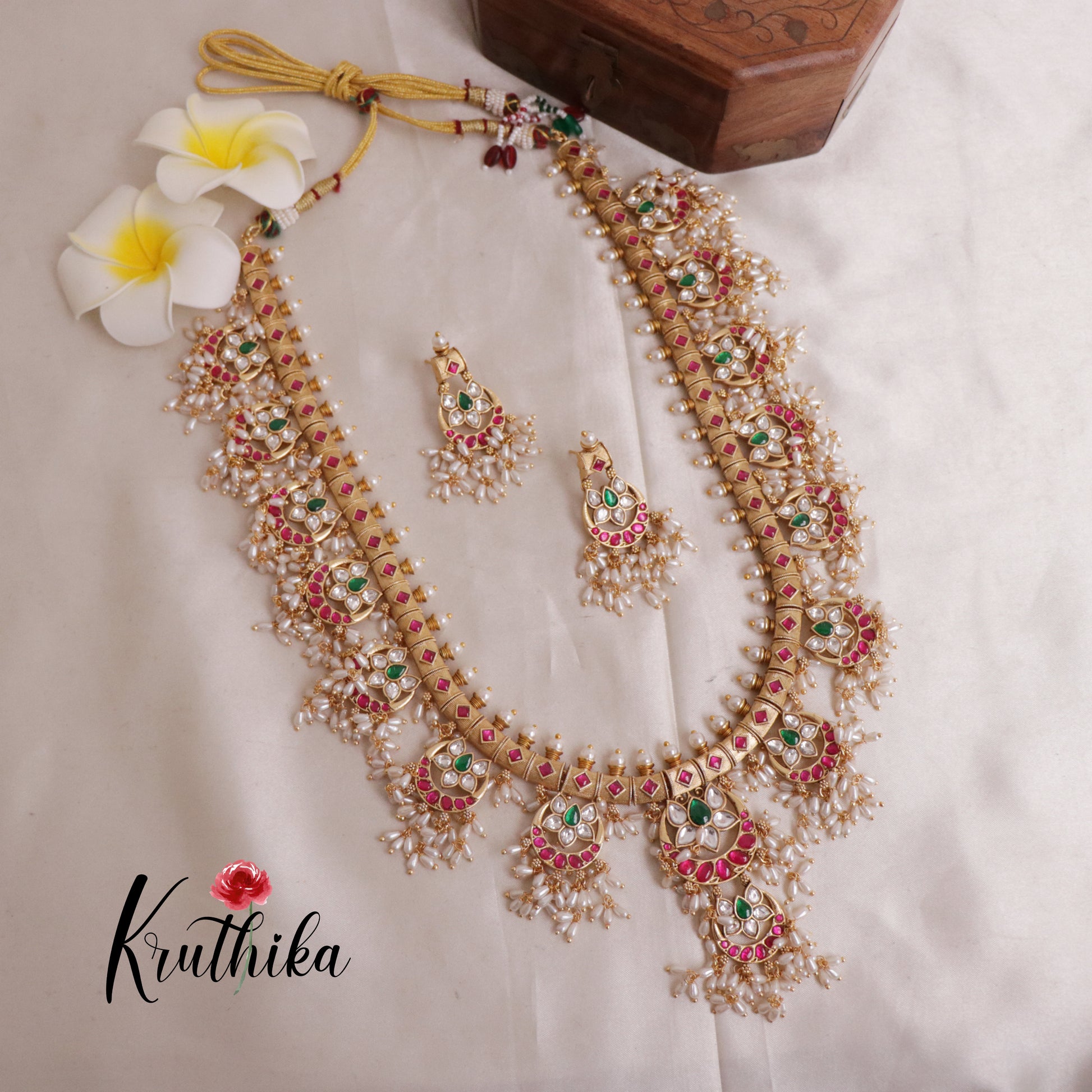 Enhance your style with our stunning, Royal Jadau Flower Haram, paired perfectly with matching earrings. Crafted with high-quality stones & beads, this set combines timeless elegance with a modern touch. Ideal for special occasions or adding a touch of glamour to your look.