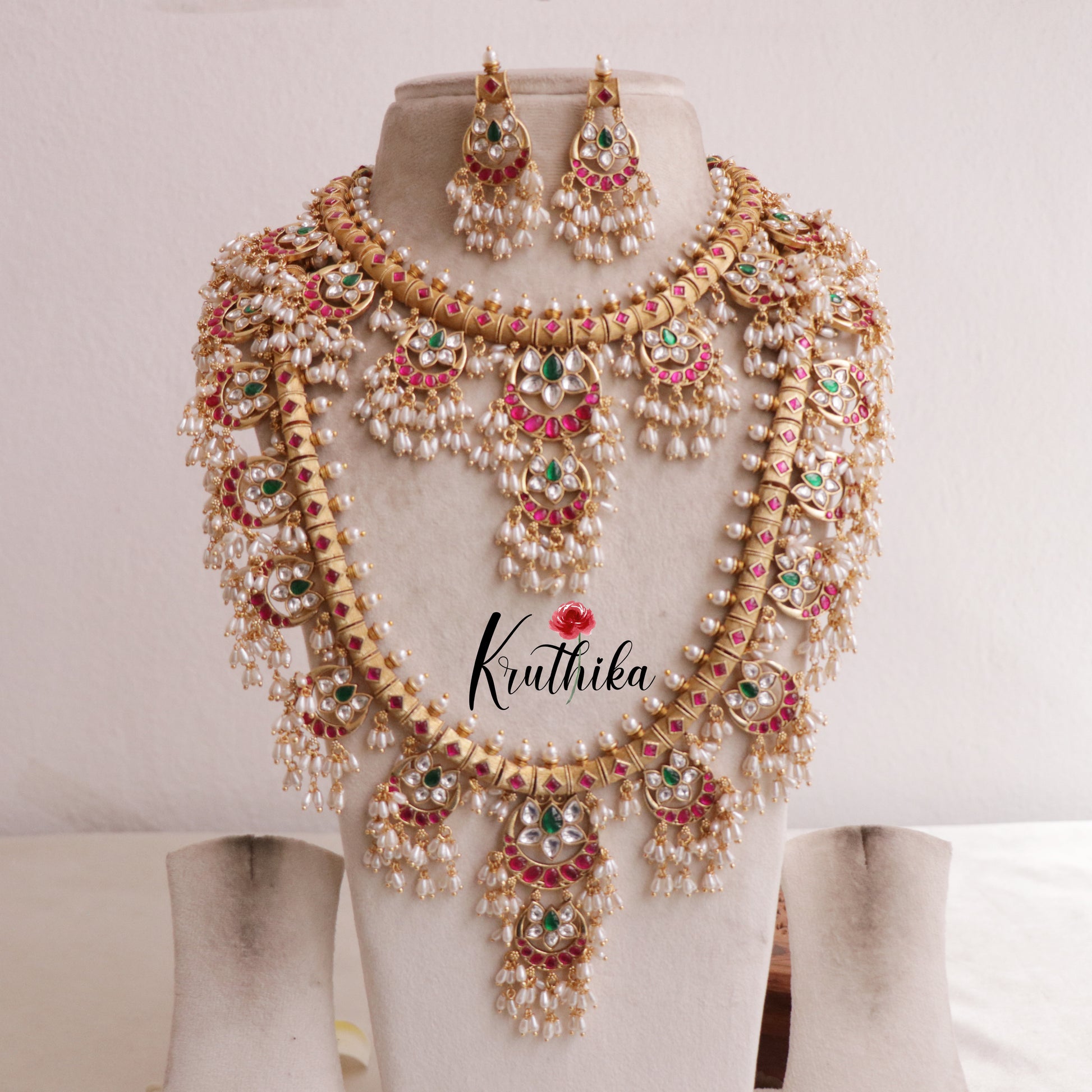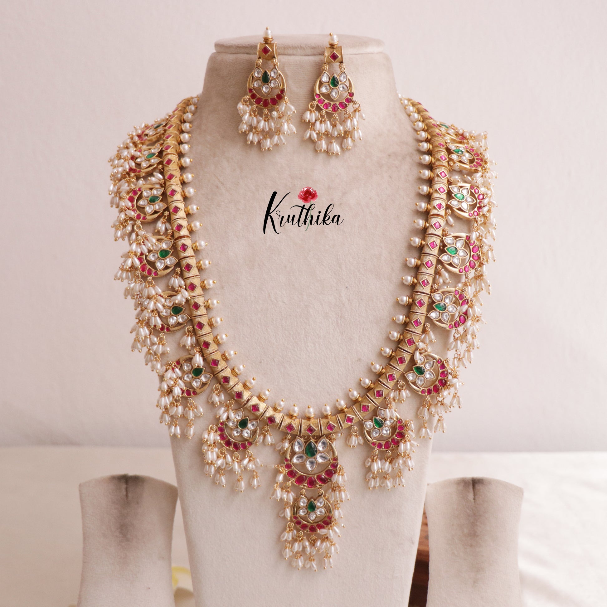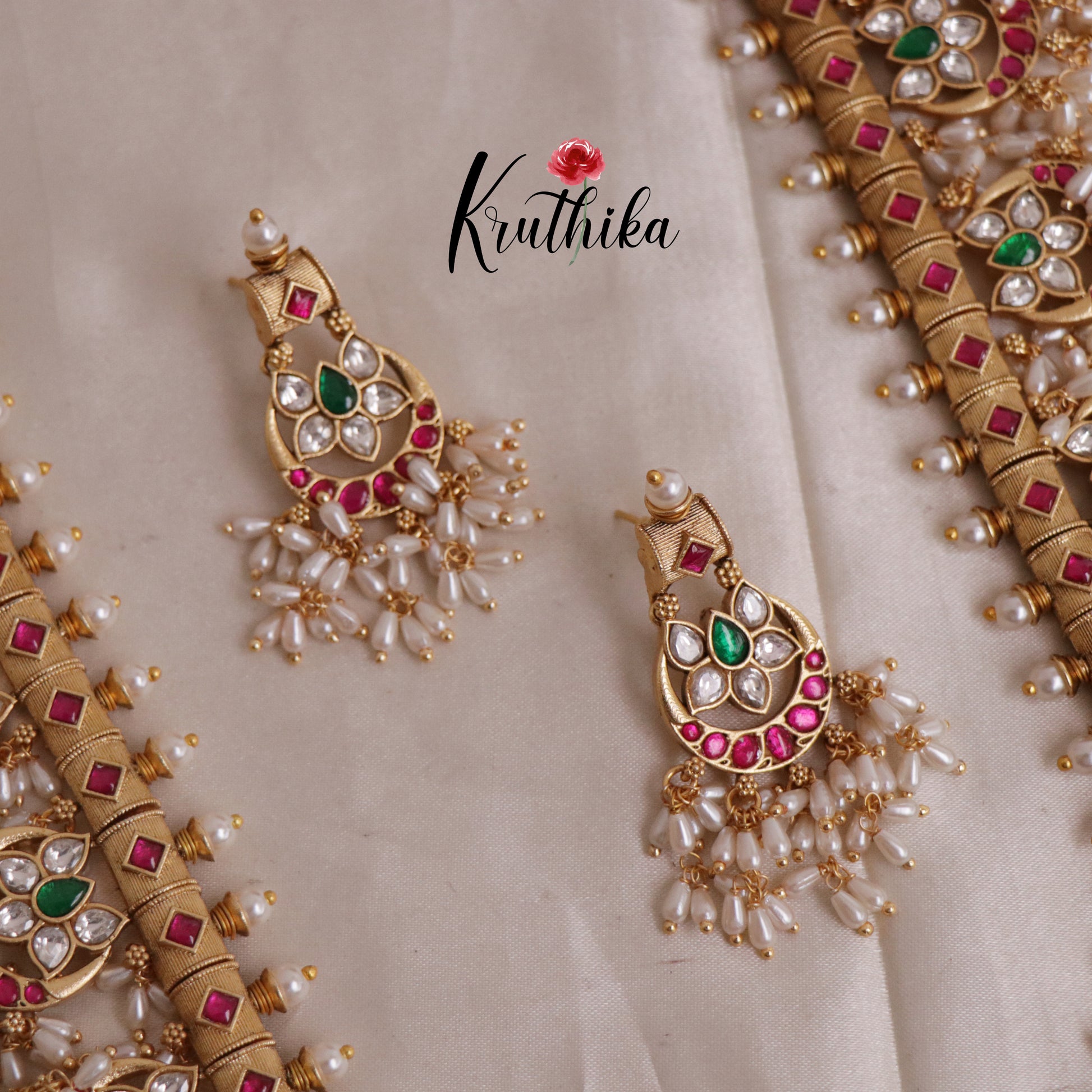 Enhance your style with our stunning, Royal Jadau Flower Haram, paired perfectly with matching earrings. Crafted with high-quality stones & beads, this set combines timeless elegance with a modern touch. Ideal for special occasions or adding a touch of glamour to your look.