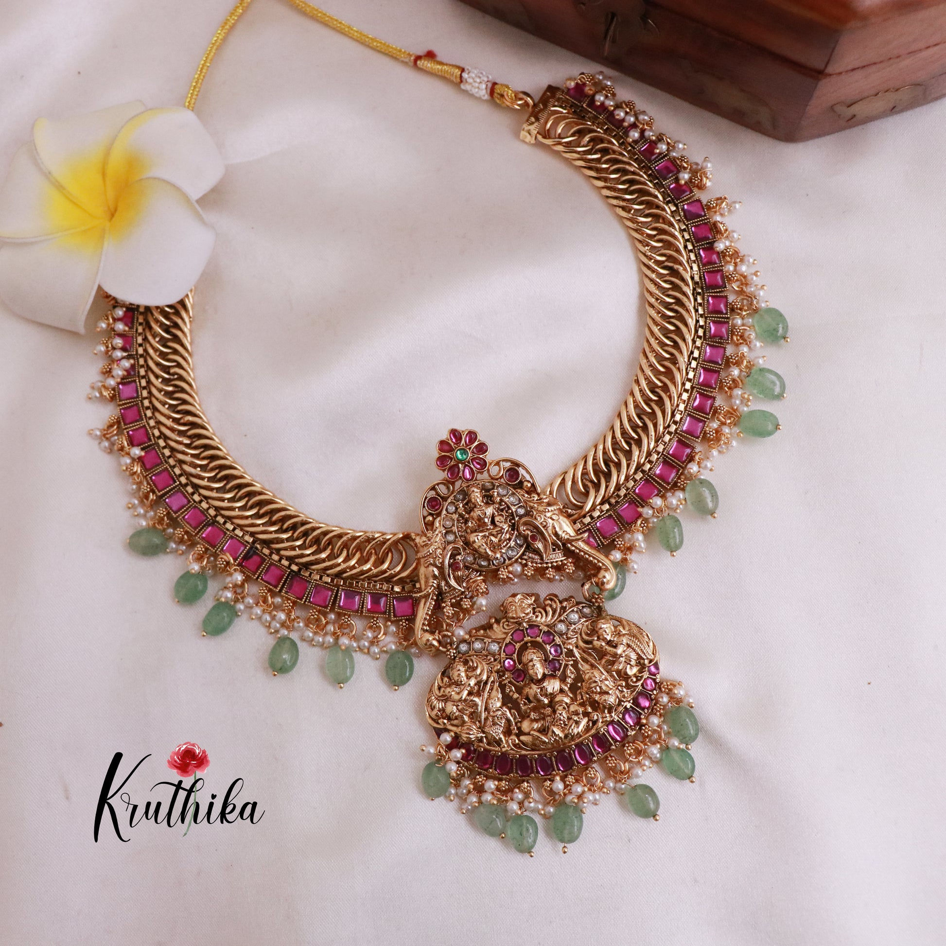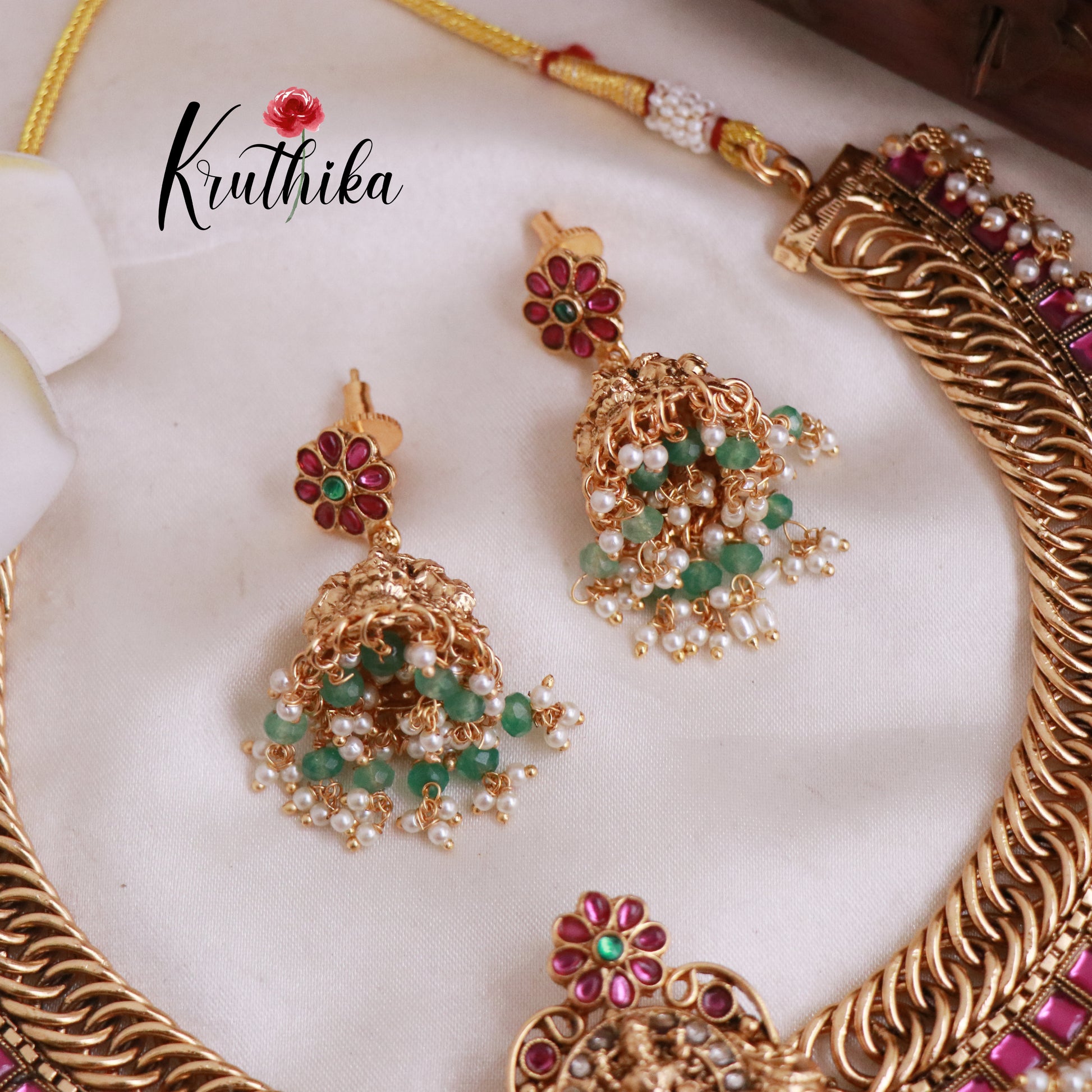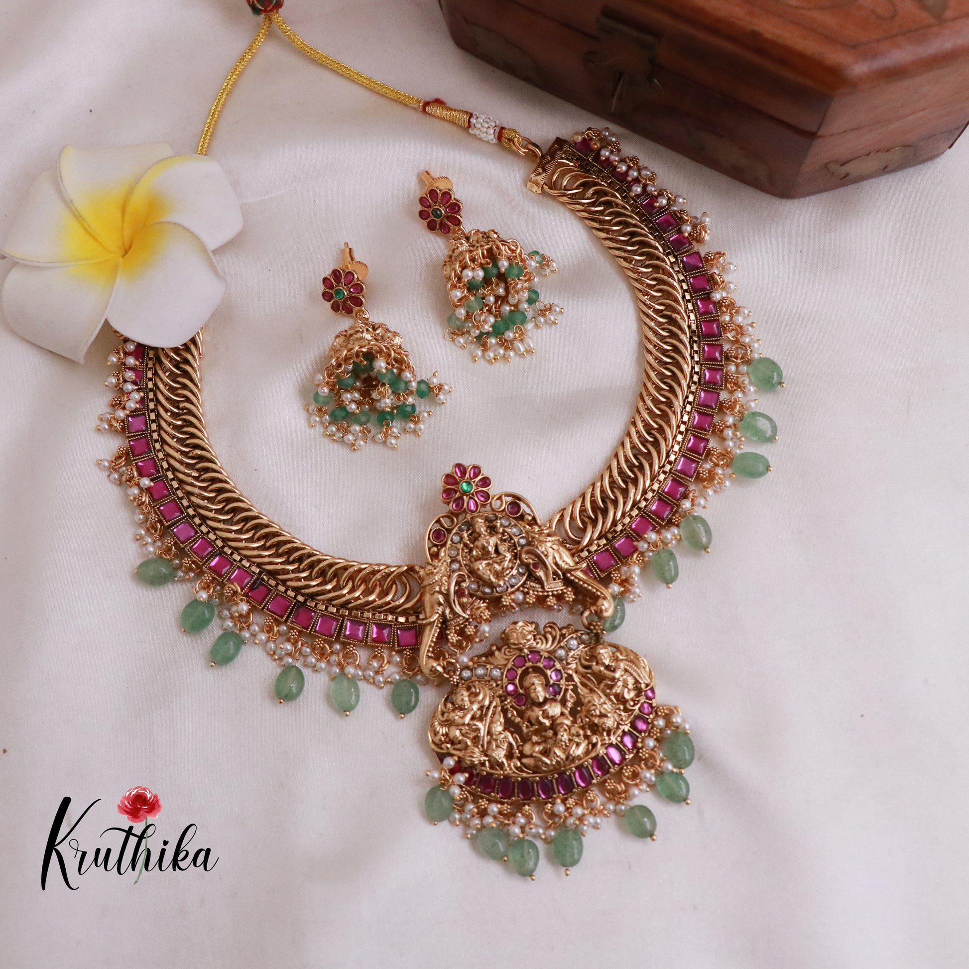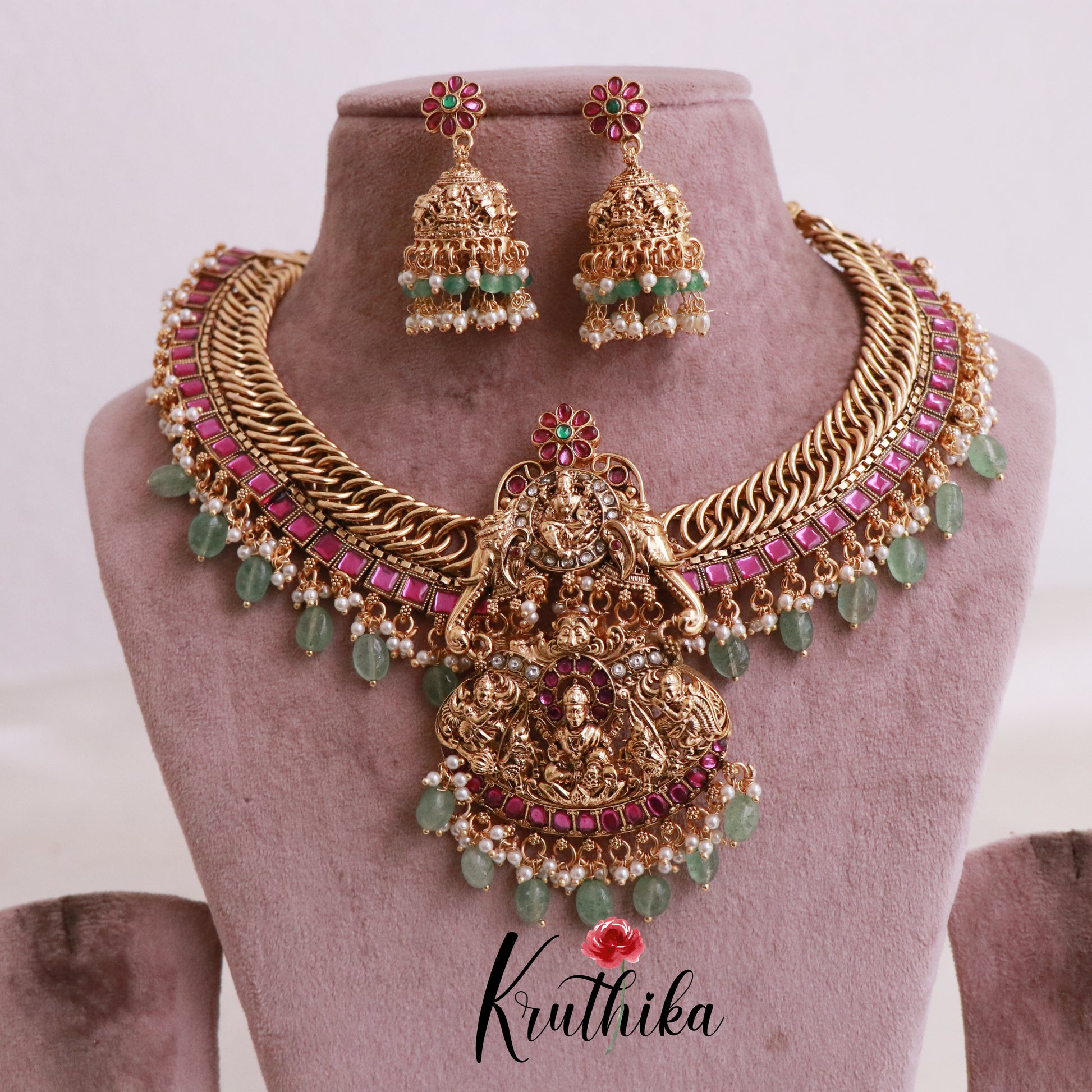 Enhance your style with our stunning, Royal Jadau Temple Jalebi style necklace with mint beads. Crafted with high-quality stones & beads, this set combines timeless elegance with a modern touch. Ideal for special occasions or adding a touch of glamour to your look.