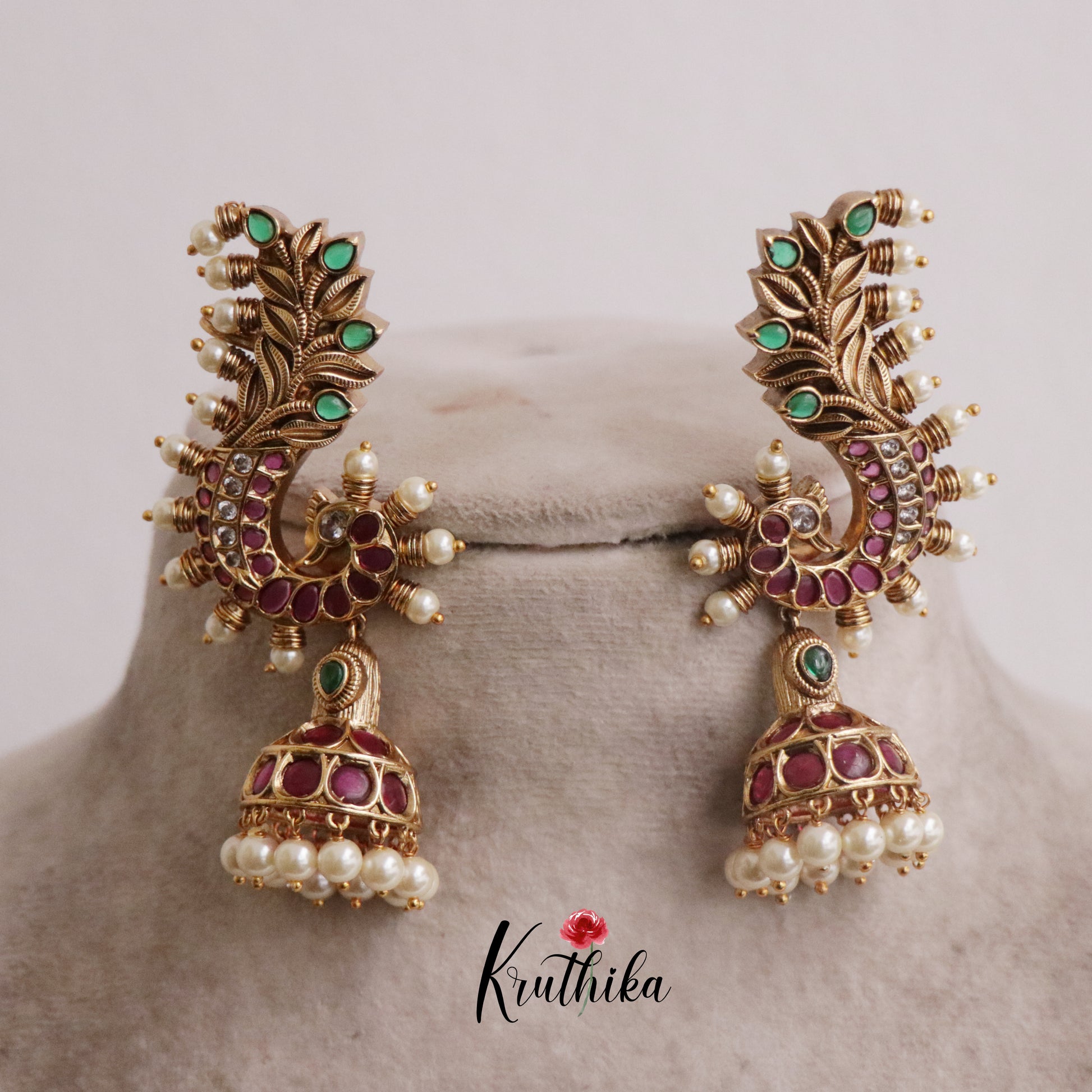 Elevate your elegance with our stunning Beautiful Kemp Mayuri Glow Ear cuff with Jhumkas designed to capture the essence of
