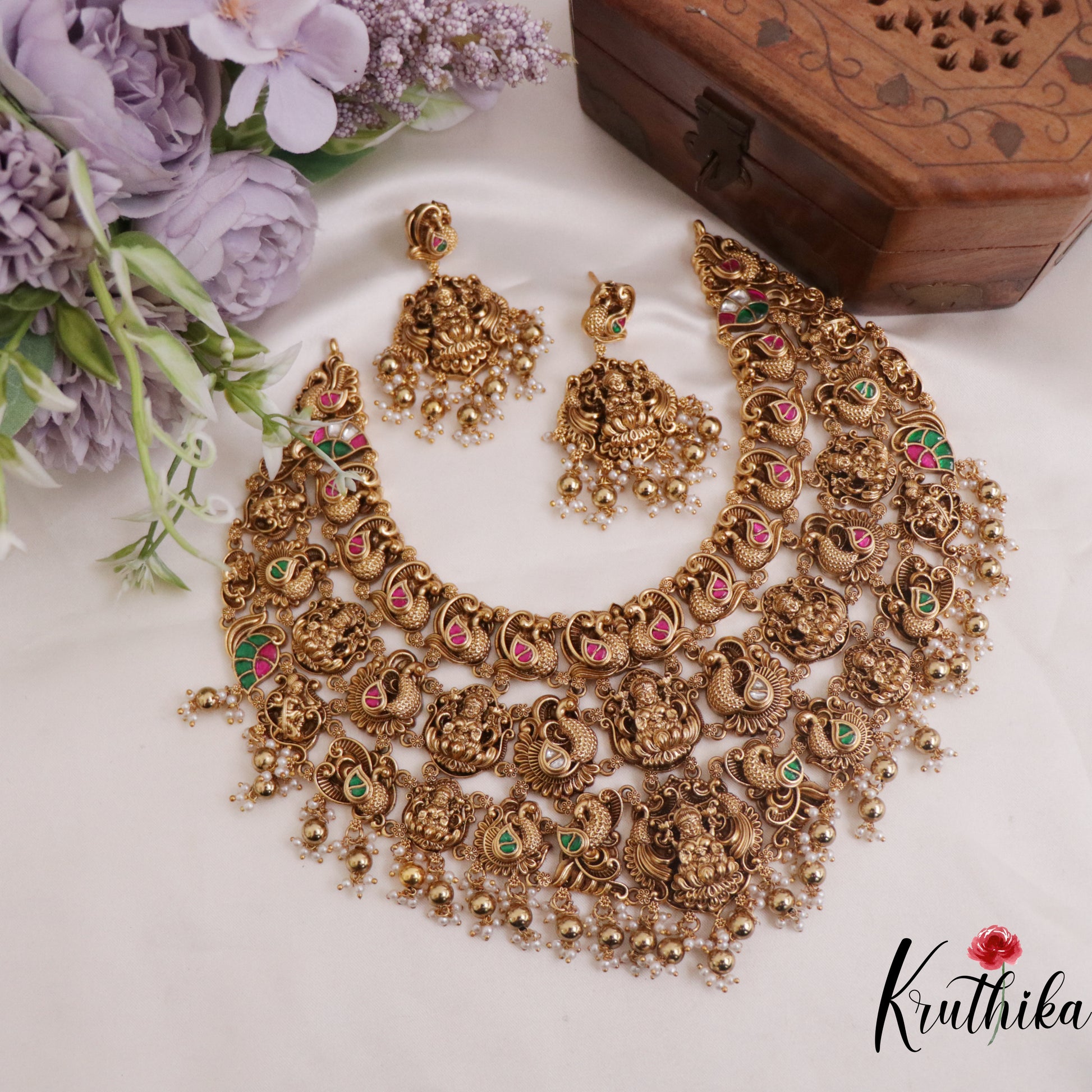 Enhance your style with our stunning, Royal Lakshmi Peacock jadau Necklace. Crafted with high-quality stones & beads, this set combines timeless elegance with a modern touch. Ideal for special occasions or adding a touch of glamour to your look.