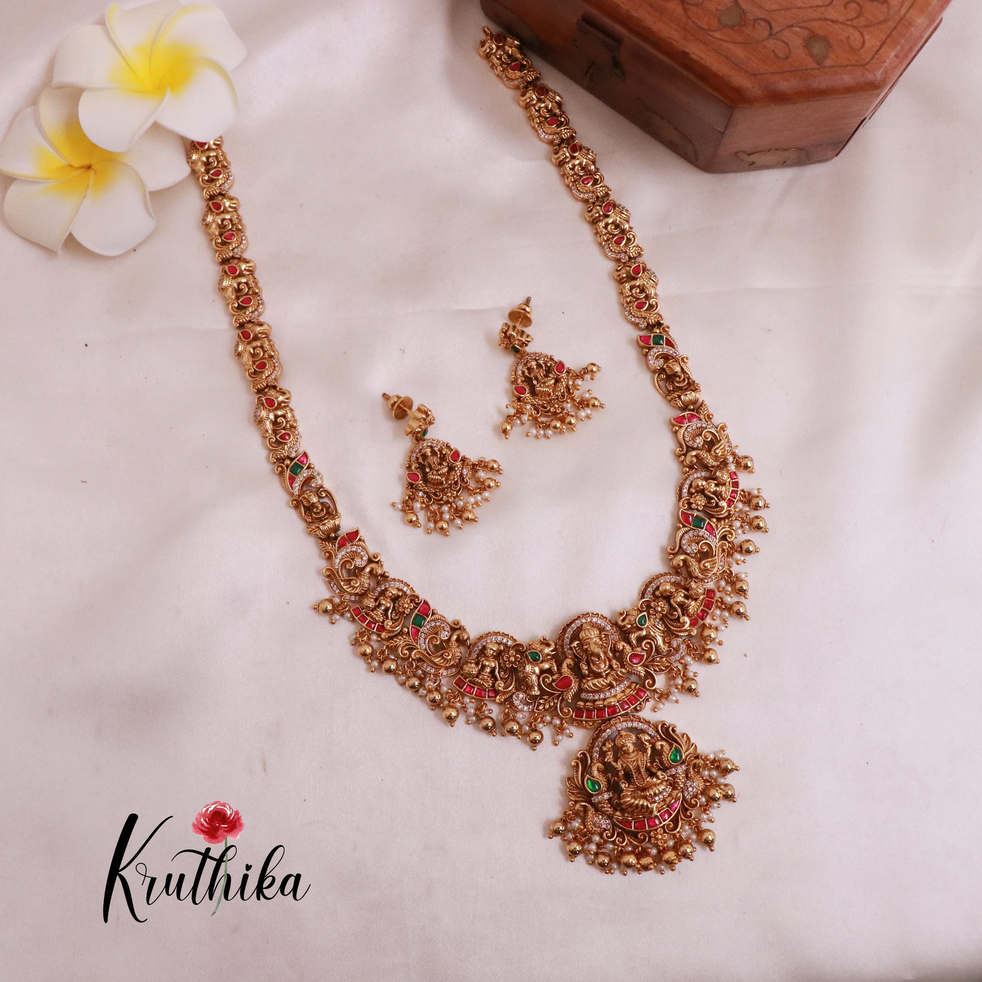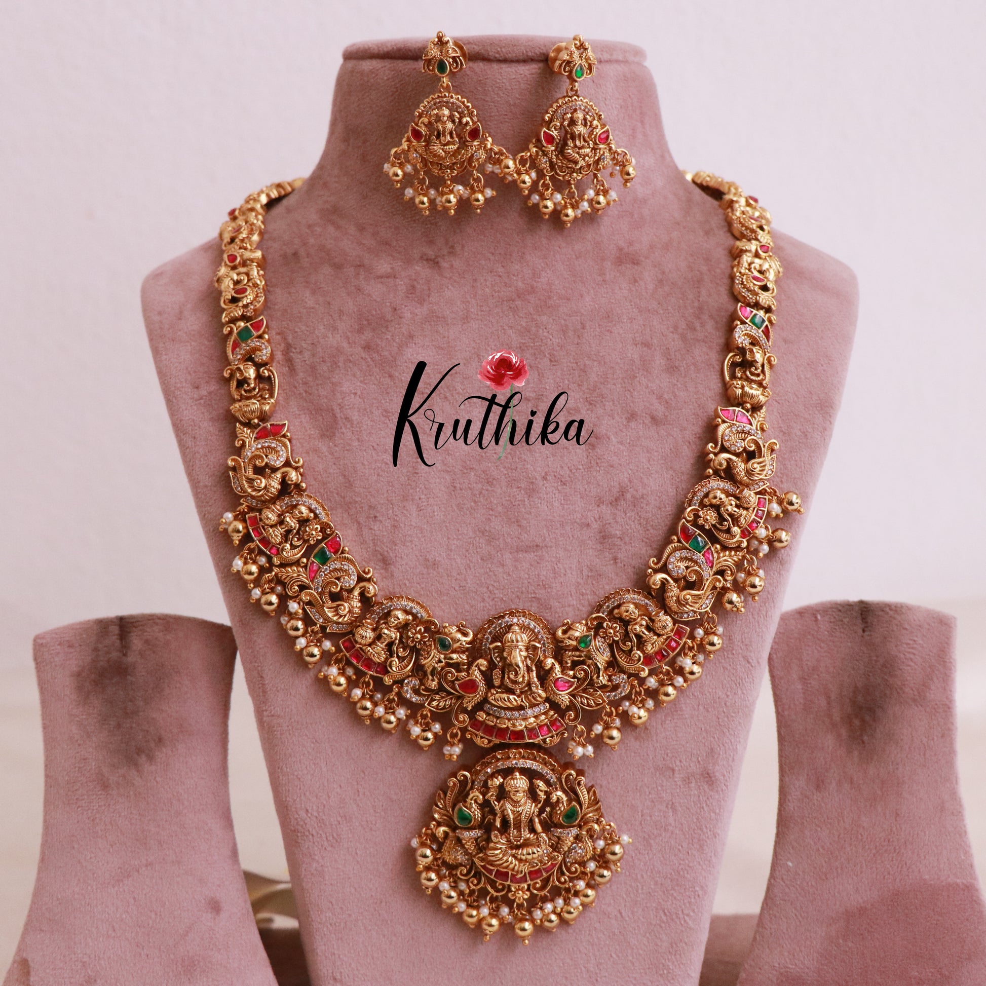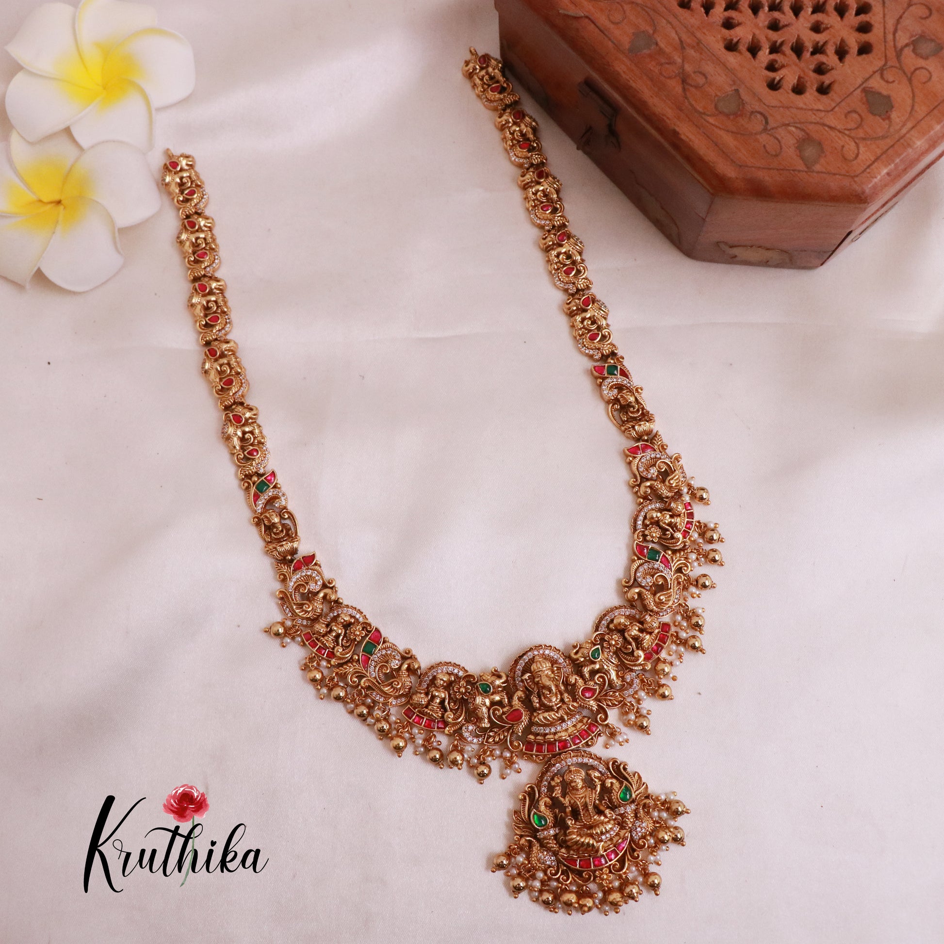 Enhance your style with our stunning, Royal Temple Jadau Haram . Crafted with high-quality stones & beads, this set combines timeless elegance with a modern touch. Ideal for special occasions or adding a touch of glamour to your look.