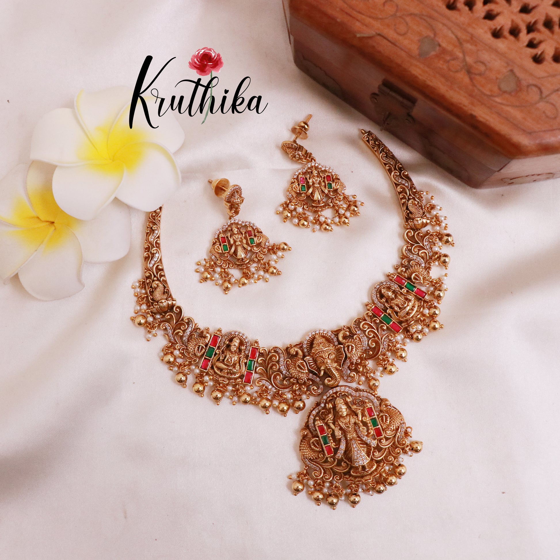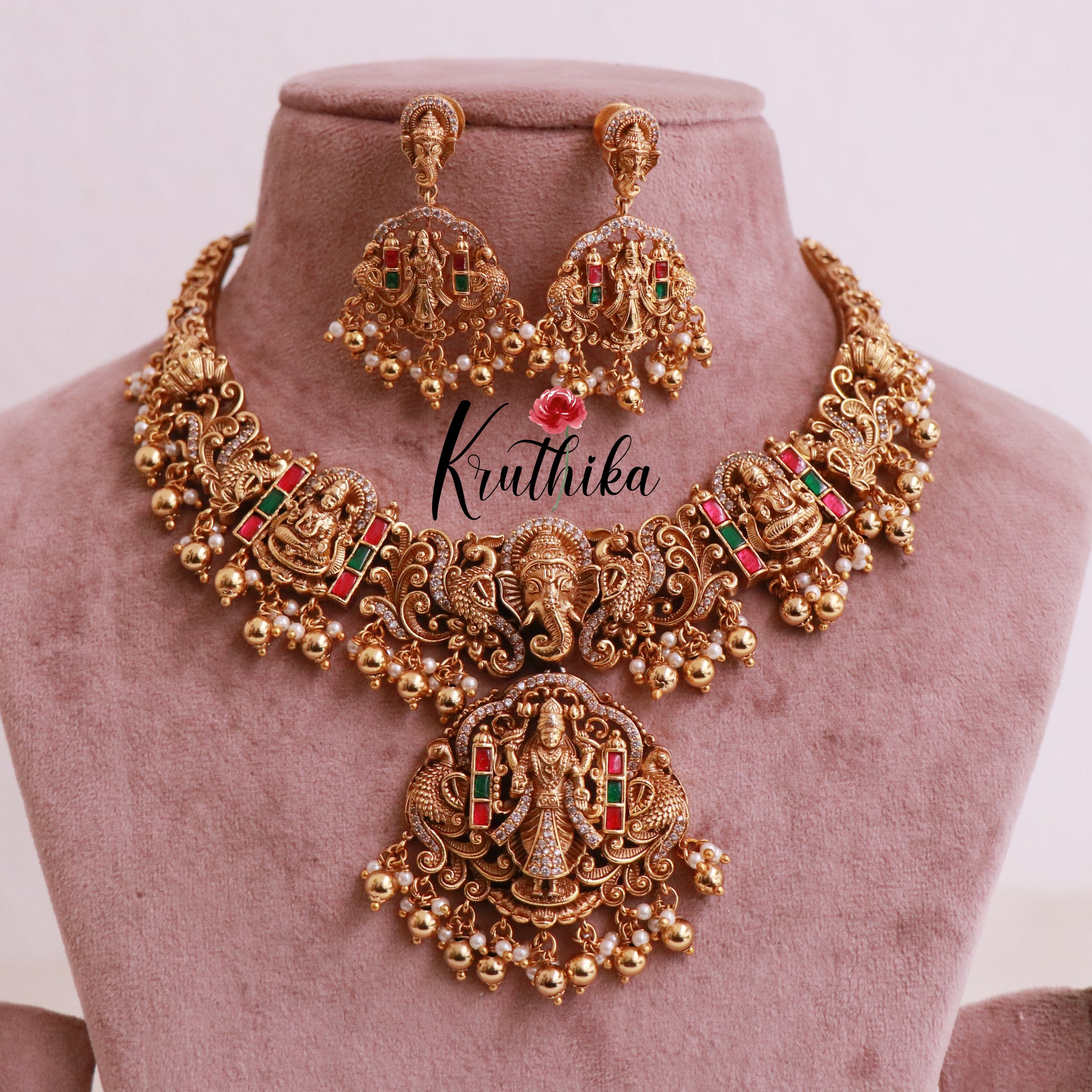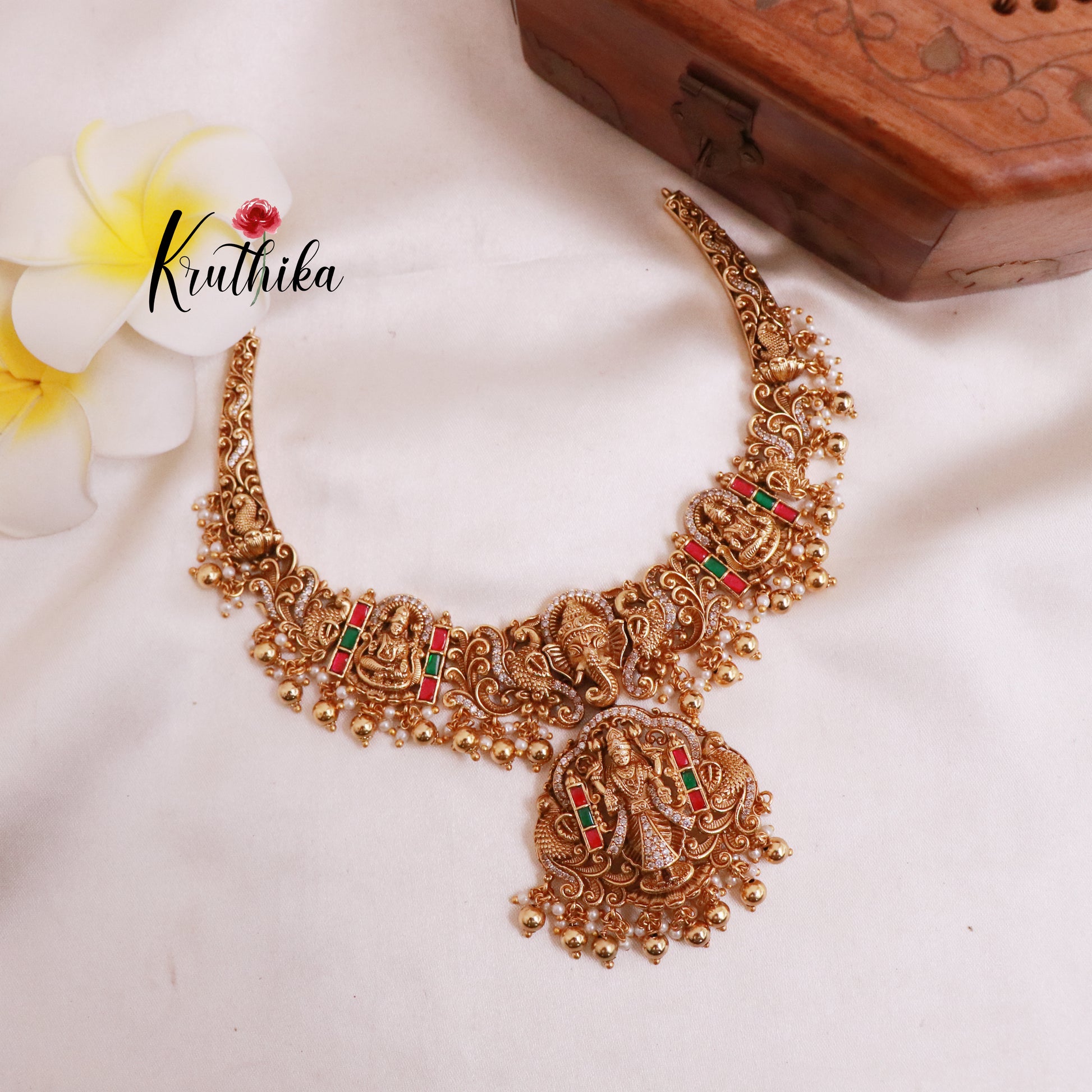 Enhance your style with our stunning ,Royal Temple Jadau Necklace . Crafted with high-quality stones & beads, this set combines timeless elegance with a modern touch. Ideal for special occasions or adding a touch of glamour to your look.