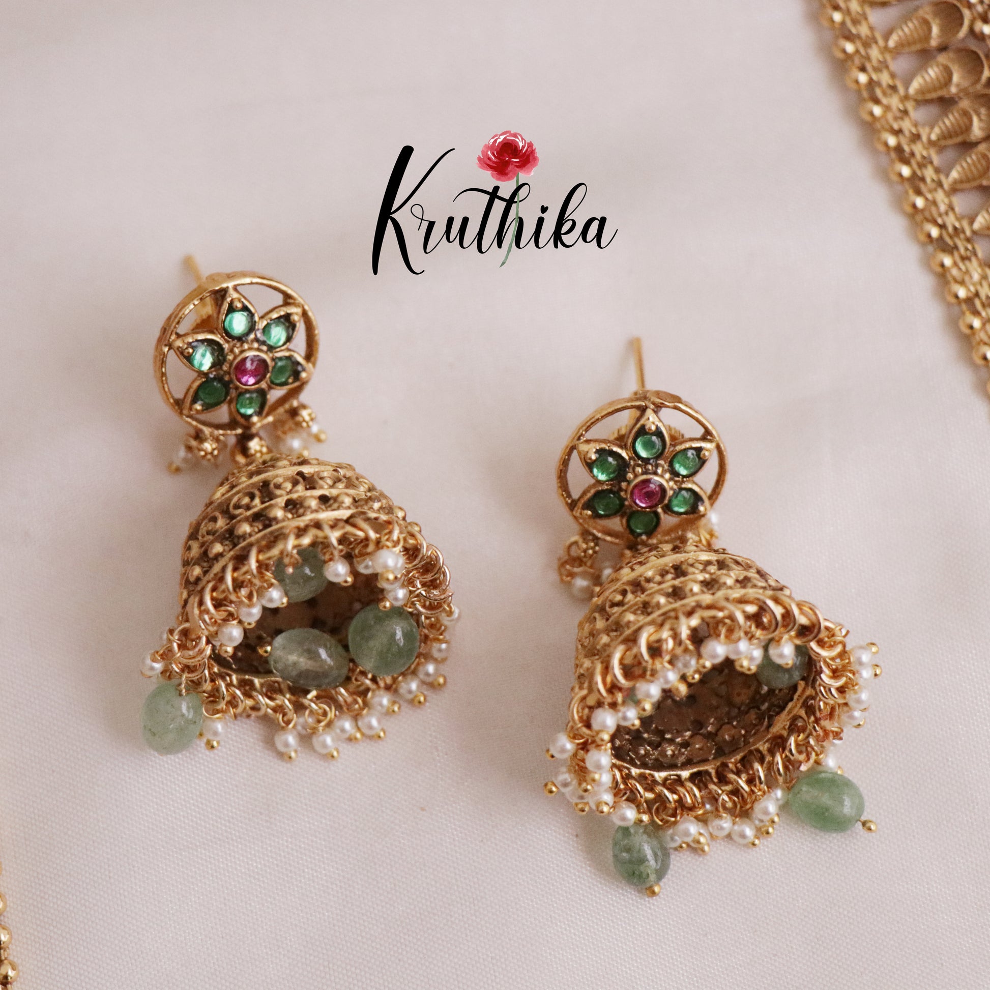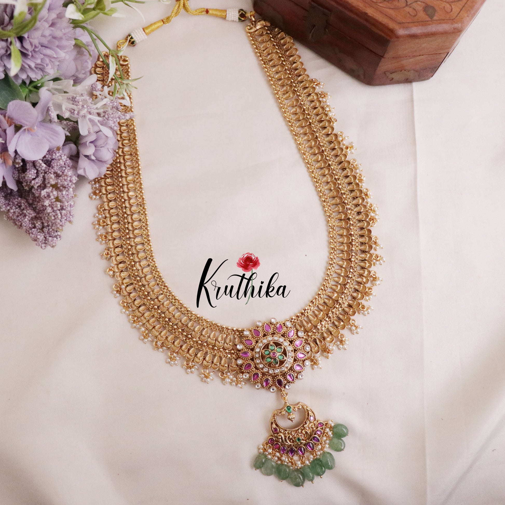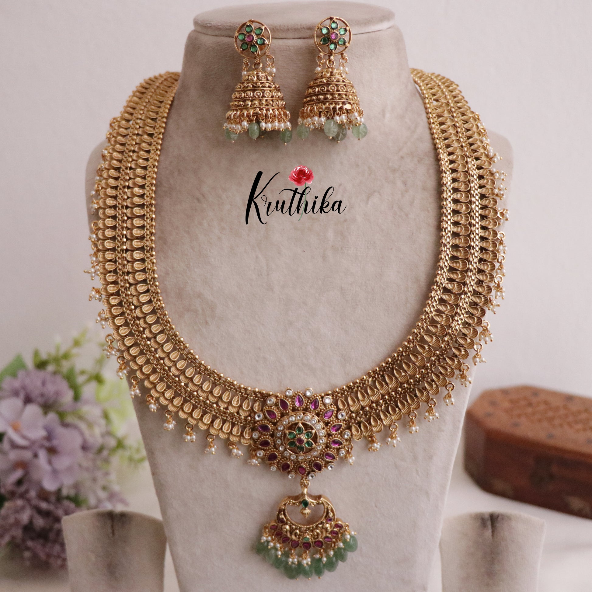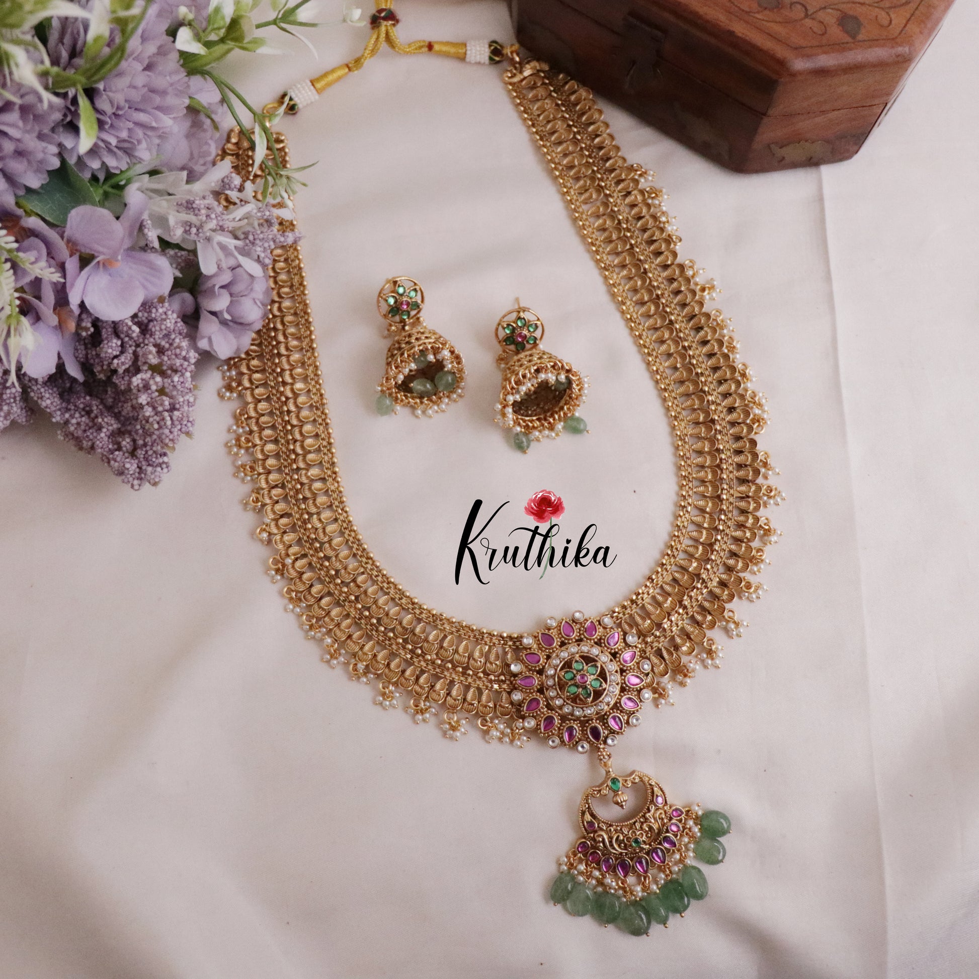 Enhance your style with our stunning, Royal Two layer No-Idol Jadau Floral Haaram with Pastel Green Drops with Pastel Green Drops Crafted with high-quality stones & beads, this set combines timeless elegance with a modern touch. Ideal for special occasions or adding a touch of glamour to your look.