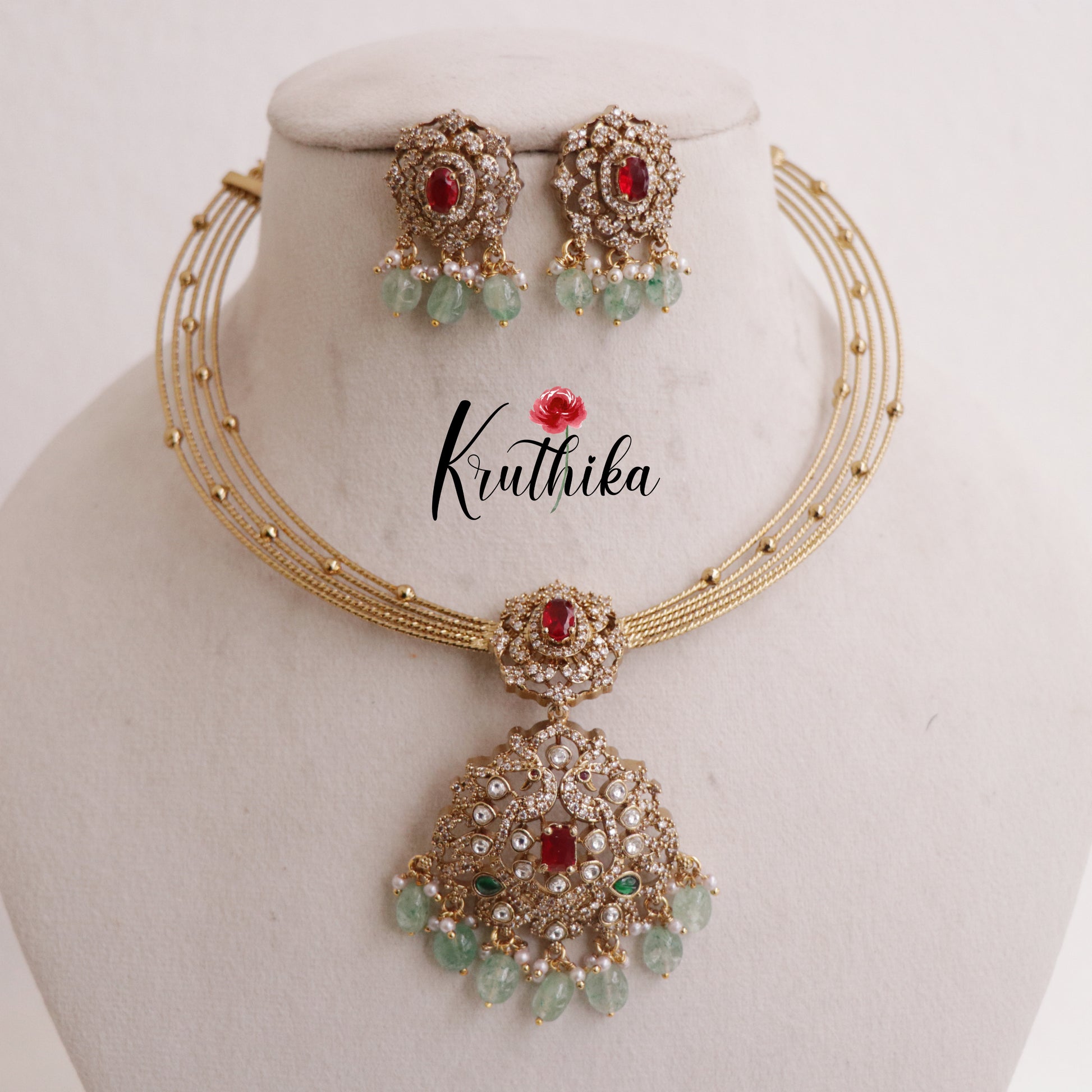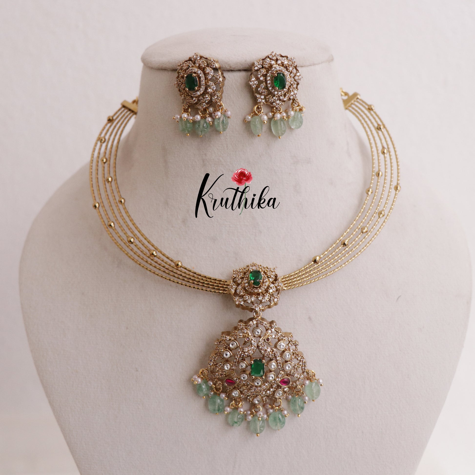 Enhance your style with our stunning Simple AD Victorian Jadau Peacock Hasli Necklace with Beads Drops paired perfectly with matching earrings. Crafted with high-quality stones & beads, this set combines timeless elegance with a modern touch. Ideal for special occasions or adding a touch of glamour to your look.
