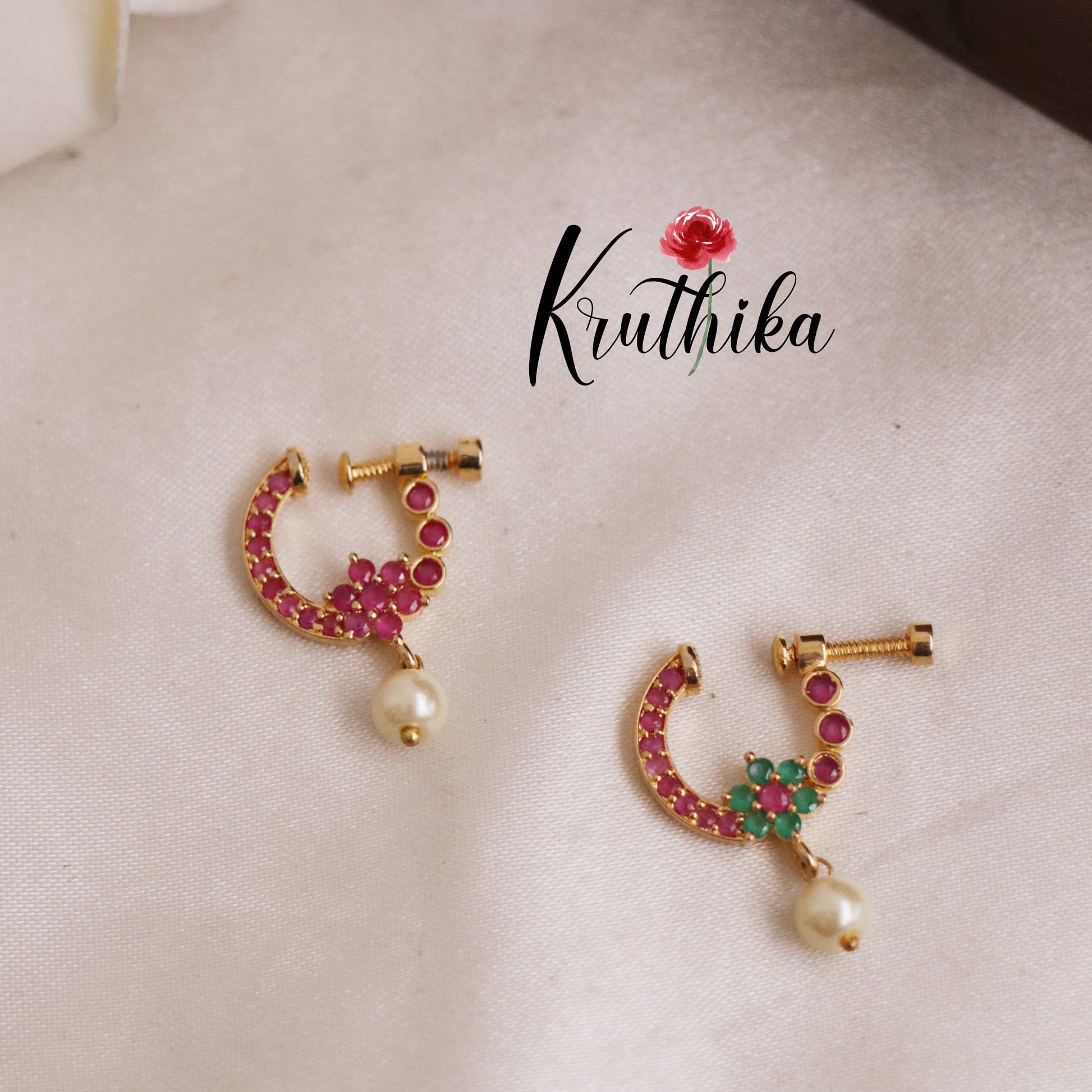 A traditional nose ring, or Nath, with a screw design combines cultural elegance with contemporary convenience. Crafted from high-quality metal, it features intricate detailing, often adorned with CZ stones or filigree patterns. The screw mechanism ensures a secure fit, making it easy to wear while adding a timeless charm to any look. Perfect for festive occasions or everyday elegance, this piece embodies tradition and style.