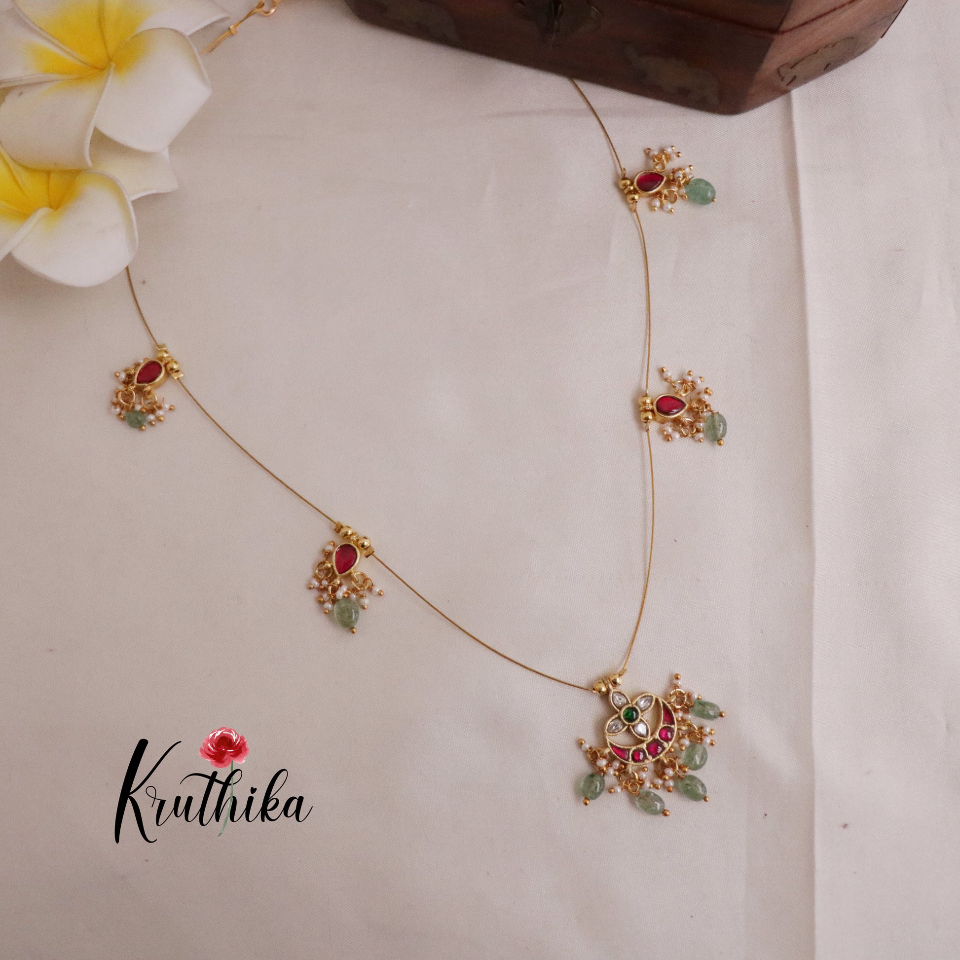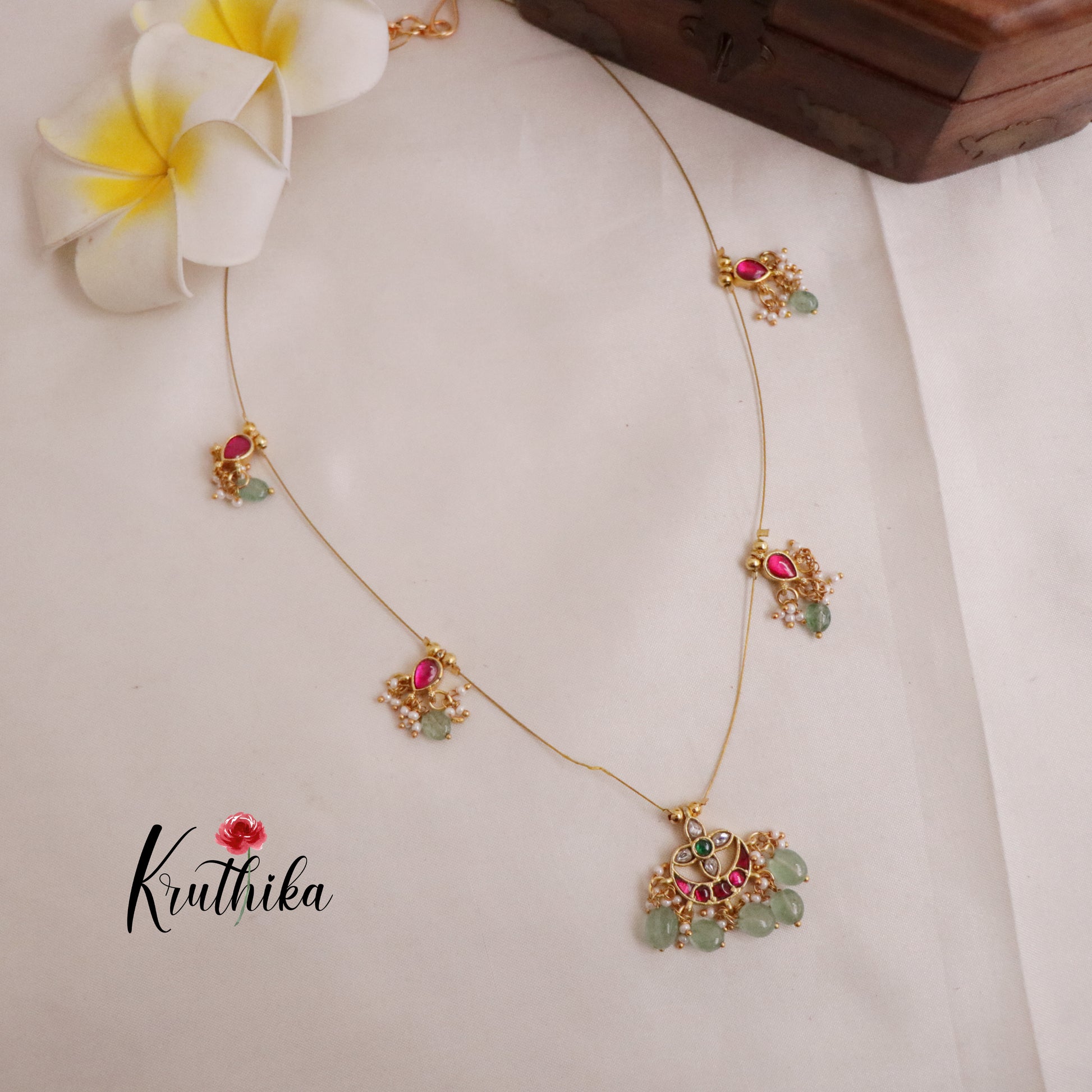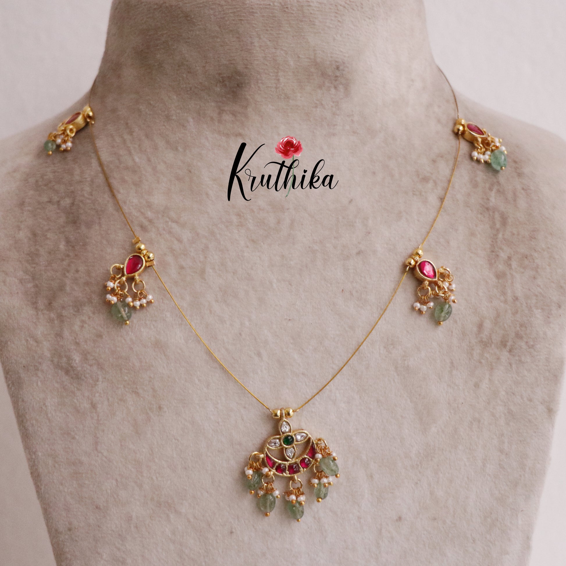 Enhance your style with our stunning, Simple Jadau Pendant Invisible Chain with Pastel Green Beads paired perfectly with matching earrings. Crafted with high-quality stones & beads, this set combines timeless elegance with a modern touch. Ideal for special occasions or adding a touch of glamour to your look.