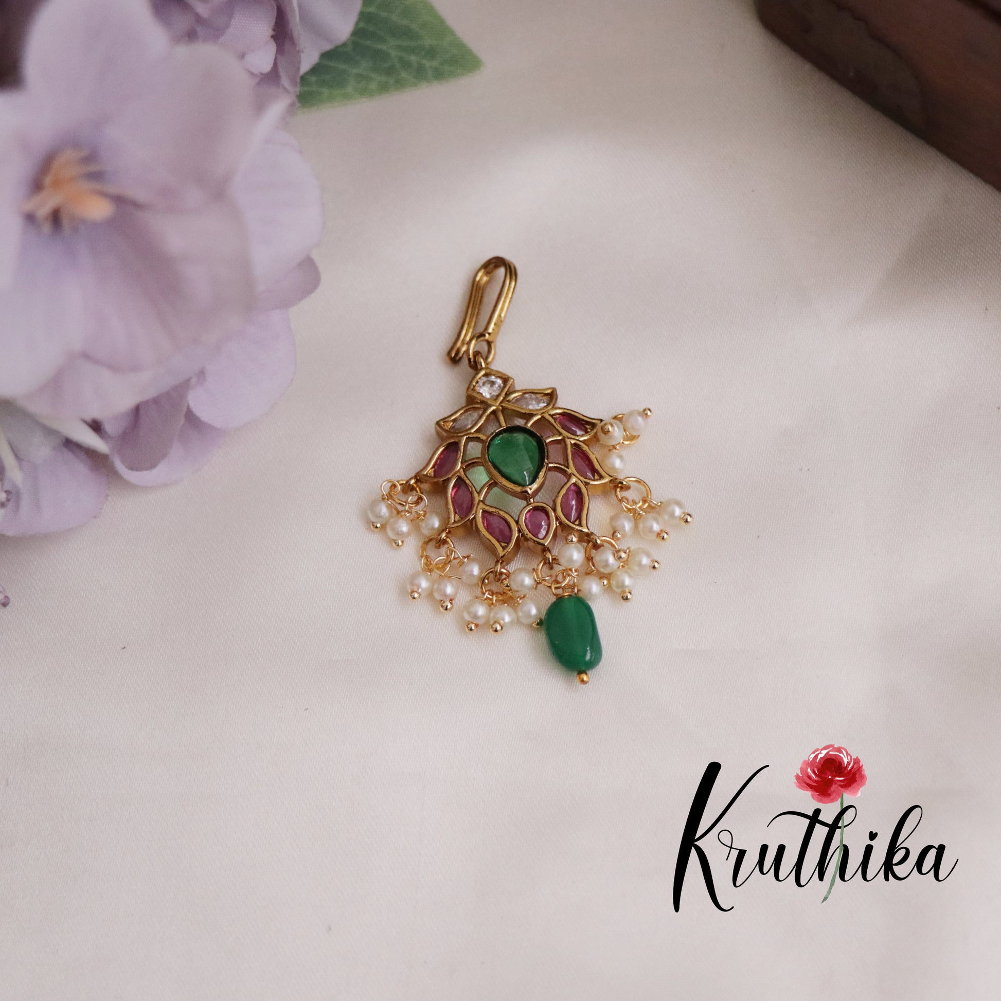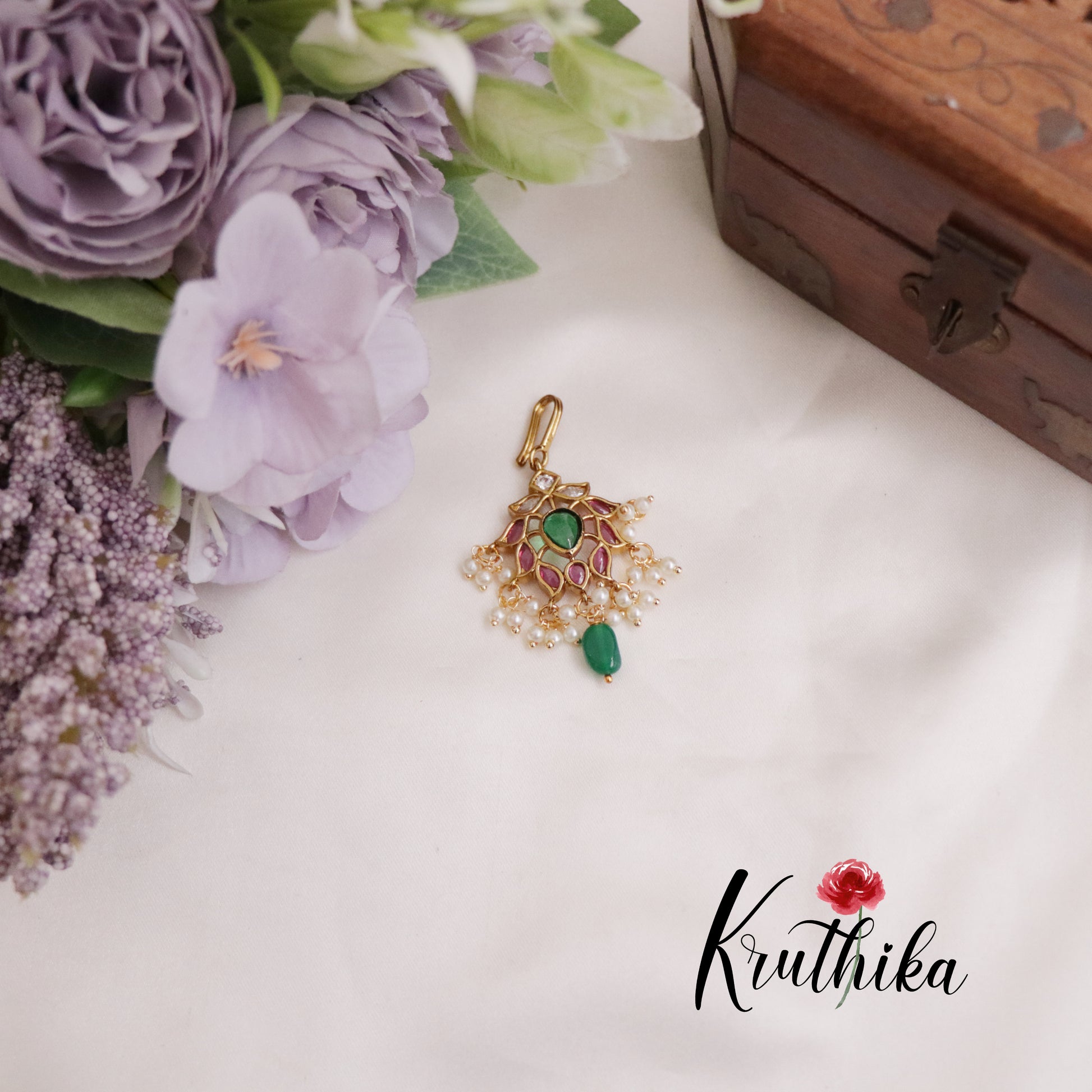 Enhance your style with our stunning Simple Kemp Lotus Maang Tikka Crafted with high-quality stones & beads, this set combines timeless elegance with a modern touch. Ideal for special occasions or adding a touch of glamour to your look.