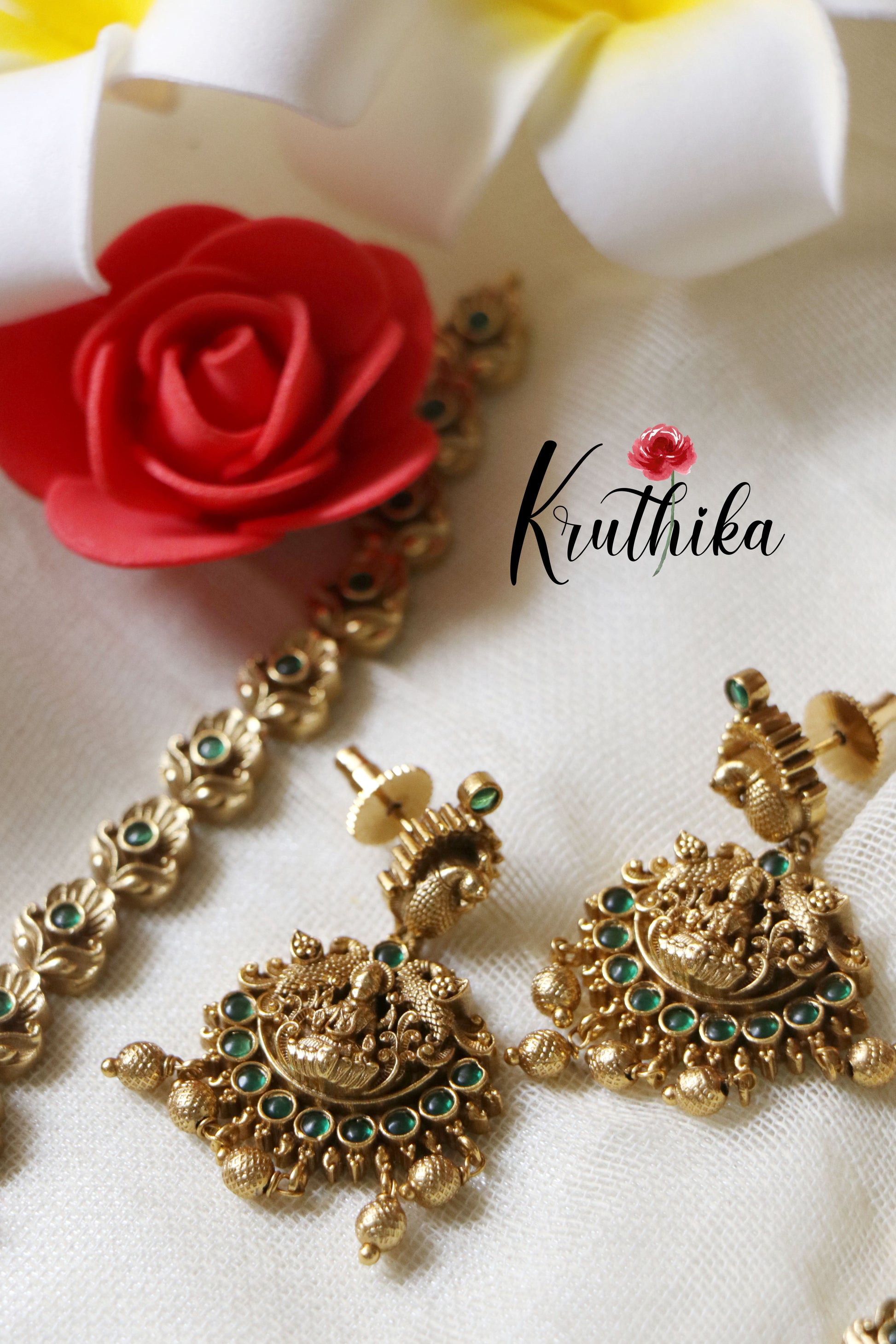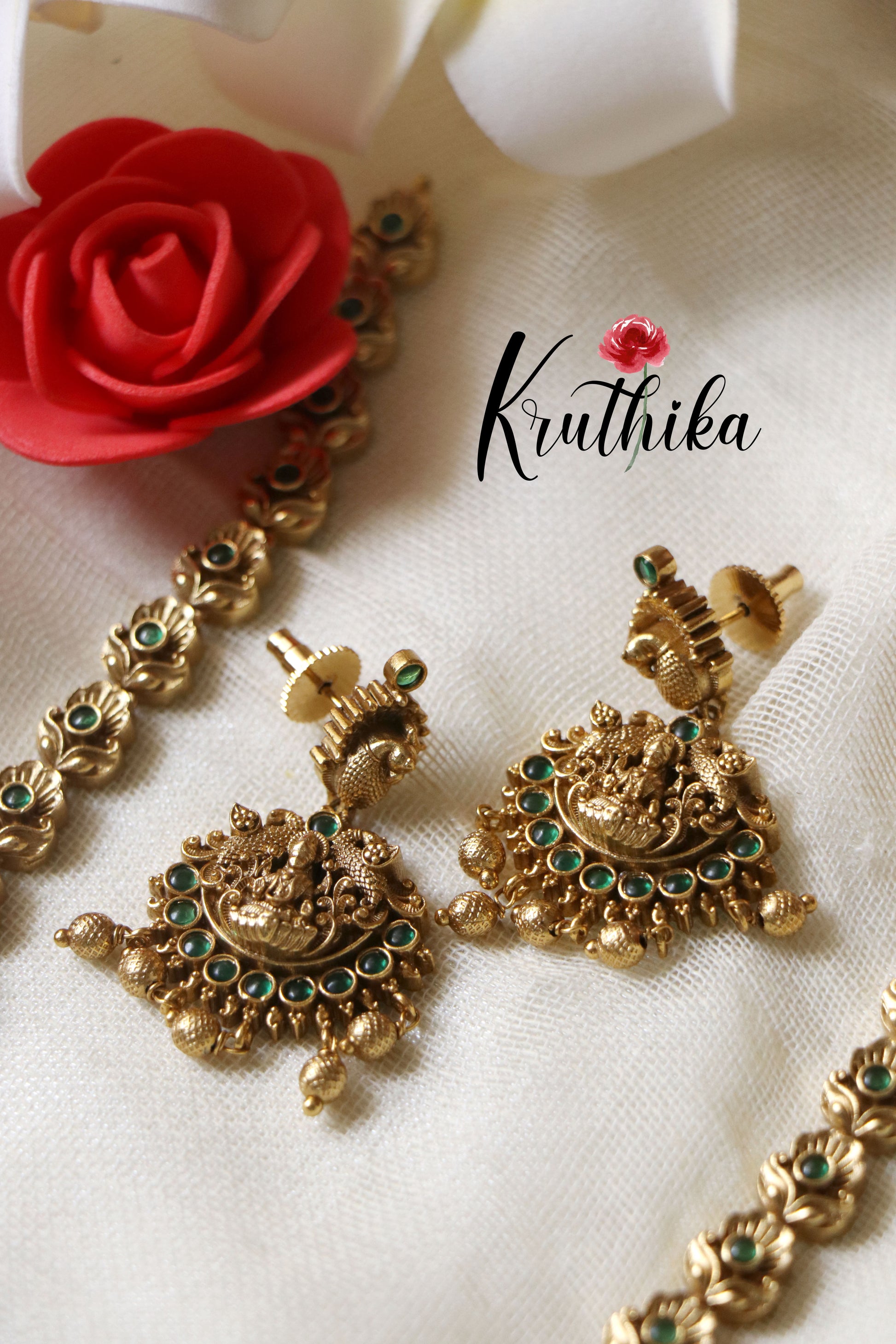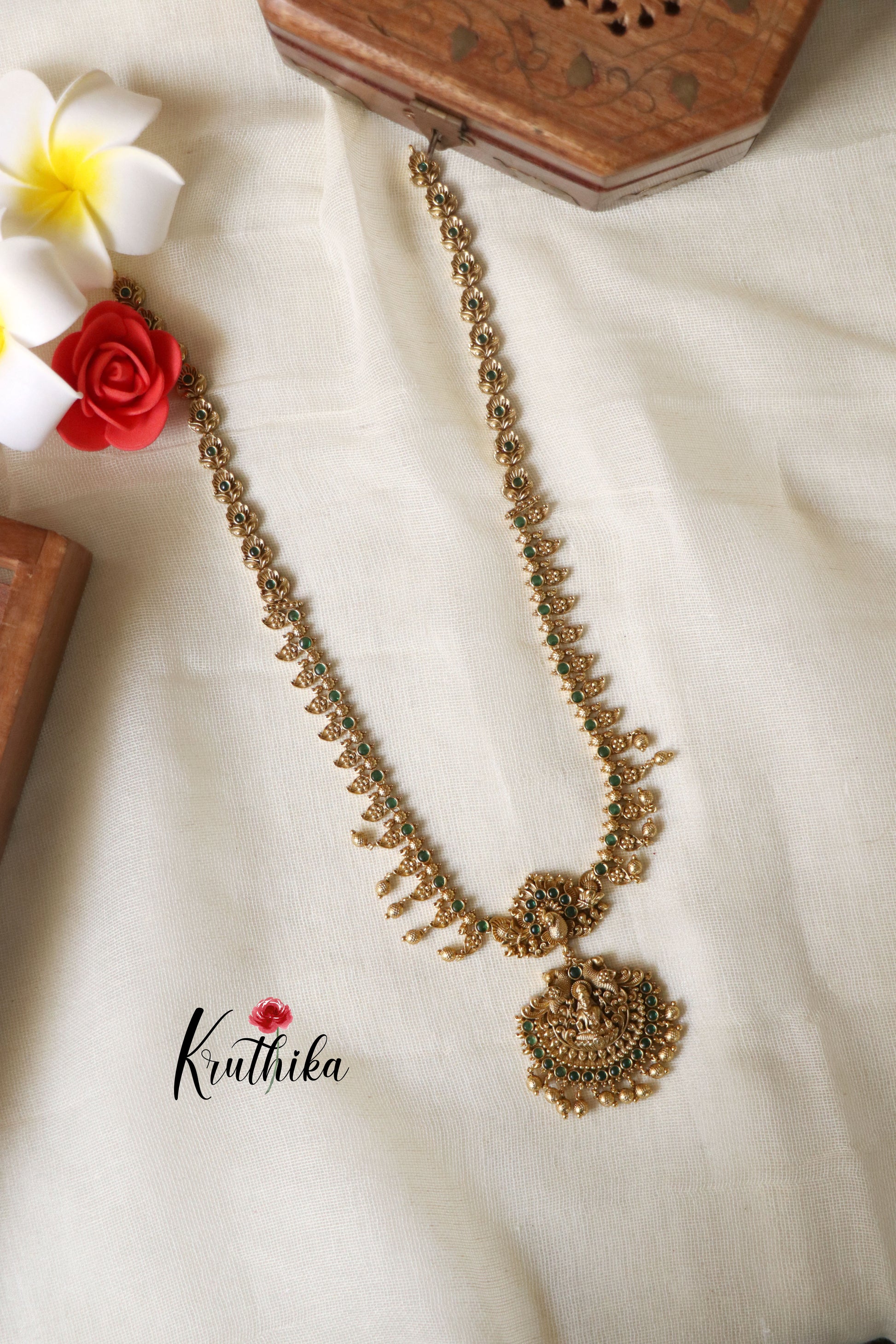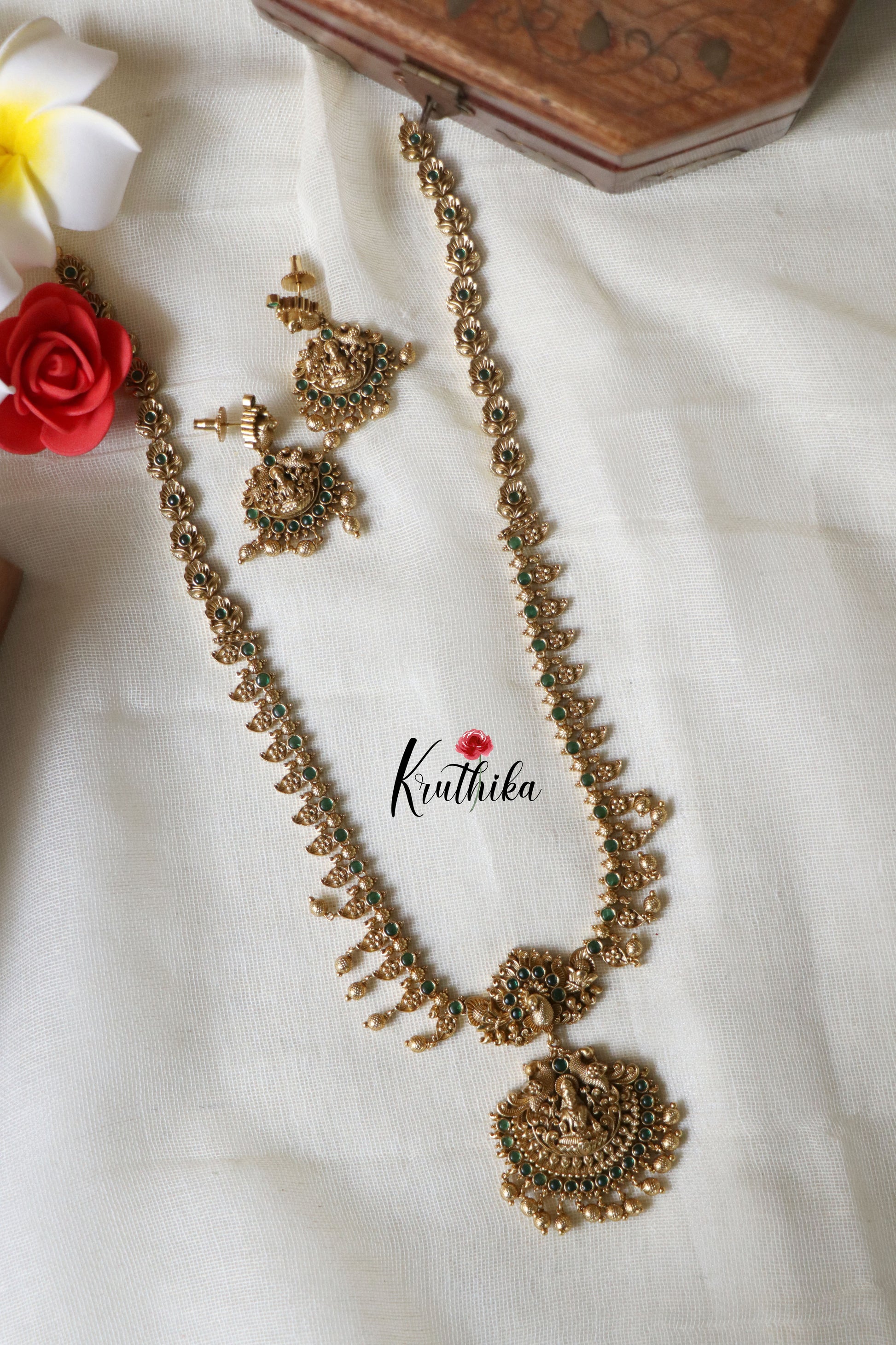 Enhance your style with our stunning Simple Lakshmi Peacock Emerald Haaram, paired perfectly with matching earrings. Crafted with high-quality stones & beads, this set combines timeless elegance with a modern touch. Ideal for special occasions or adding a touch of glamour to your look.