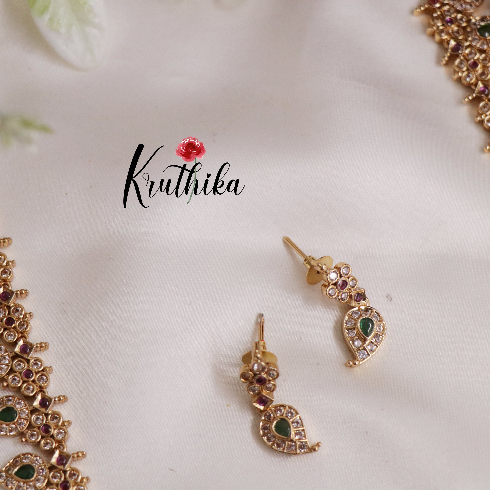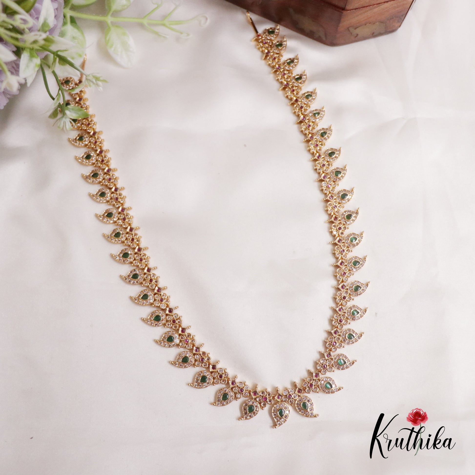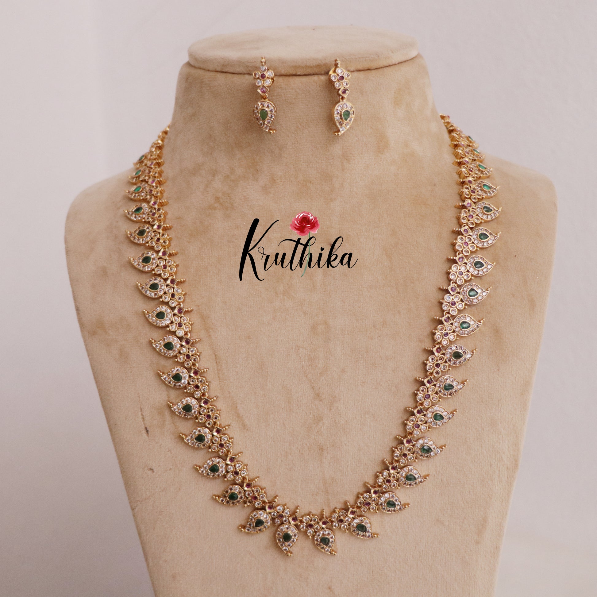 Enhance your style with our stunning Simple Mango Design Haaram , paired perfectly with matching earrings. Crafted with high-quality stones & beads, this set combines timeless elegance with a modern touch. Ideal for special occasions or adding a touch of glamour to your look.