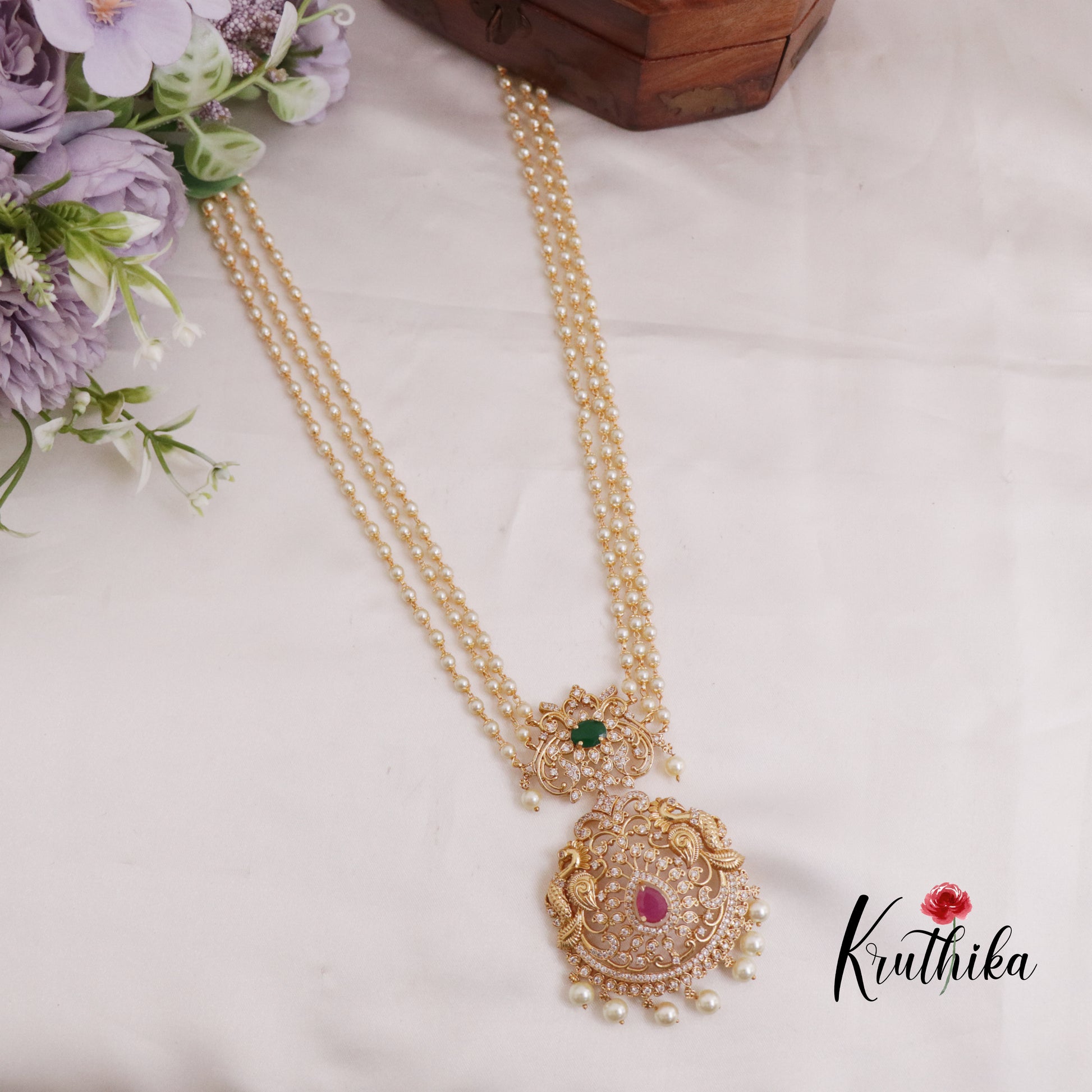 Enhance your style with our stunning Simple Three Layer Pearl Haaram with Floral Peacock Pendant paired perfectly with matching earrings. Crafted with high-quality stones & beads, this set combines timeless elegance with a modern touch. Ideal for special occasions or adding a touch of glamour to your look.