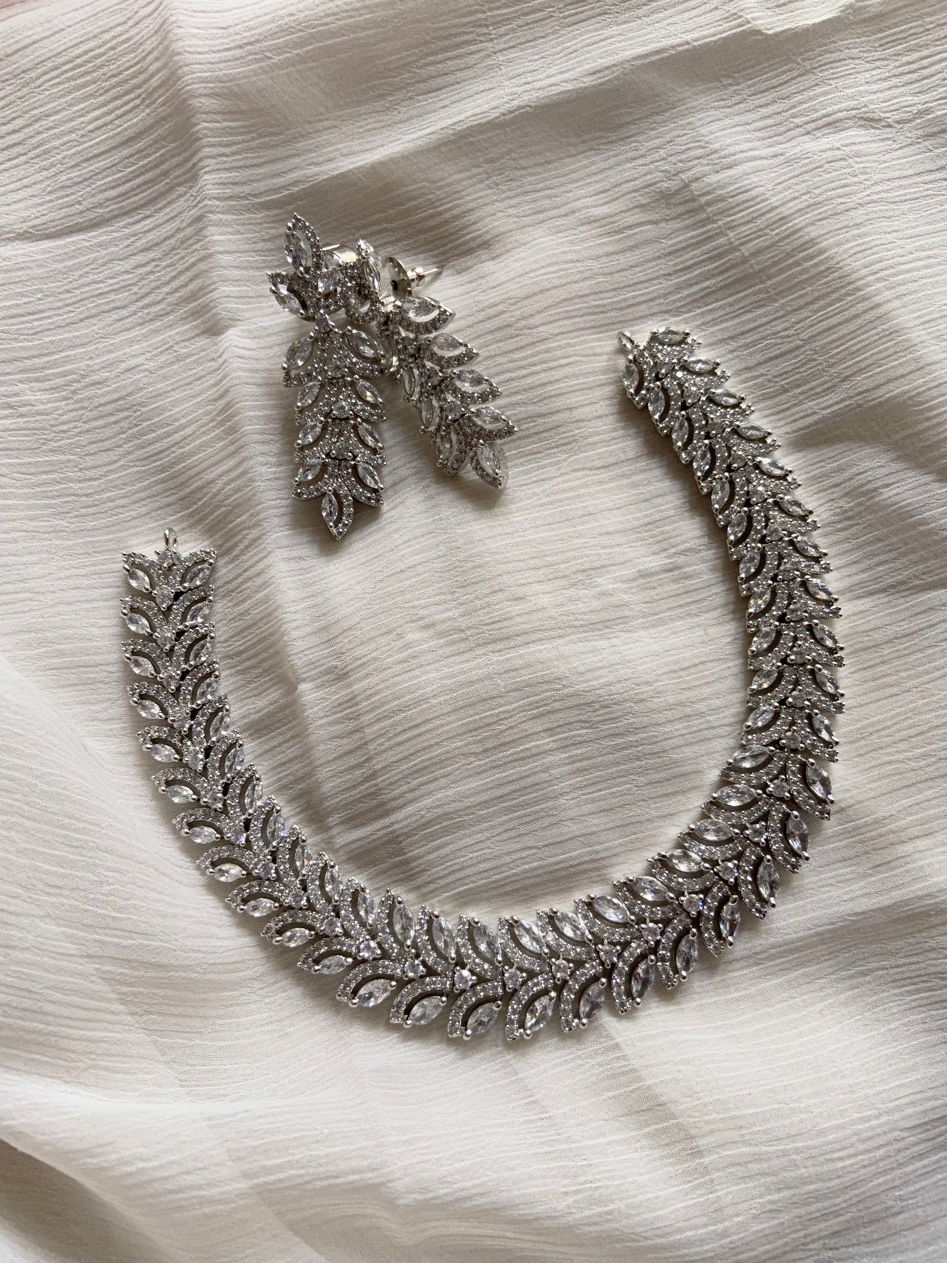 Enhance your style with our stunning Statement AD Platinum finish Necklace, paired perfectly with matching earrings. Crafted with high-quality stones & beads, this set combines timeless elegance with a modern touch. Ideal for special occasions or adding a touch of glamour to your look.