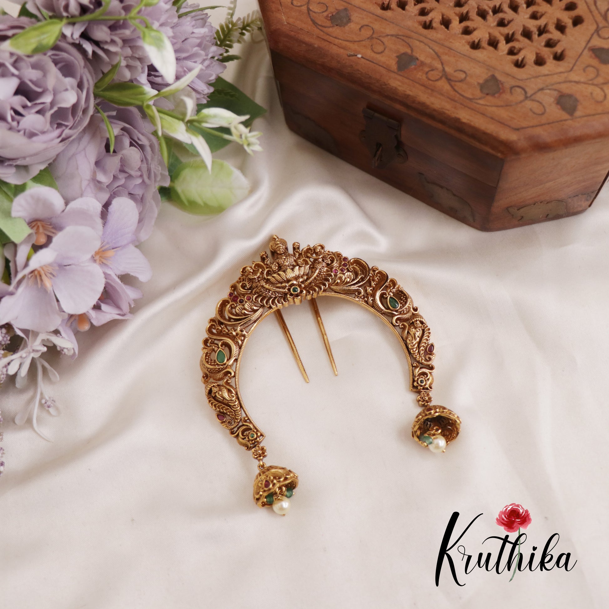This traditional Temple style Jada Billa is a stunning piece of traditional South Indian bridal hair jewelry. Crafted with an antique gold tone finish, it features a prominent central motif of Lakshmi seated on a lotus, symbolising prosperity and grace. The crescent shaped frame is intricately detailed with floral engravings and classic peacock artistry, accented by vibrant green and red stones. To complete its regal look, the piece is finished with hanging Jhumka droplets and delicate white pearls, making it a perfect accessory for weddings, festivals and Bharatanatyam performances.